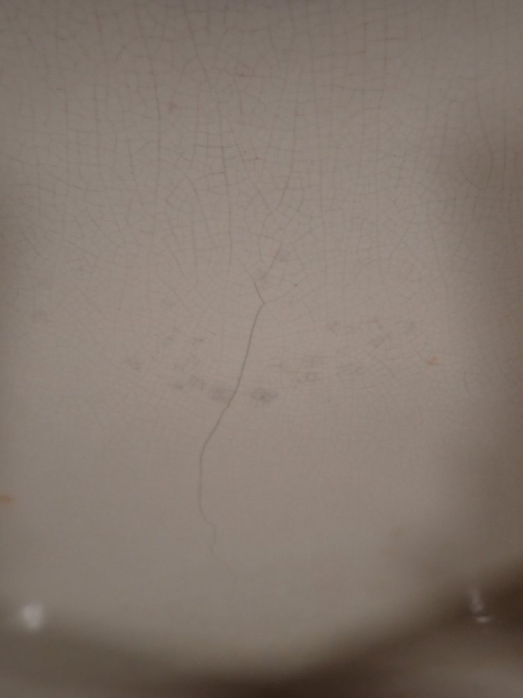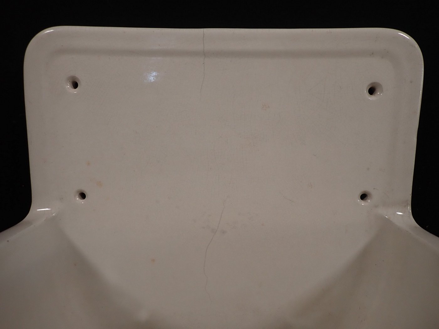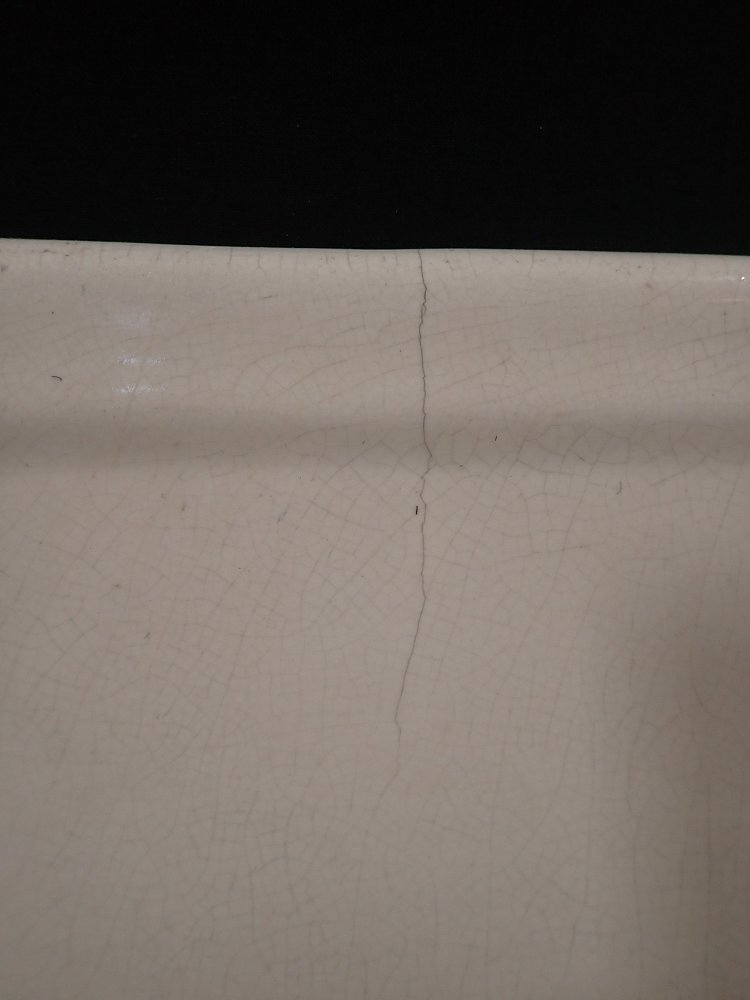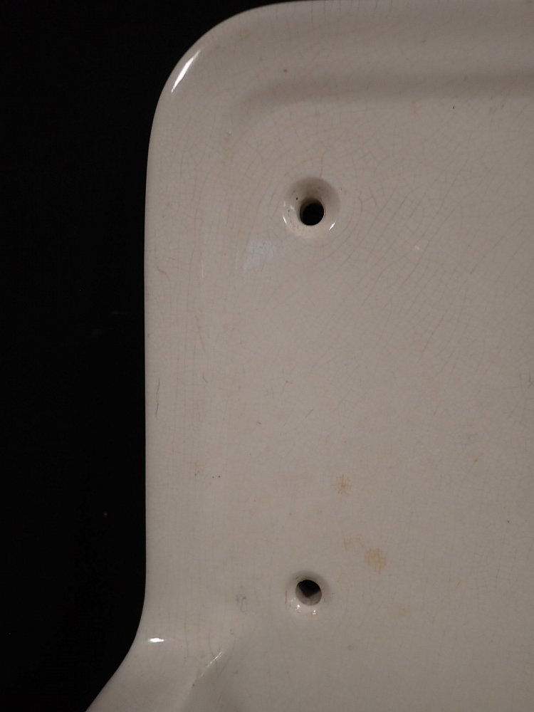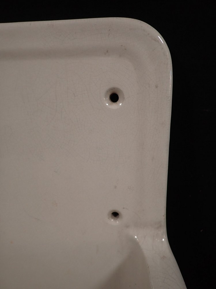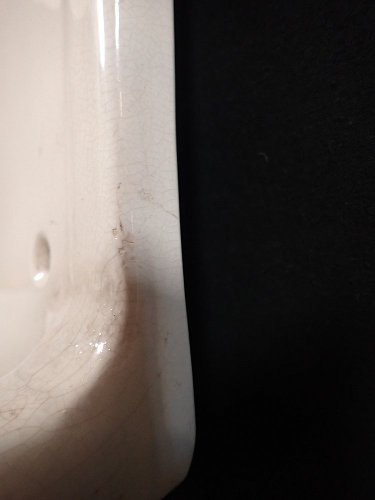 DetailansichtKeramikwaschbecken mit integrierten Seifenschalen. Ein Stempel auf der Rückseite verrät das Produktionsdatum - 12. Mai 1936. Bei diesem Alter kann man über die...