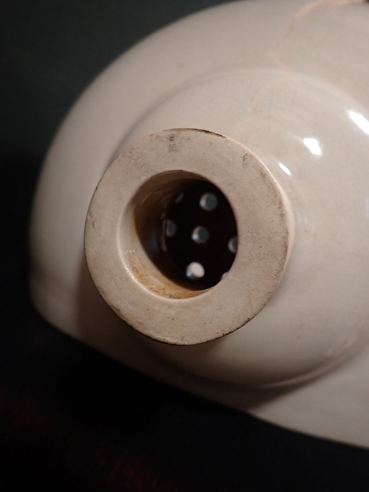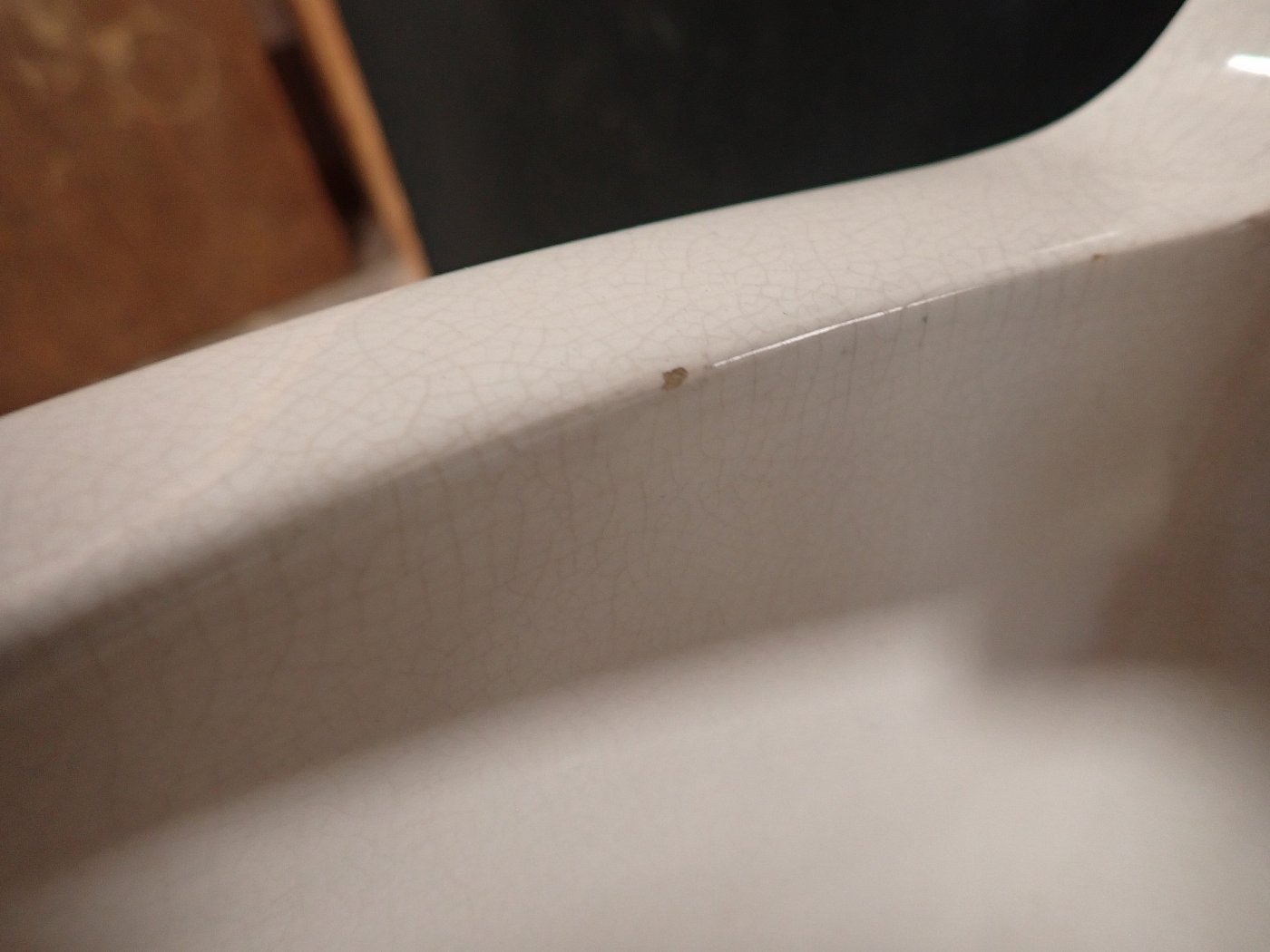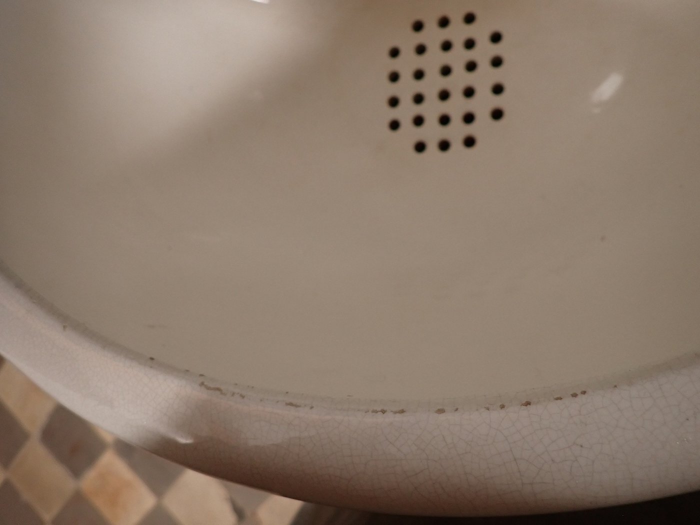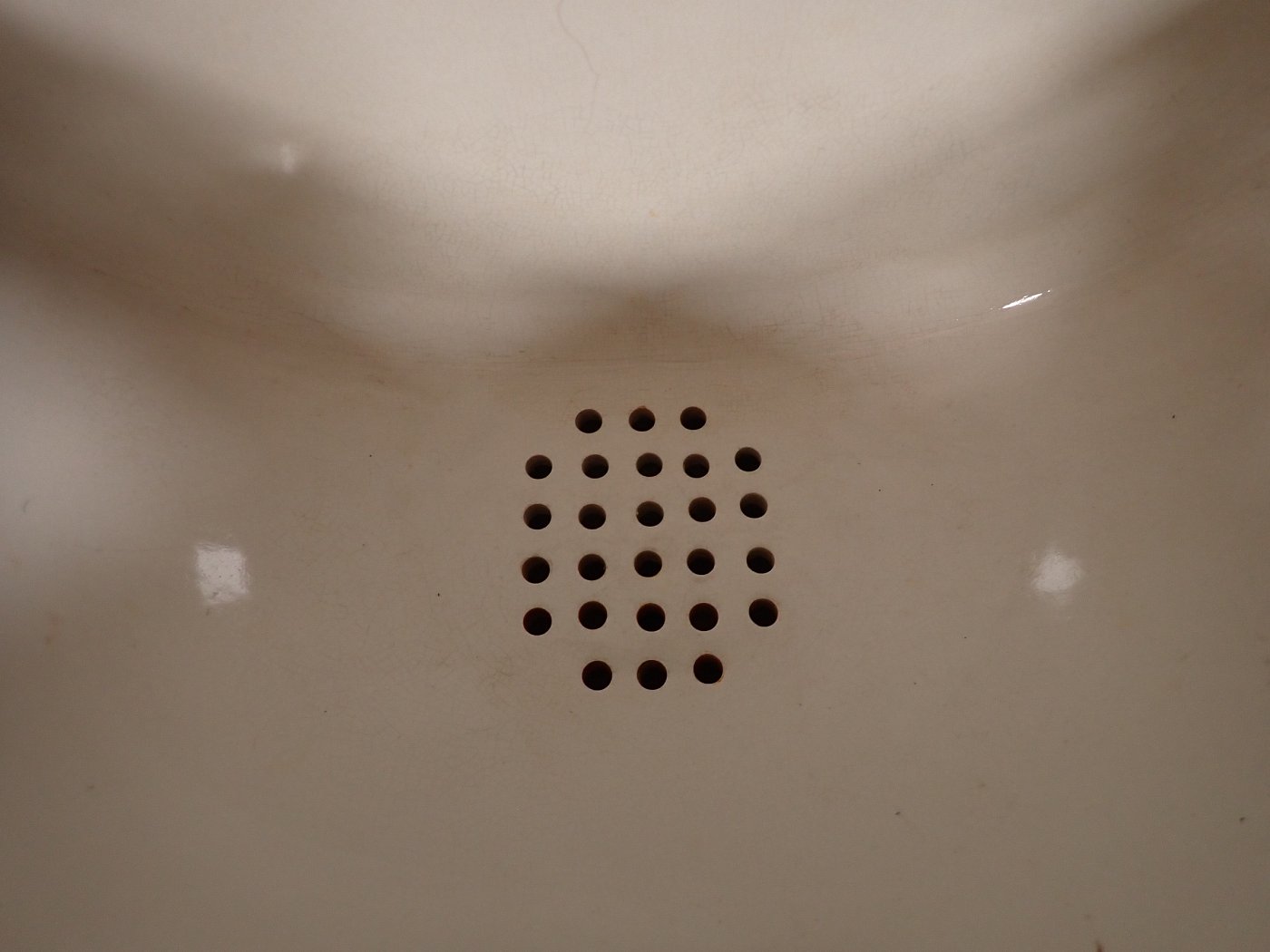 DetailansichtKeramikwaschbecken mit integrierten Seifenschalen. Ein Stempel auf der Rückseite verrät das Produktionsdatum - 12. Mai 1936. Bei diesem Alter kann man über die...