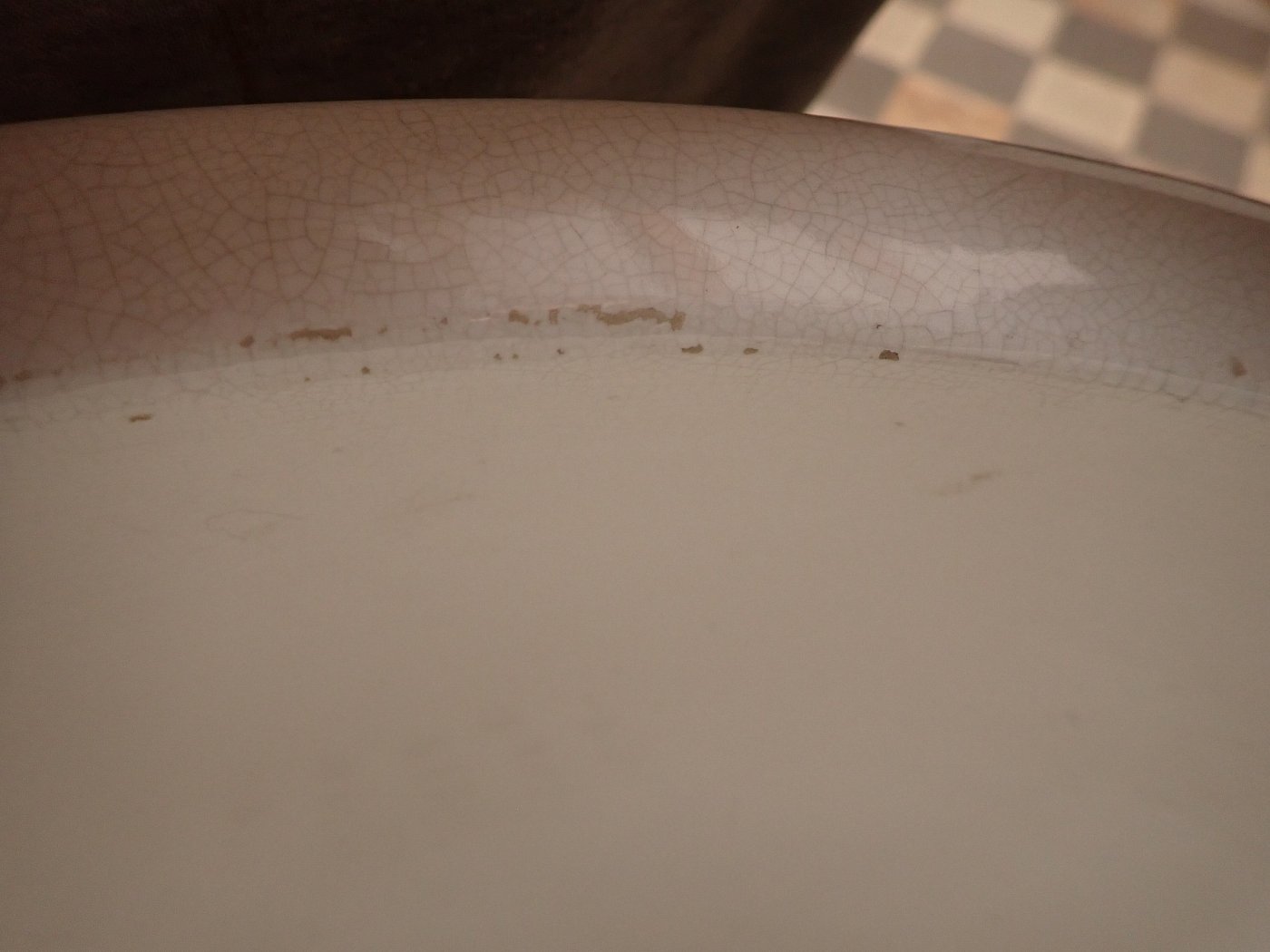 DetailansichtGroßes, schön geschwungenes Waschbecken mit Armatur. Das Keramik hat ein paar schwarze Streifen und ein paar Kalkablagerungen. Vielleicht geht hier aber noch etwas...