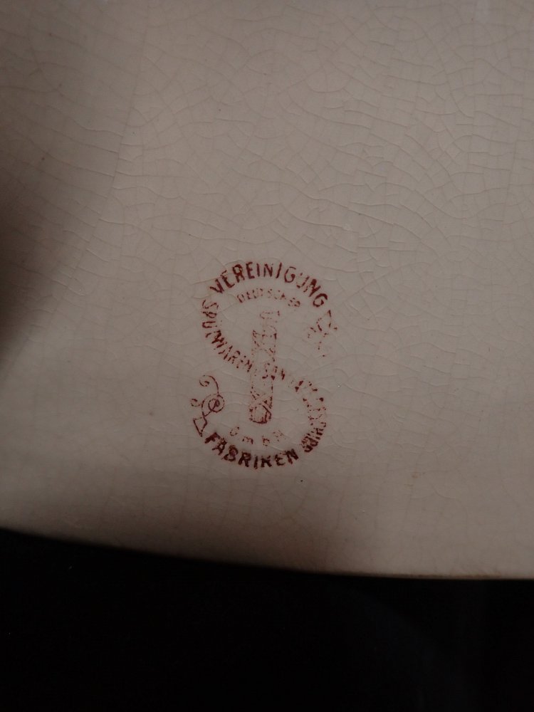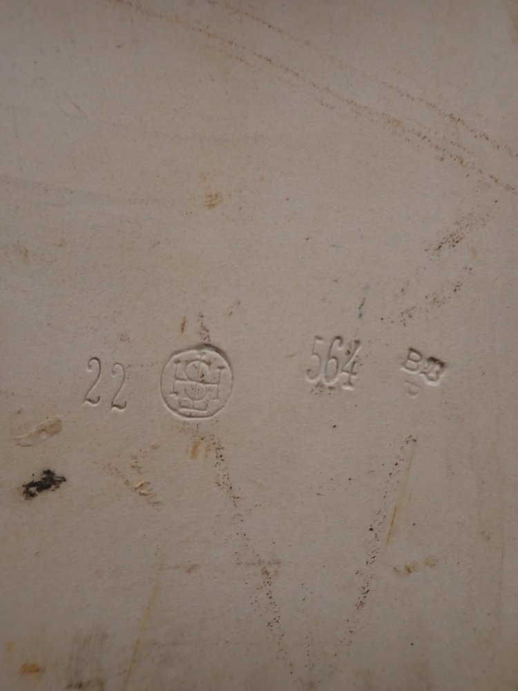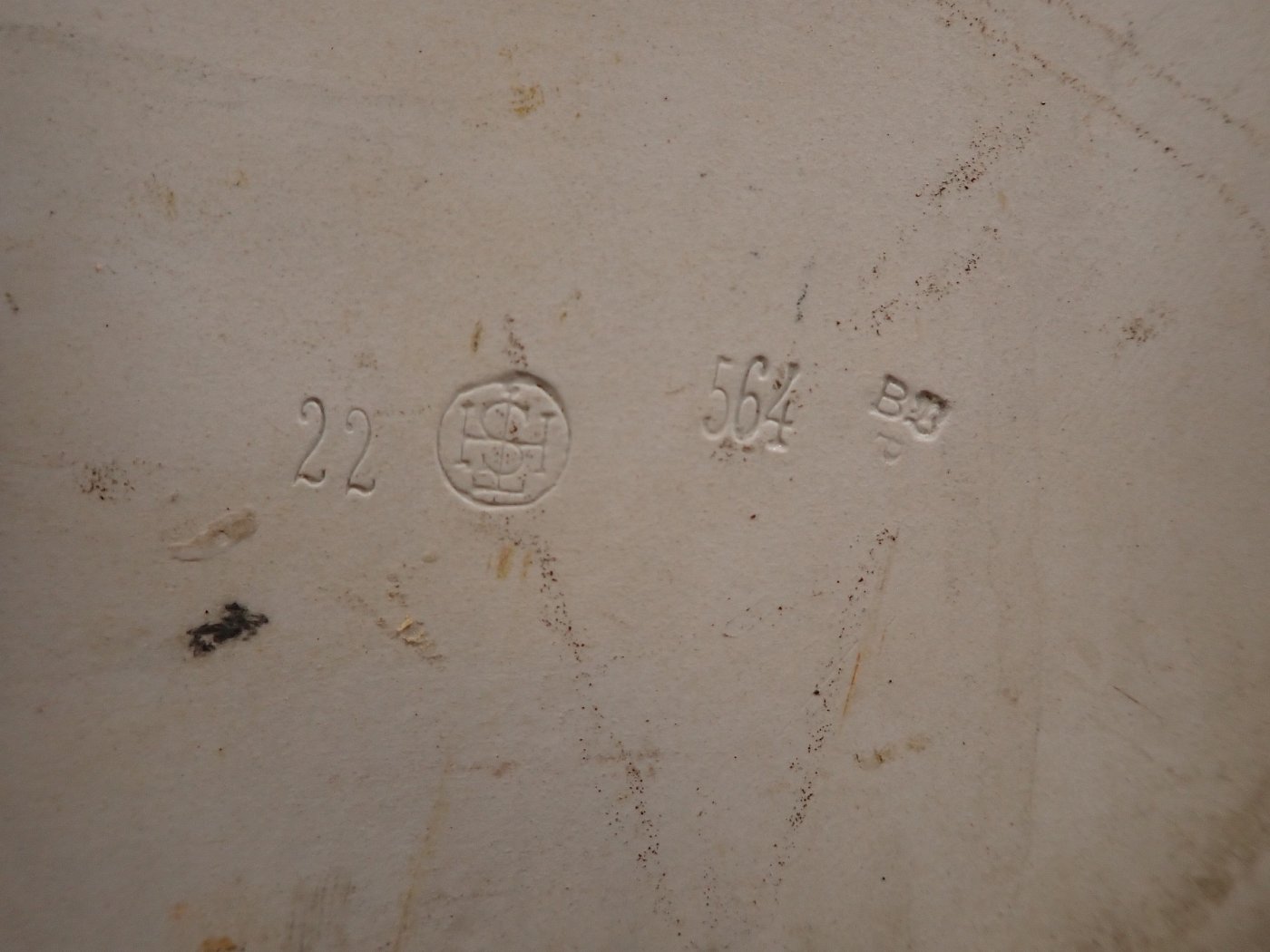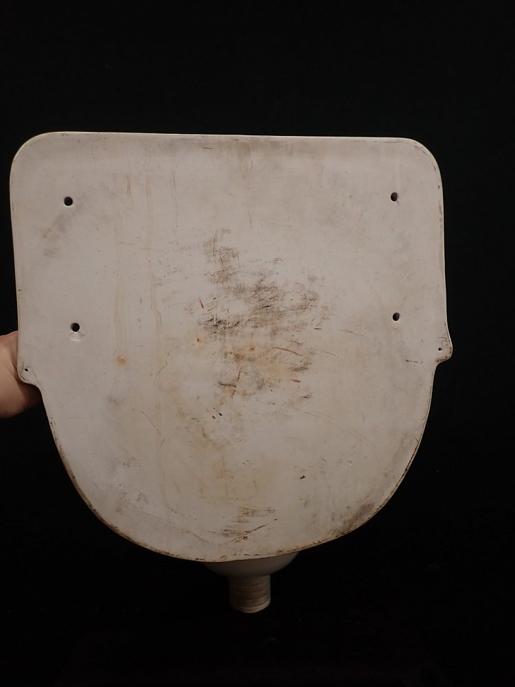 DetailansichtDas Waschbecken besteht komplett aus Keramik und hat insgesamt vier Löcher, um das Waschbecken an die Wand fest zuschrauben. Auf der Rückseite und unten am Waschbecken sind Markierungen mit der Aufschrift "Vereinigte Spülwaren und Sanitätsgeschirr Fabriken GMBH".
