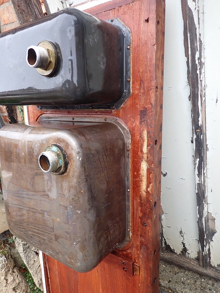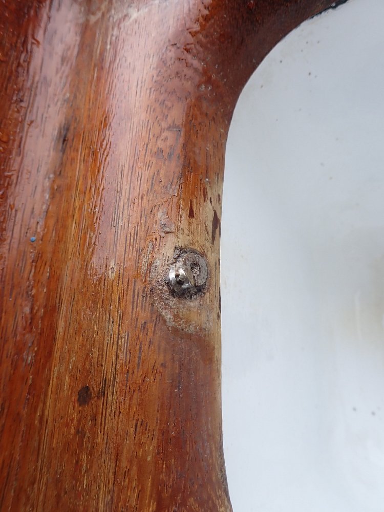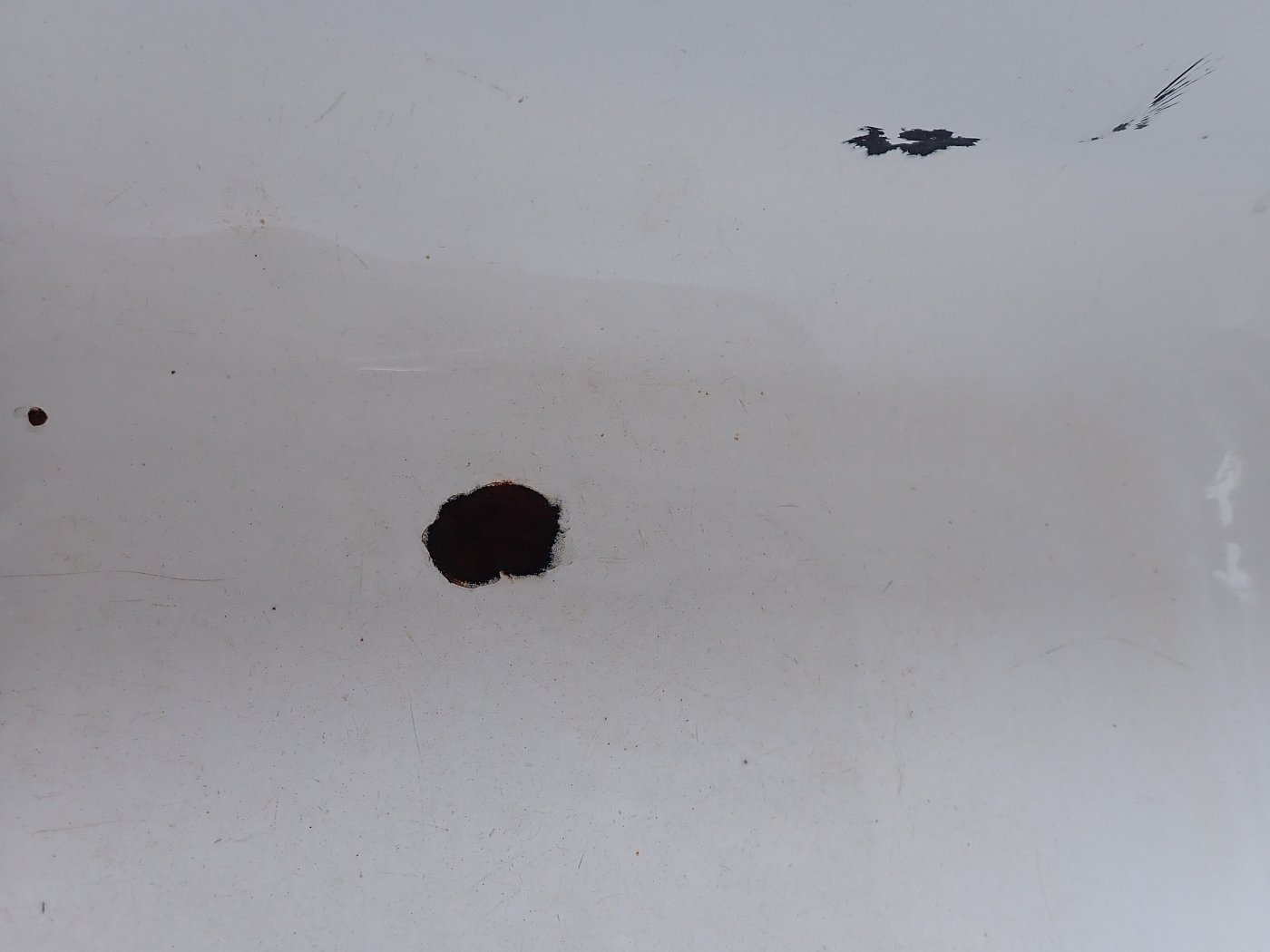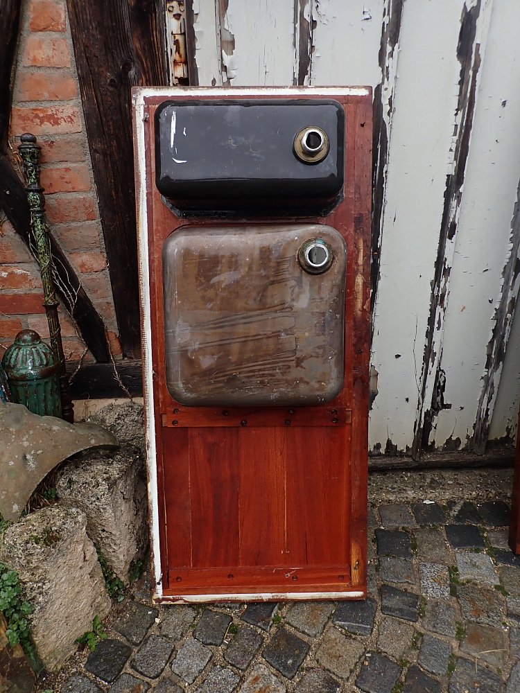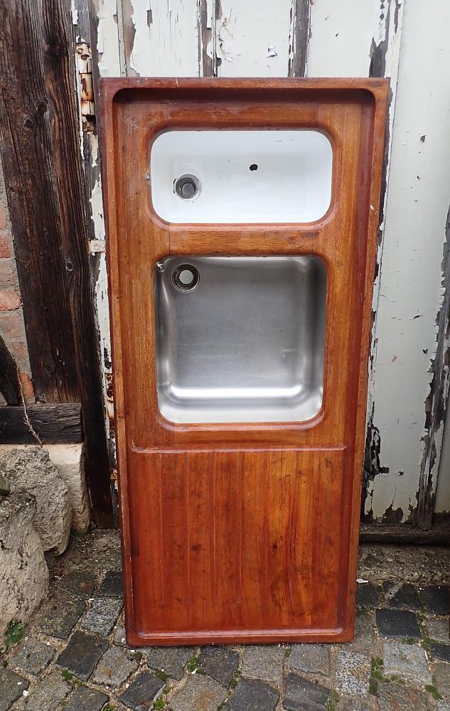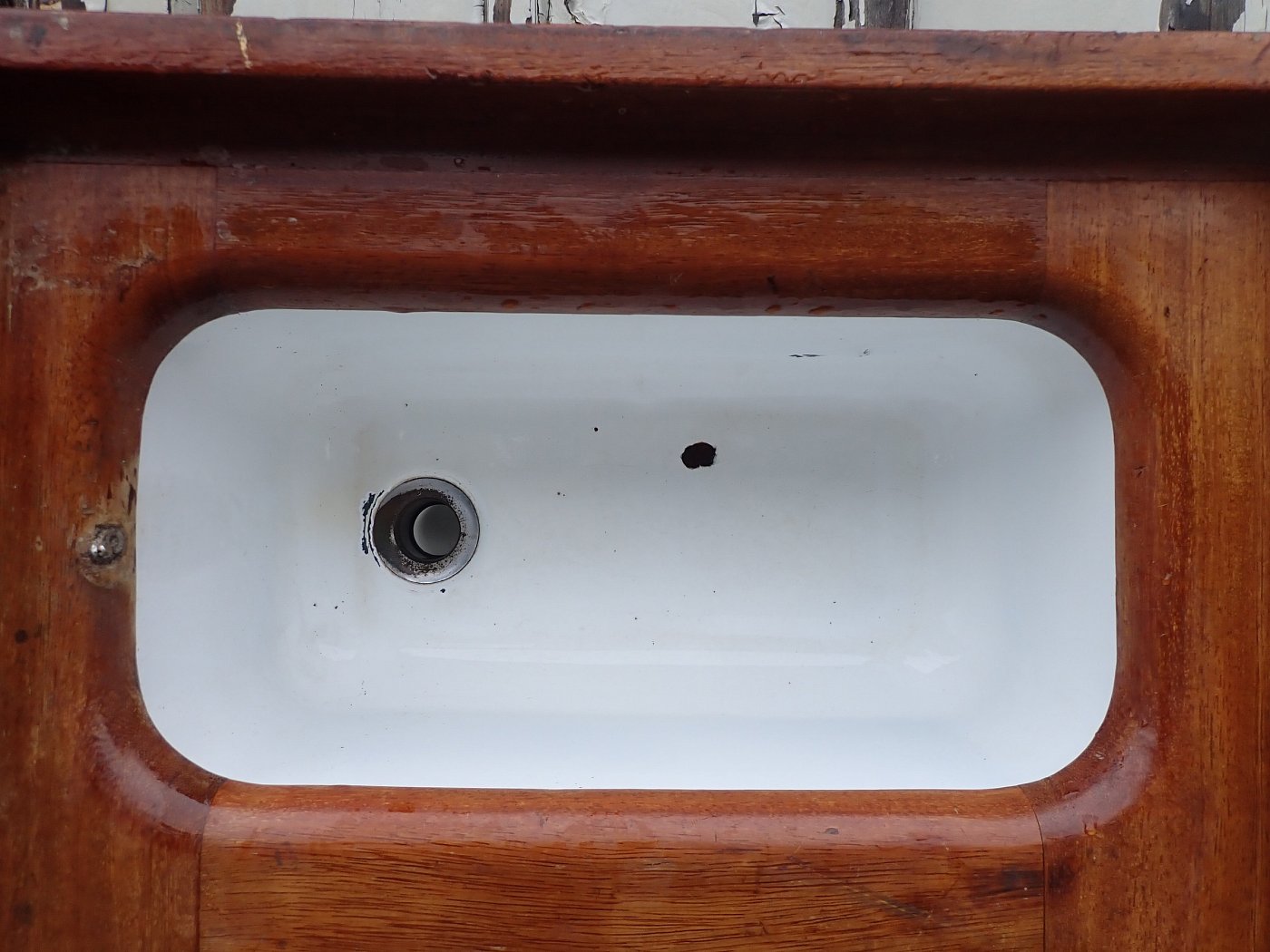 Abgesehen von einem Abblatzer in der emaillierten Fläche befindet sich das Becken in einem ausgesprochen guten Bergezustand. Da die beiden Spülbecken lediglich unten auf die Holzfläche aufgeschraubt sind, können sie entsprechend den individuellen Bedürfnissen einfach ausgetauscht und angepasst werden.