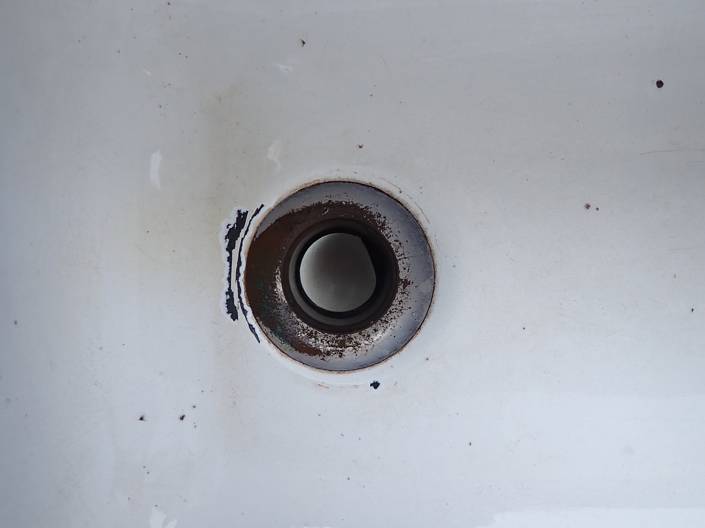 DetailansichtGroßes, schön geschwungenes Waschbecken mit Armatur. Das Keramik hat ein paar schwarze Streifen und ein paar Kalkablagerungen. Vielleicht geht hier aber noch etwas...