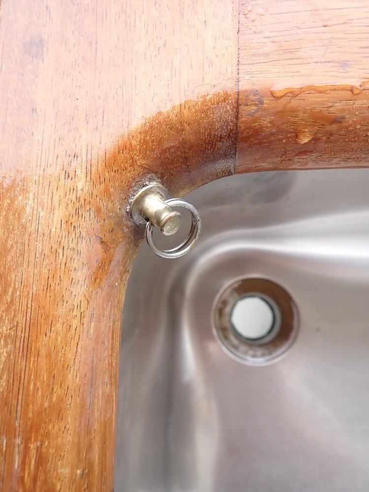 In die Spülbeckenumrandung aus Mahagoniholz sind zwei Aussparungen für je ein großes und ein kleines Becken eingearbeitet. Ausgestattet ist sie mit einem kleinen, Weiß emaillierten sowie einem großen Edelstahlbecken.