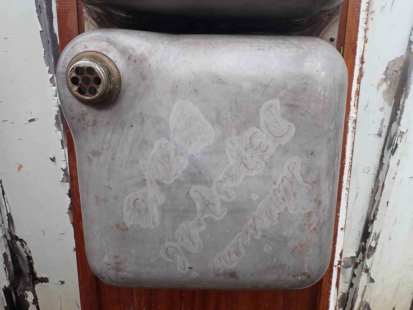 DetailansichtWaschbecken mit interessanter Armatur. Leider fehlt ein Oberteil von einem Handgriff. Eventuell müßte man beide ersetzen (li. u. re.), dann würde die Optik wieder...