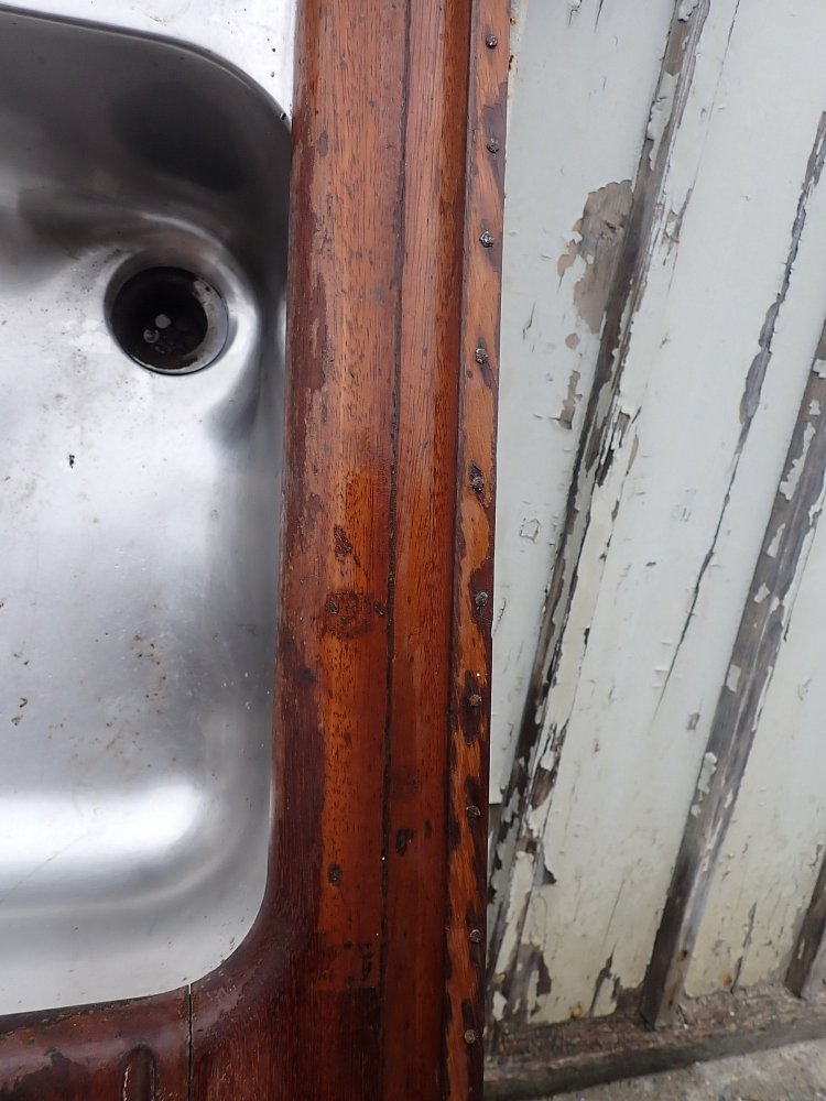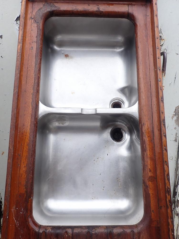 In die Spülbeckenumrandung aus Mahagoniholz ist eine große Aussparung für ein Doppelbecken eingearbeitet. Aktuell ist ein Edelstahlspülbecken eingebaut. Da das Becken lediglich mit kleinen Schrauben an der Holzfläche befestigt ist, kann es auch recht einfach entsprechend den individuellen Wünschen ausgetauscht werden.