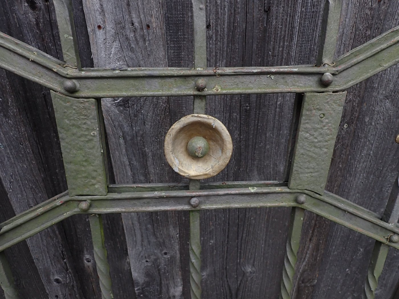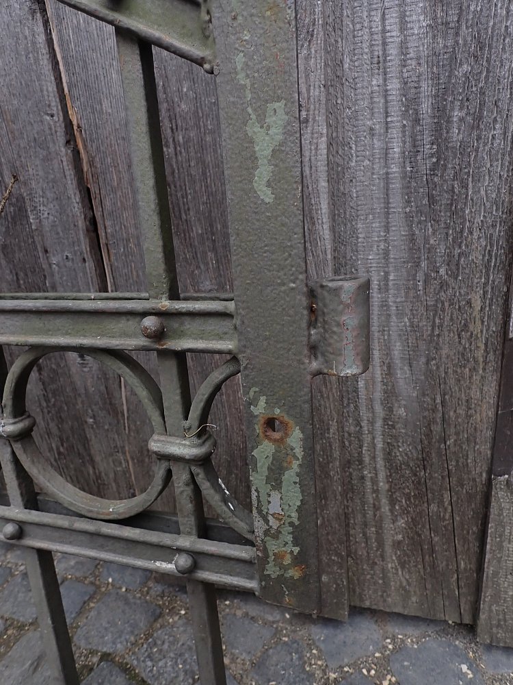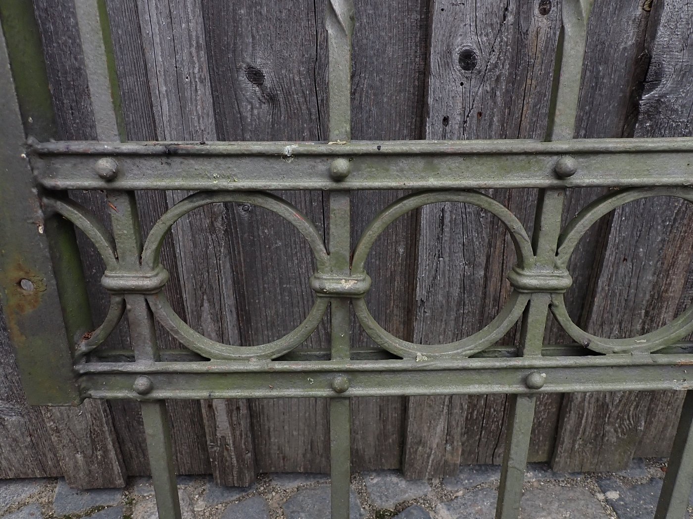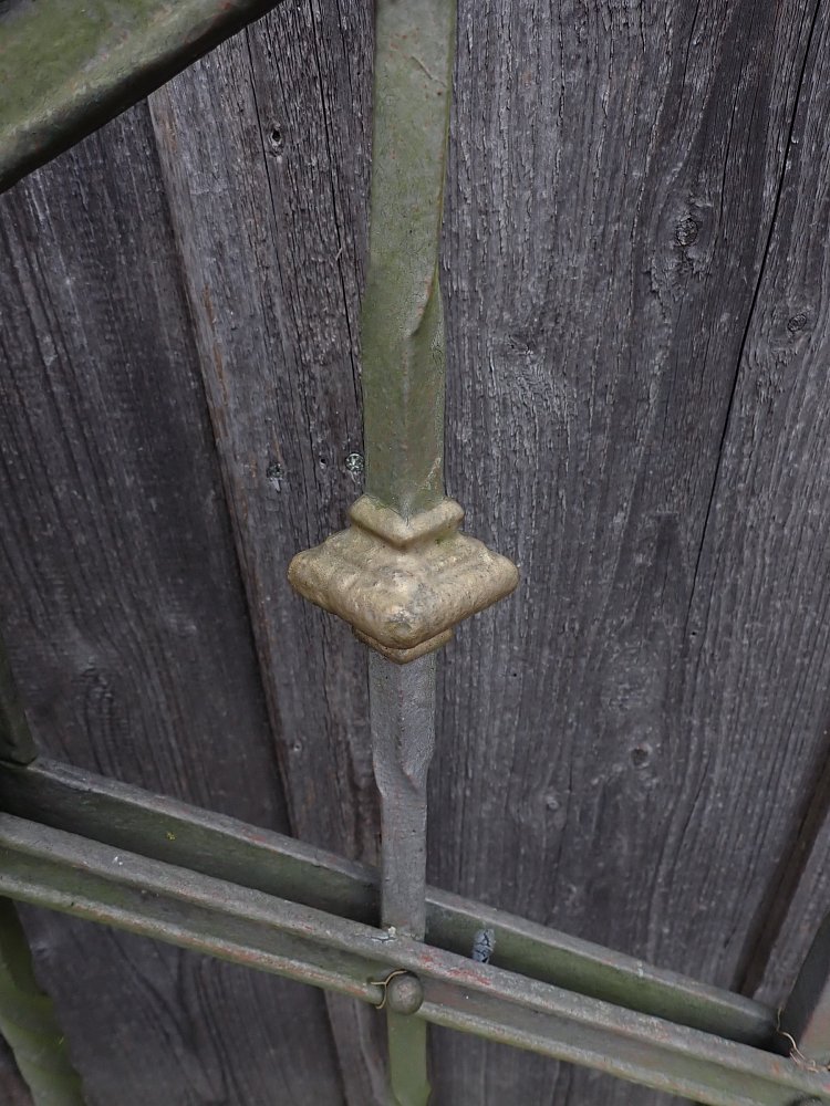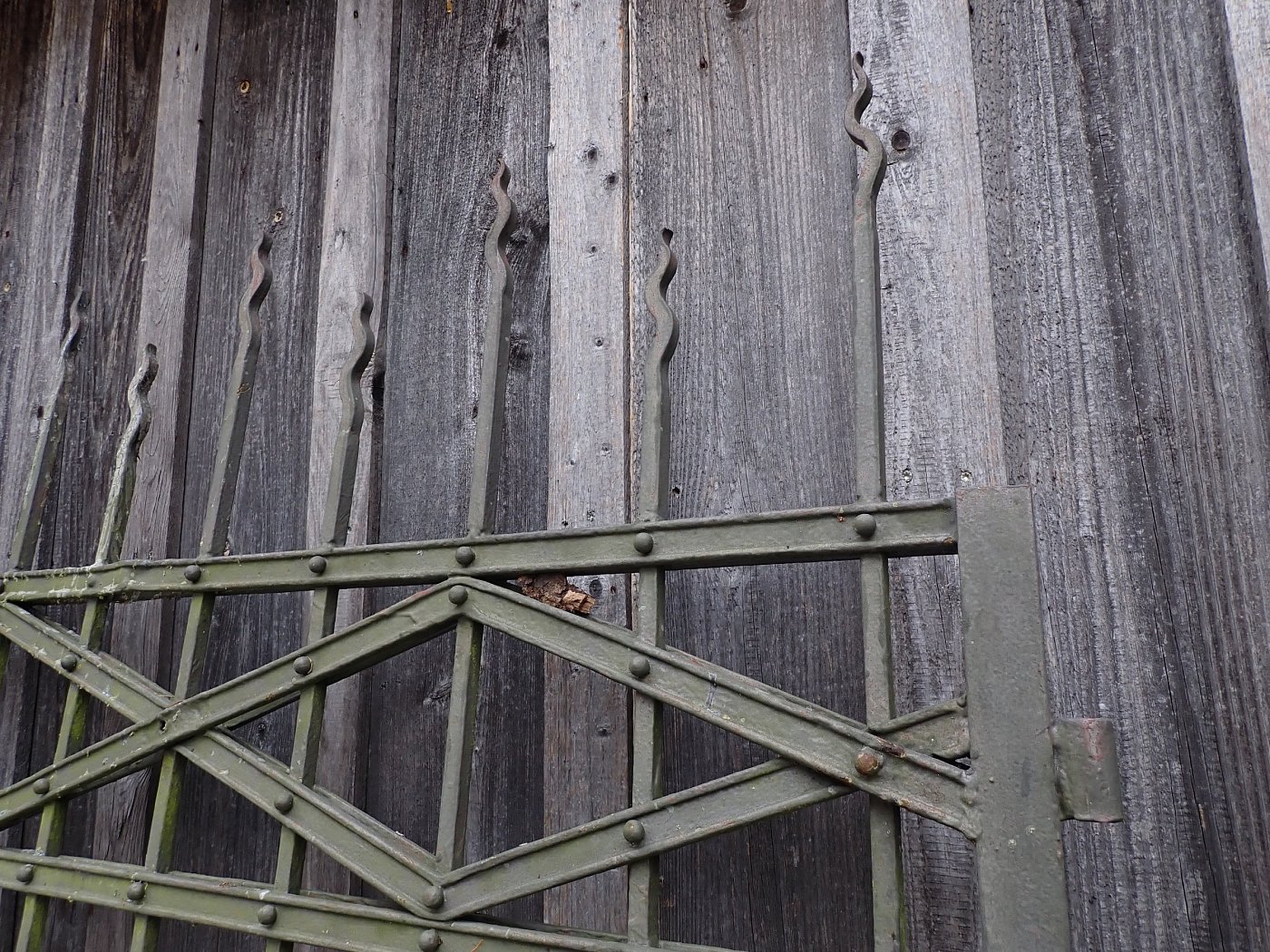 Die beiden Torflügel waren vermutlich ursprünglich Zaunelemente, darauf lassen zumindest die angeschweißten Stäbe im unteren Bereich sowie die Zierspitzen oben auf dem Tor schließen. Ebenso sind in den Rahmenteilen des Tores Bohrlöcher vorhanden, die nicht so recht zu der Funktion als Tor passen wollen.