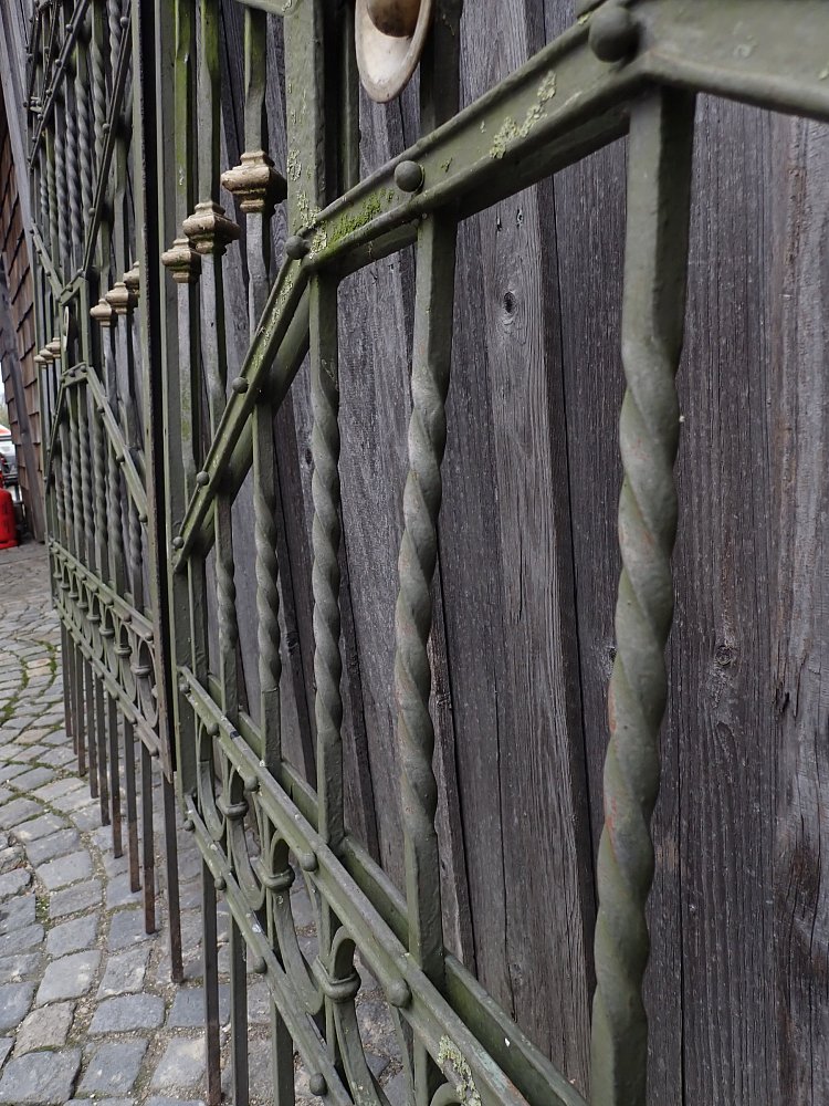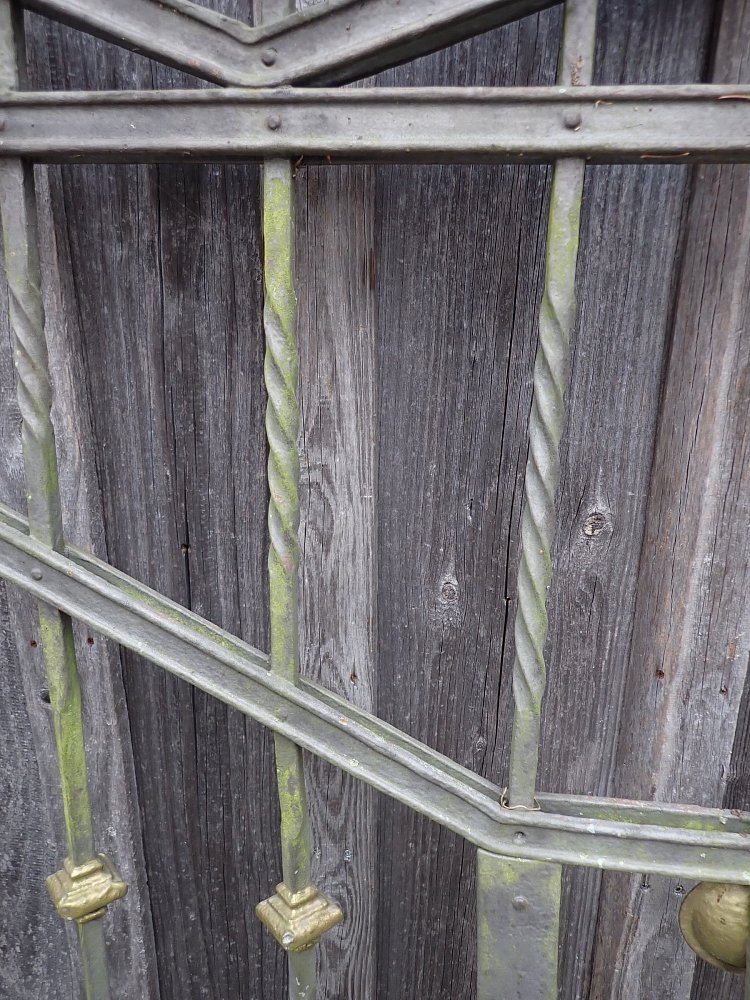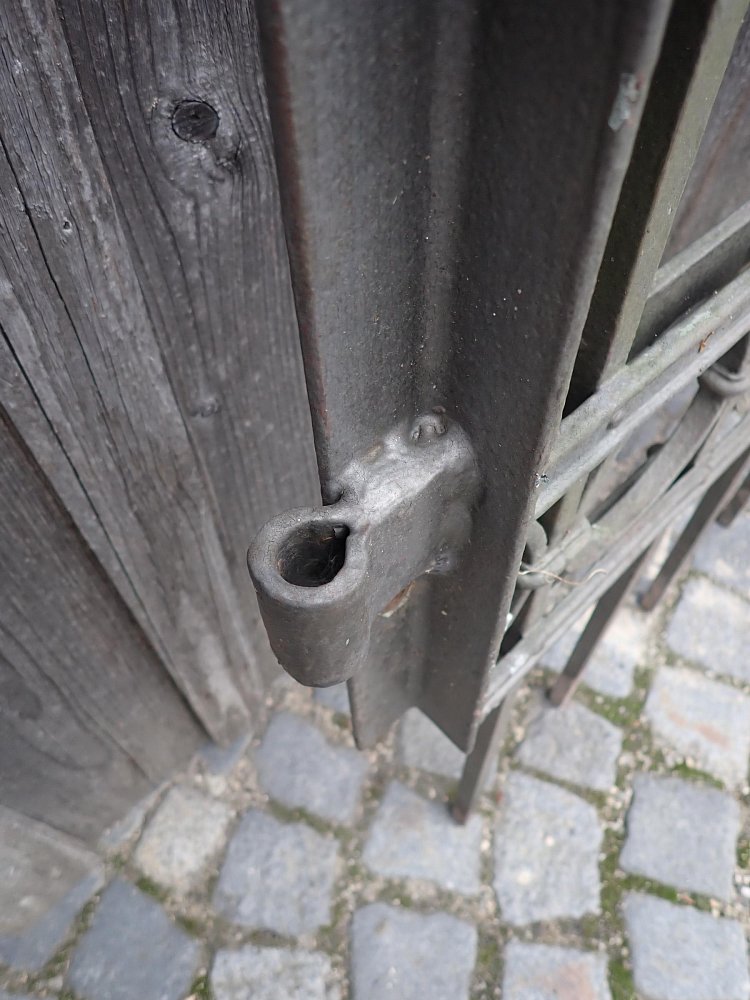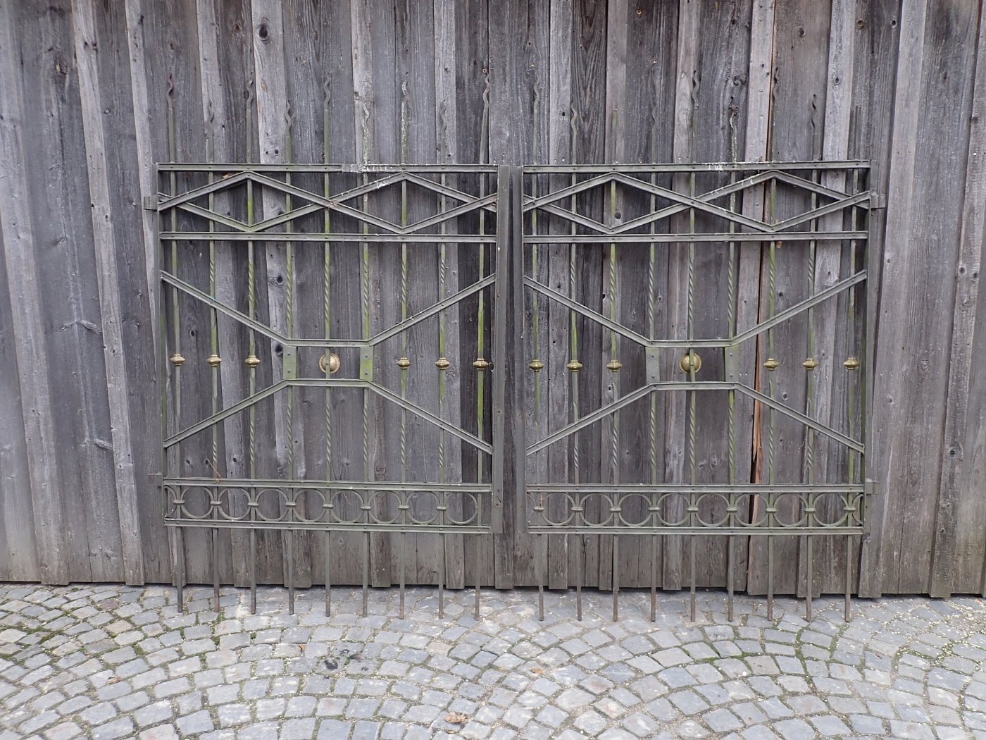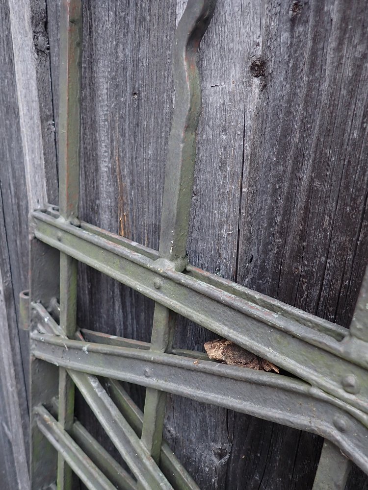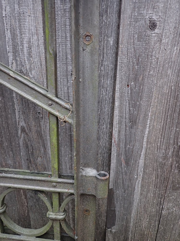 Die beiden Torflügel waren vermutlich ursprünglich Zaunelemente, darauf lassen zumindest die angeschweißten Stäbe im unteren Bereich sowie die Zierspitzen oben auf dem Tor schließen. Ebenso sind in den Rahmenteilen des Tores Bohrlöcher vorhanden, die nicht so recht zu der Funktion als Tor passen wollen.
