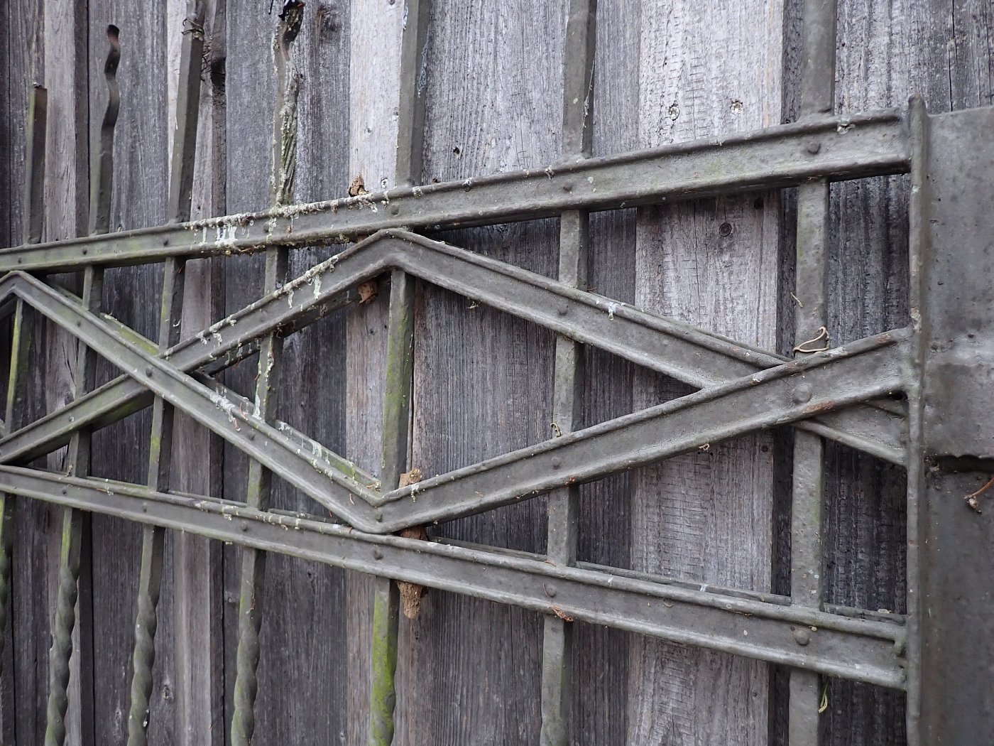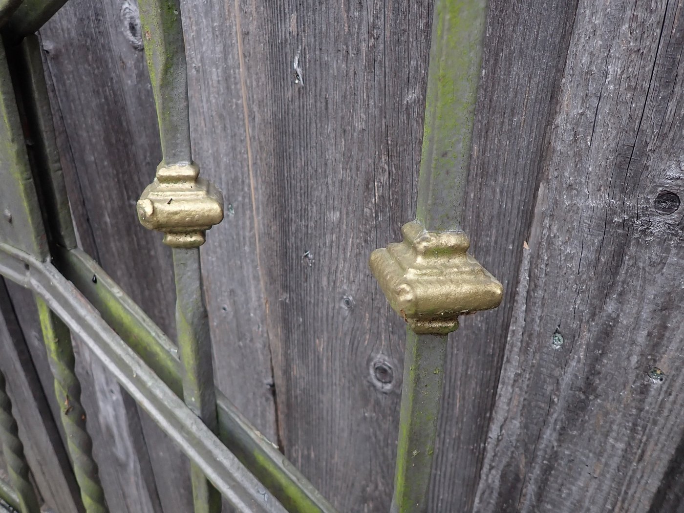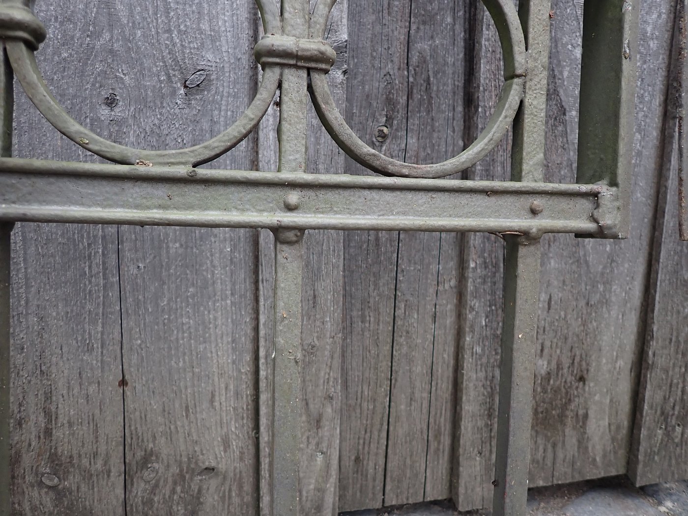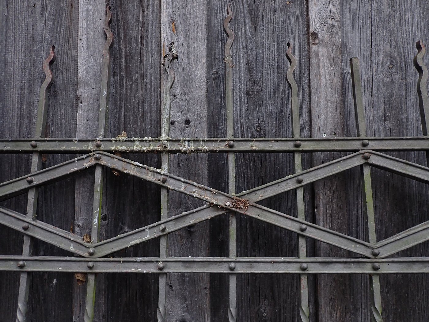 Die beiden Torflügel waren vermutlich ursprünglich Zaunelemente, darauf lassen zumindest die angeschweißten Stäbe im unteren Bereich sowie die Zierspitzen oben auf dem Tor schließen. Ebenso sind in den Rahmenteilen des Tores Bohrlöcher vorhanden, die nicht so recht zu der Funktion als Tor passen wollen.