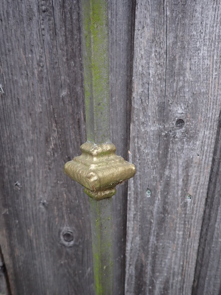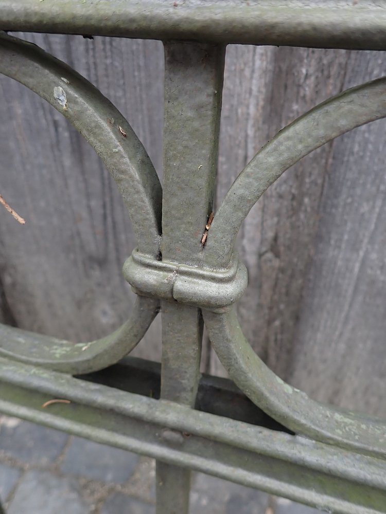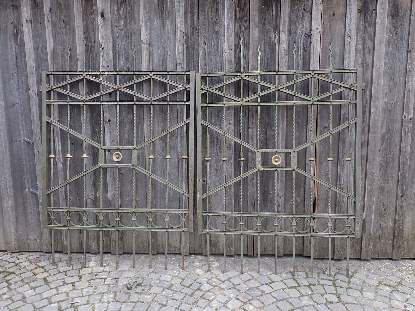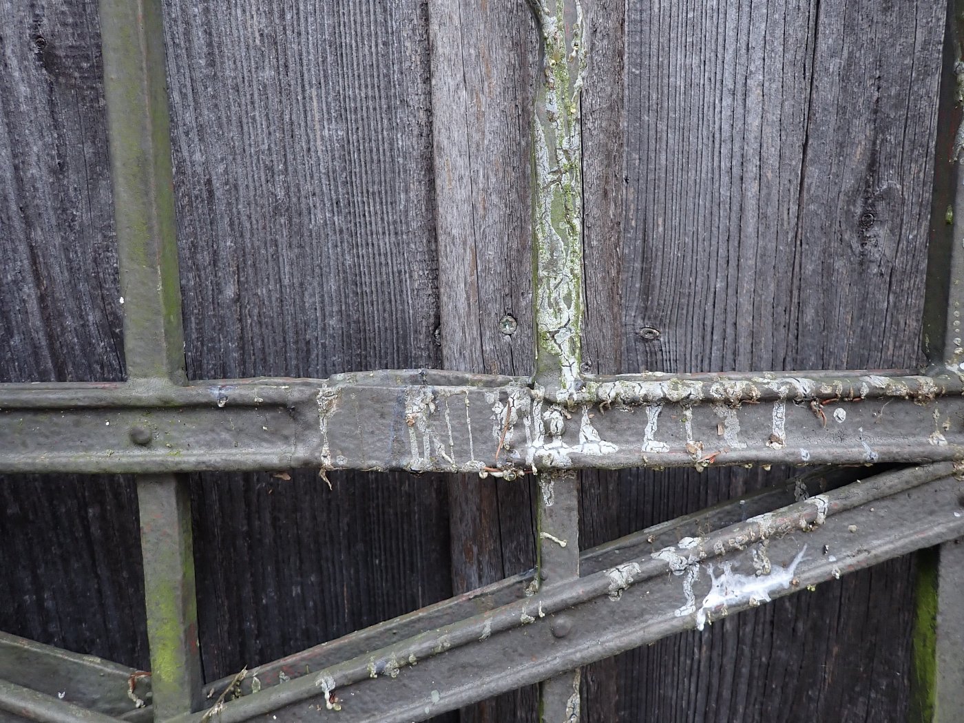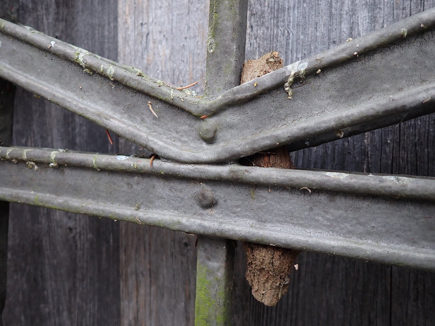 Die beiden Torflügel waren vermutlich ursprünglich Zaunelemente, darauf lassen zumindest die angeschweißten Stäbe im unteren Bereich sowie die Zierspitzen oben auf dem Tor schließen. Ebenso sind in den Rahmenteilen des Tores Bohrlöcher vorhanden, die nicht so recht zu der Funktion als Tor passen wollen.