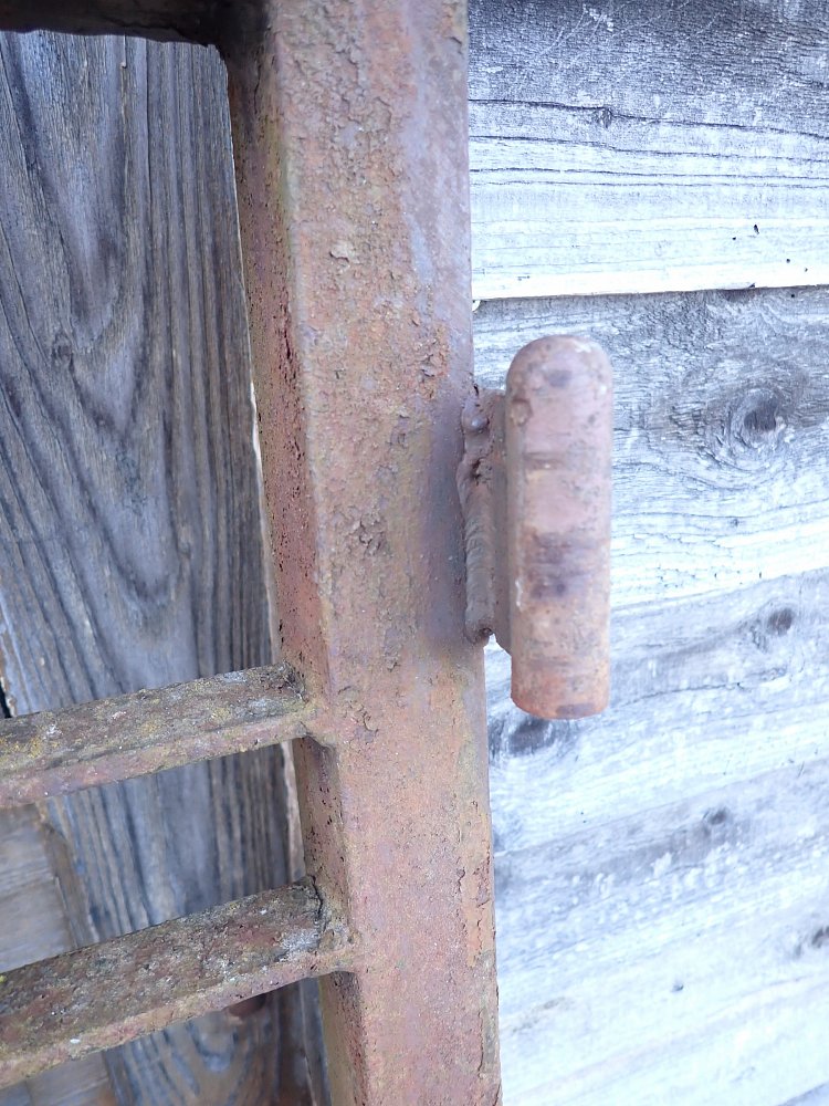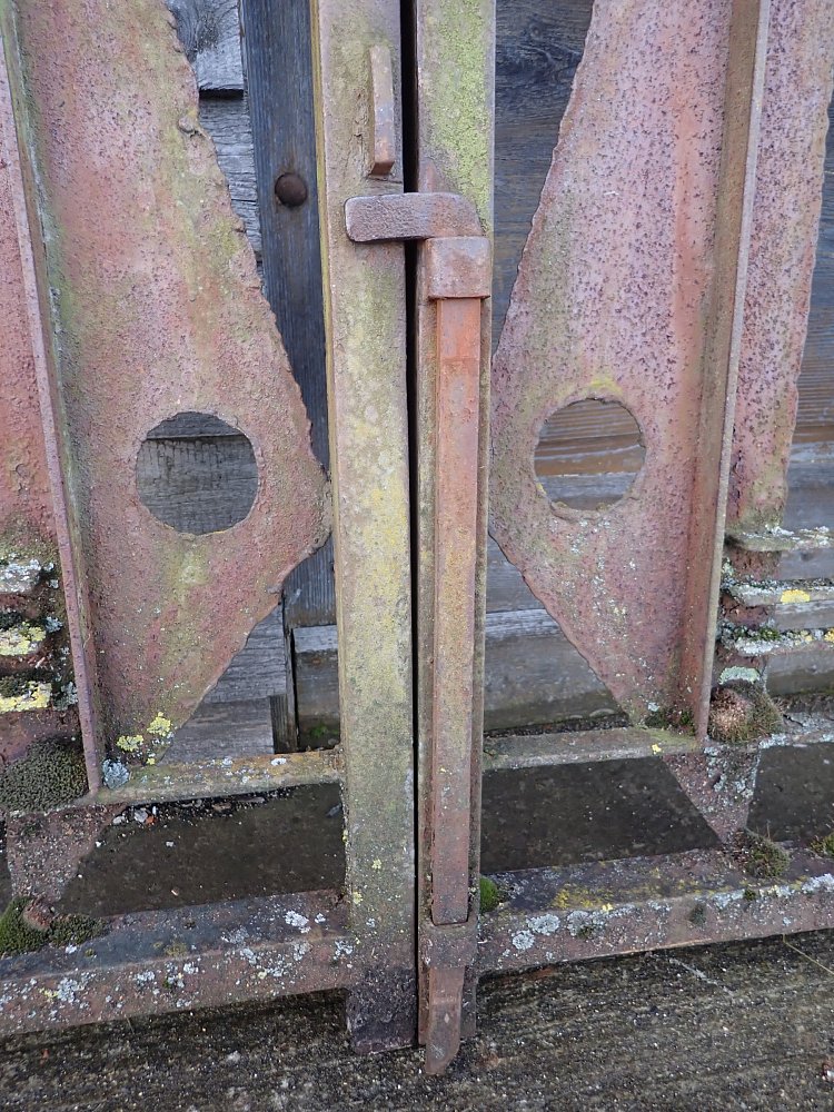 DetailansichtMassives Tor aus Schmiedeeisen. Das Hoftor ist sehr schlicht gehalten und die Längs- und Querstreben sind ganz klassisch durch Nieten mit dem Rahmen verbunden. Eingehängt...