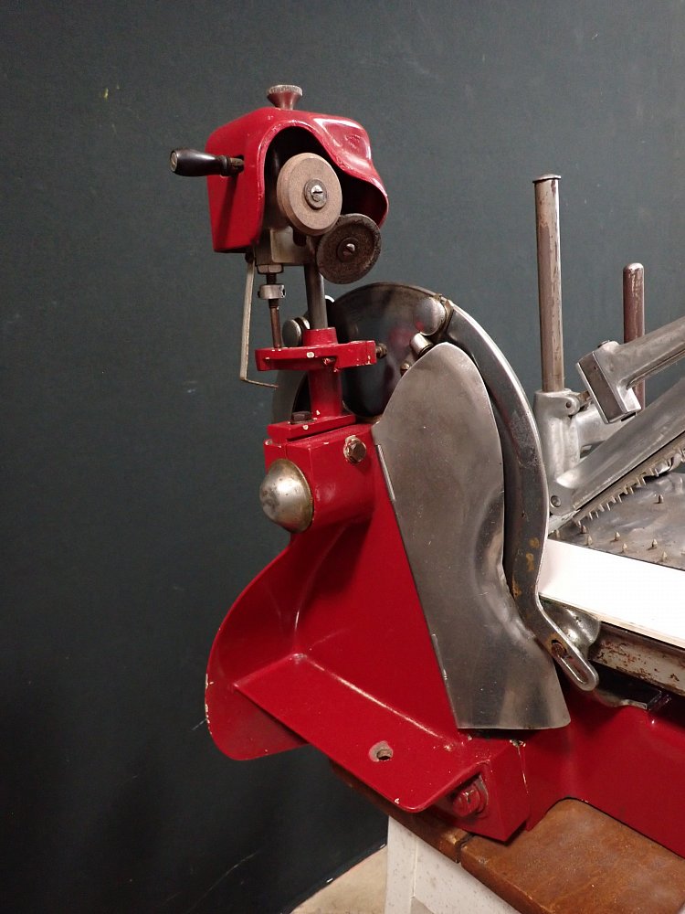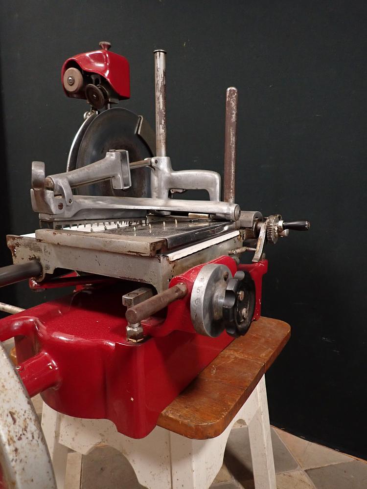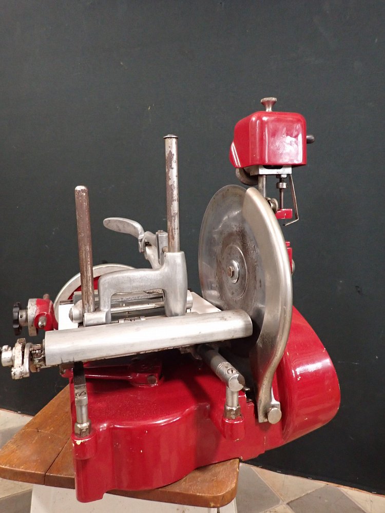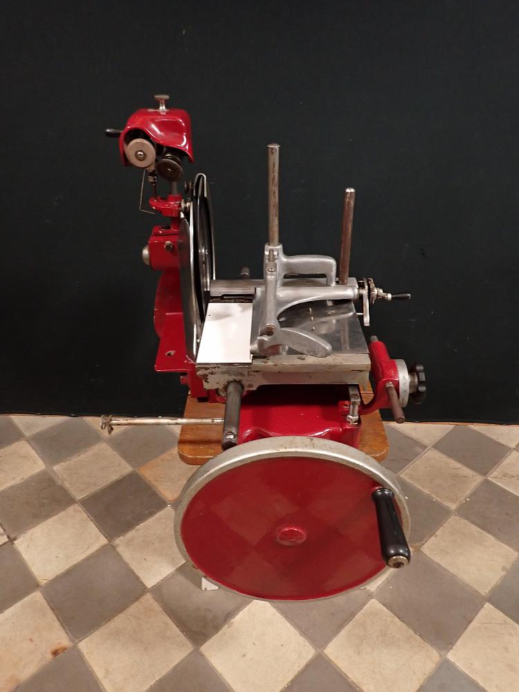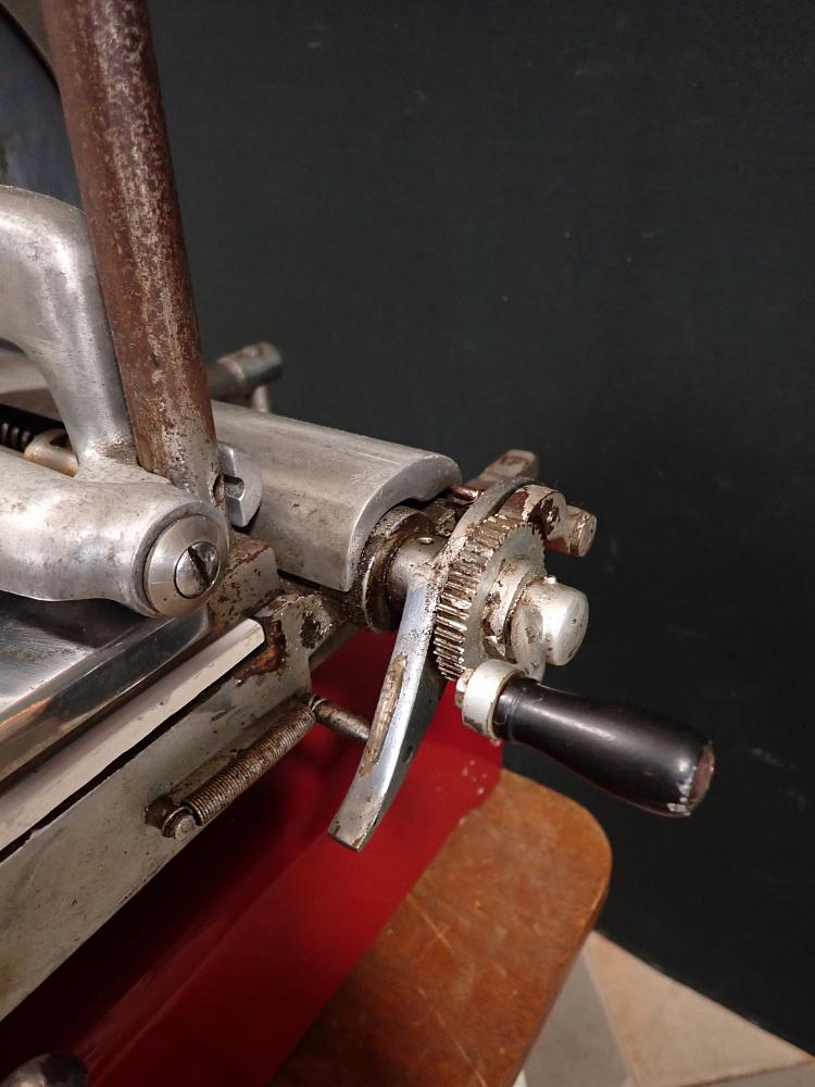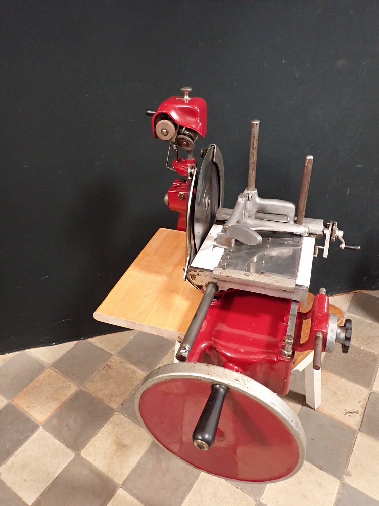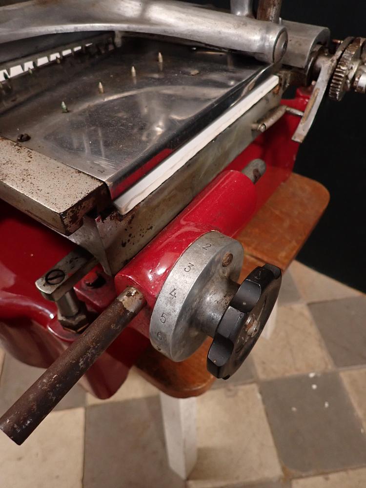 Die schwere Aufschnittmaschine funktioniert rein mechanisch und wird über ein großes Schwungrad mit Handkurbel angetrieben.