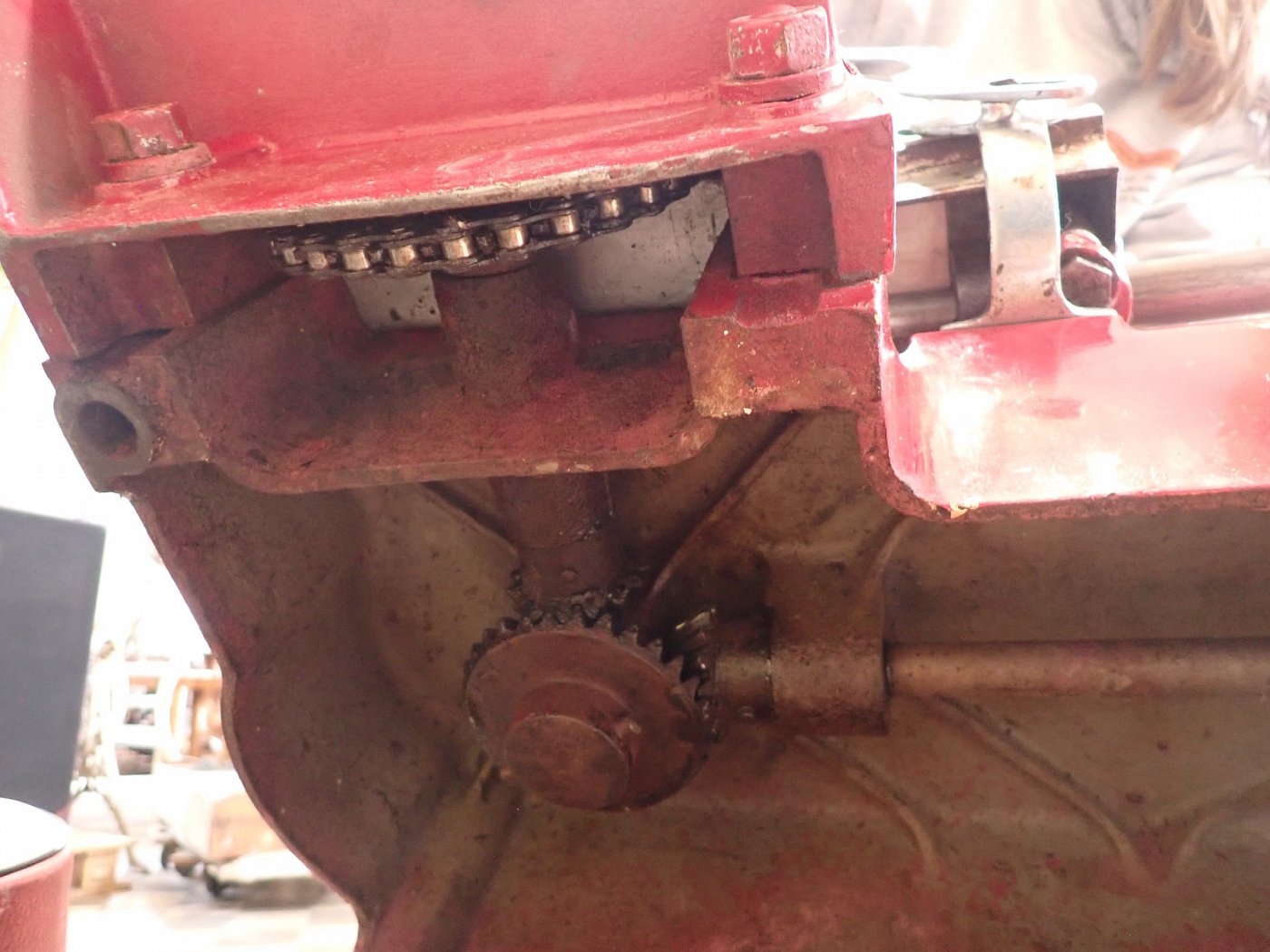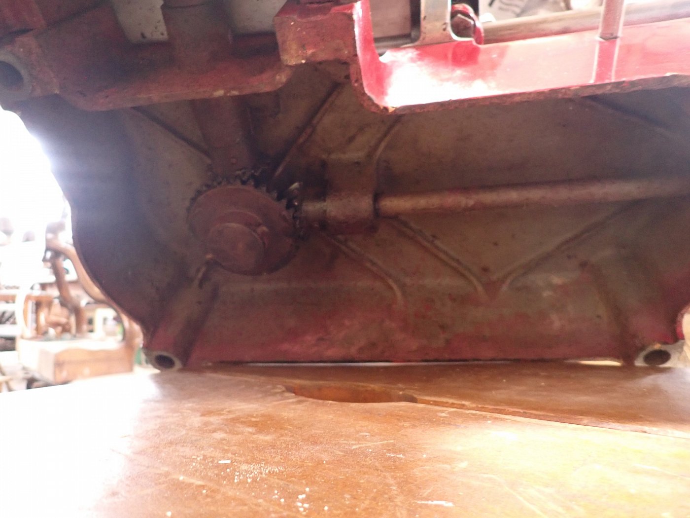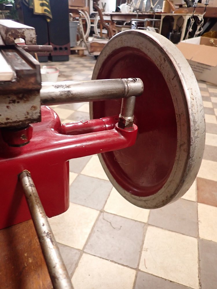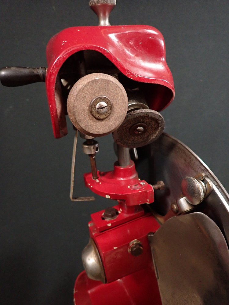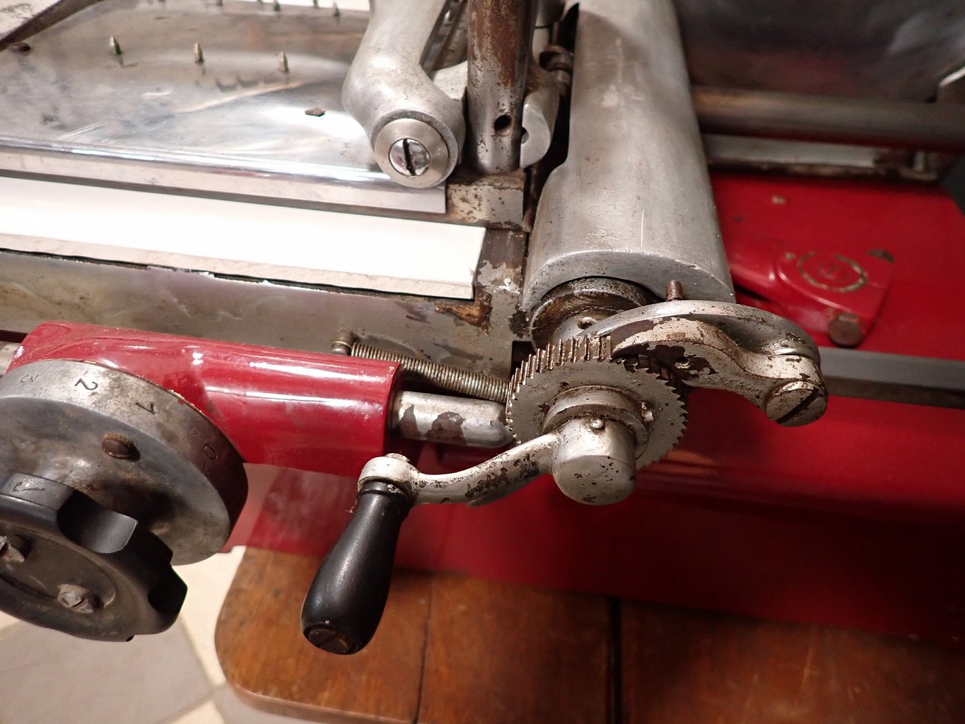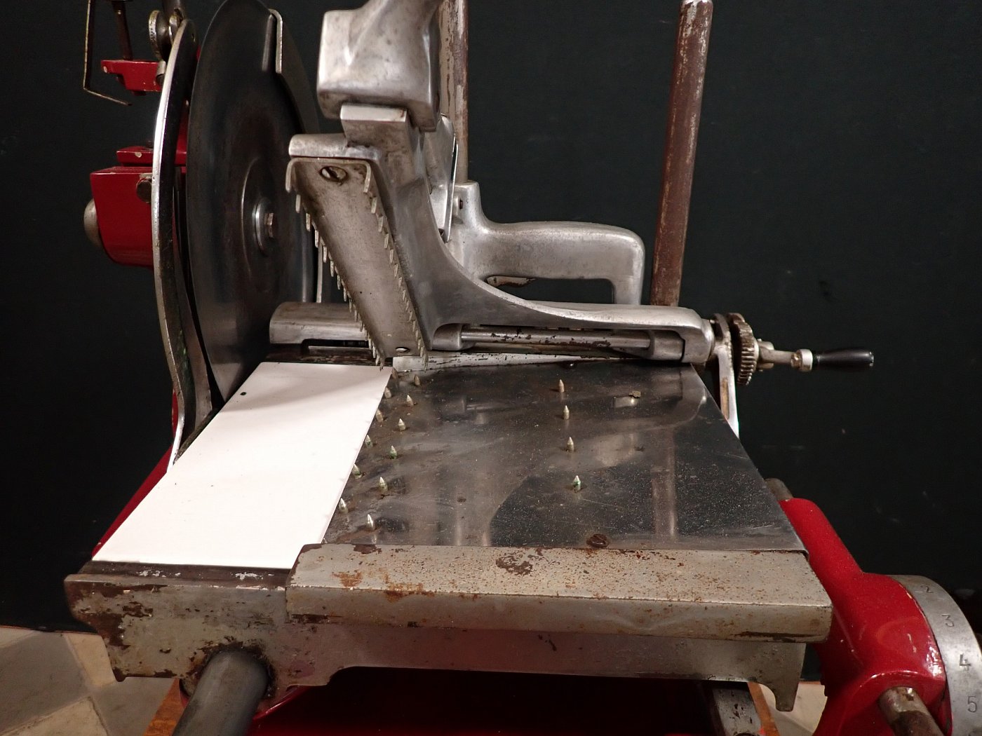 Die schwere Aufschnittmaschine funktioniert rein mechanisch und wird über ein großes Schwungrad mit Handkurbel angetrieben.