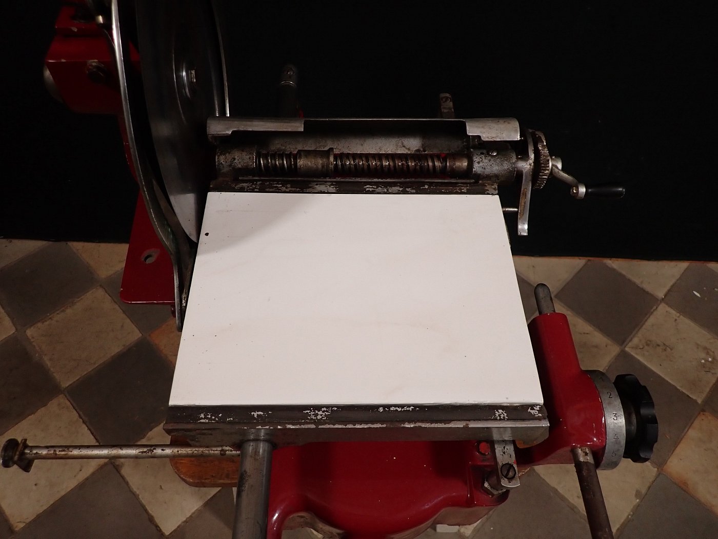 Über ein Stellrad auf der Seite wird die Scheibendicke des Schnittguts eingestellt. Durch die Bewegung des Transportschlittens wird dieser mit jeder Umdrehung eine Position weiter in Richtung Messer transportiert.