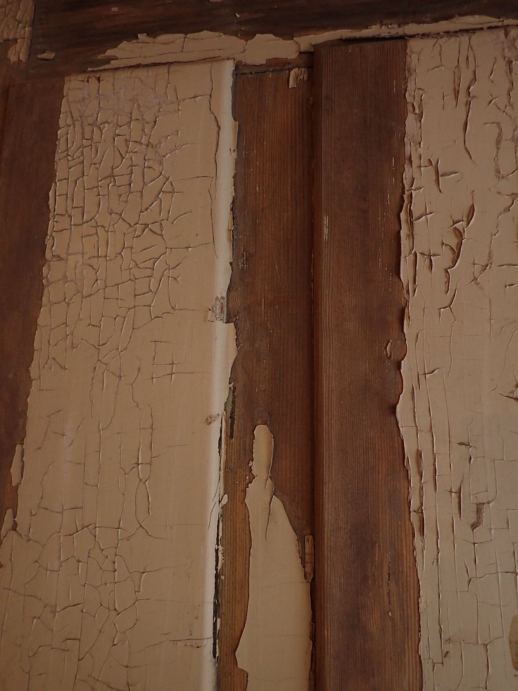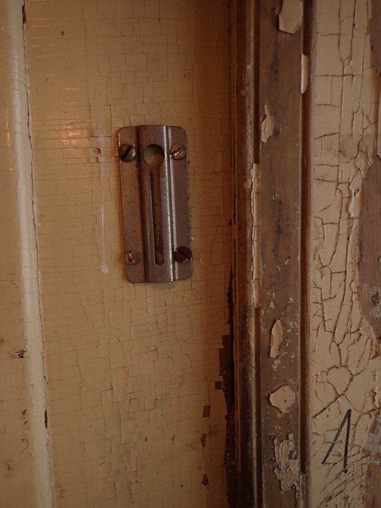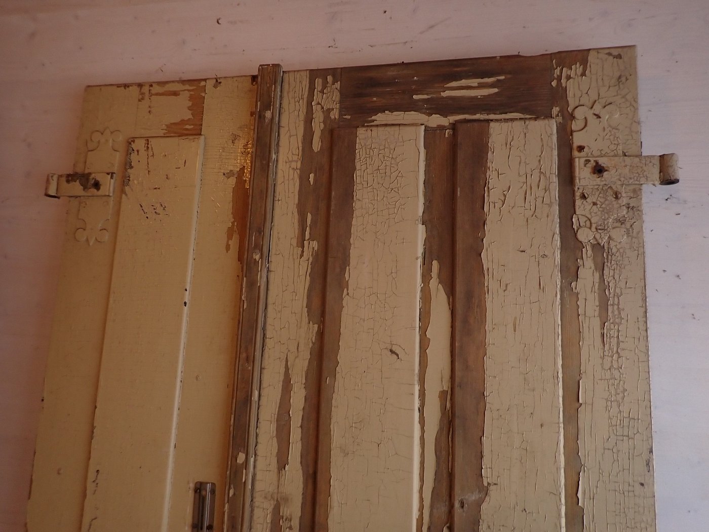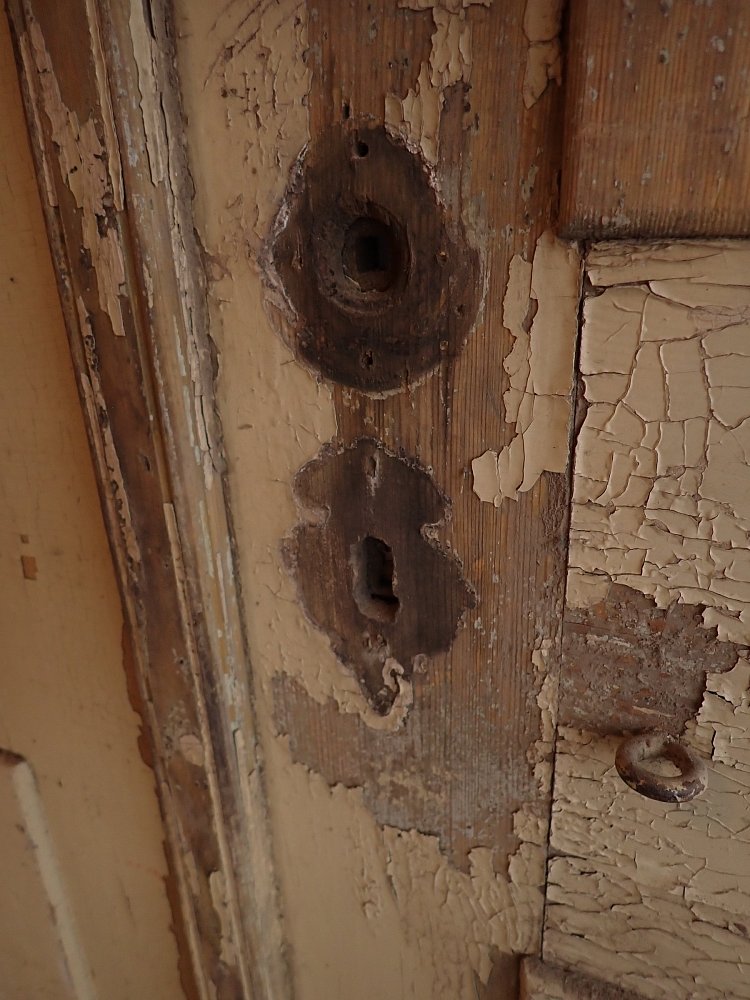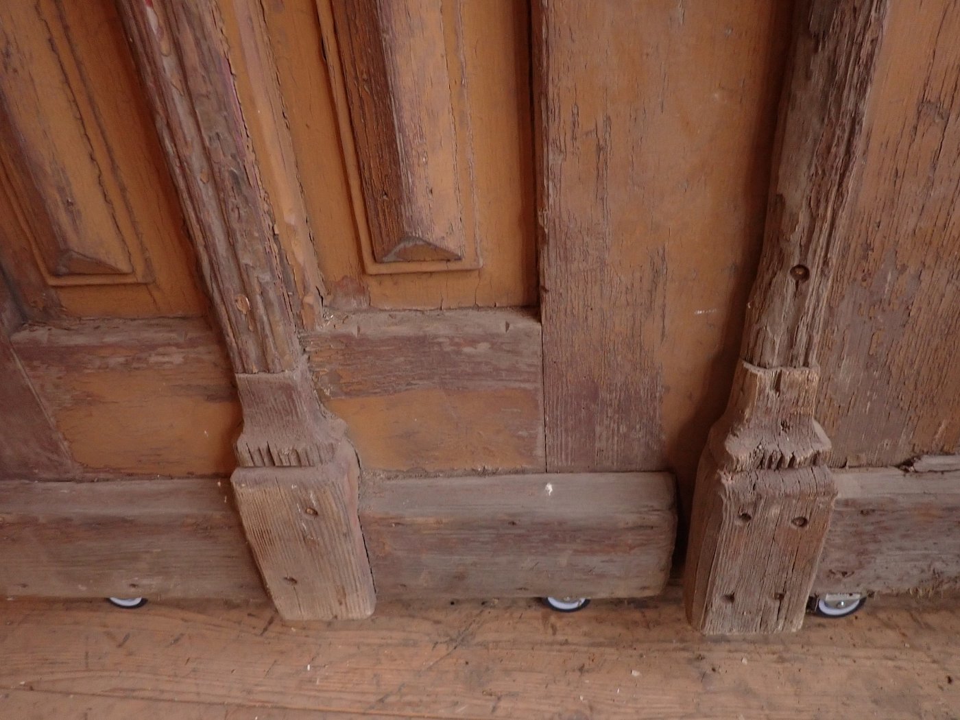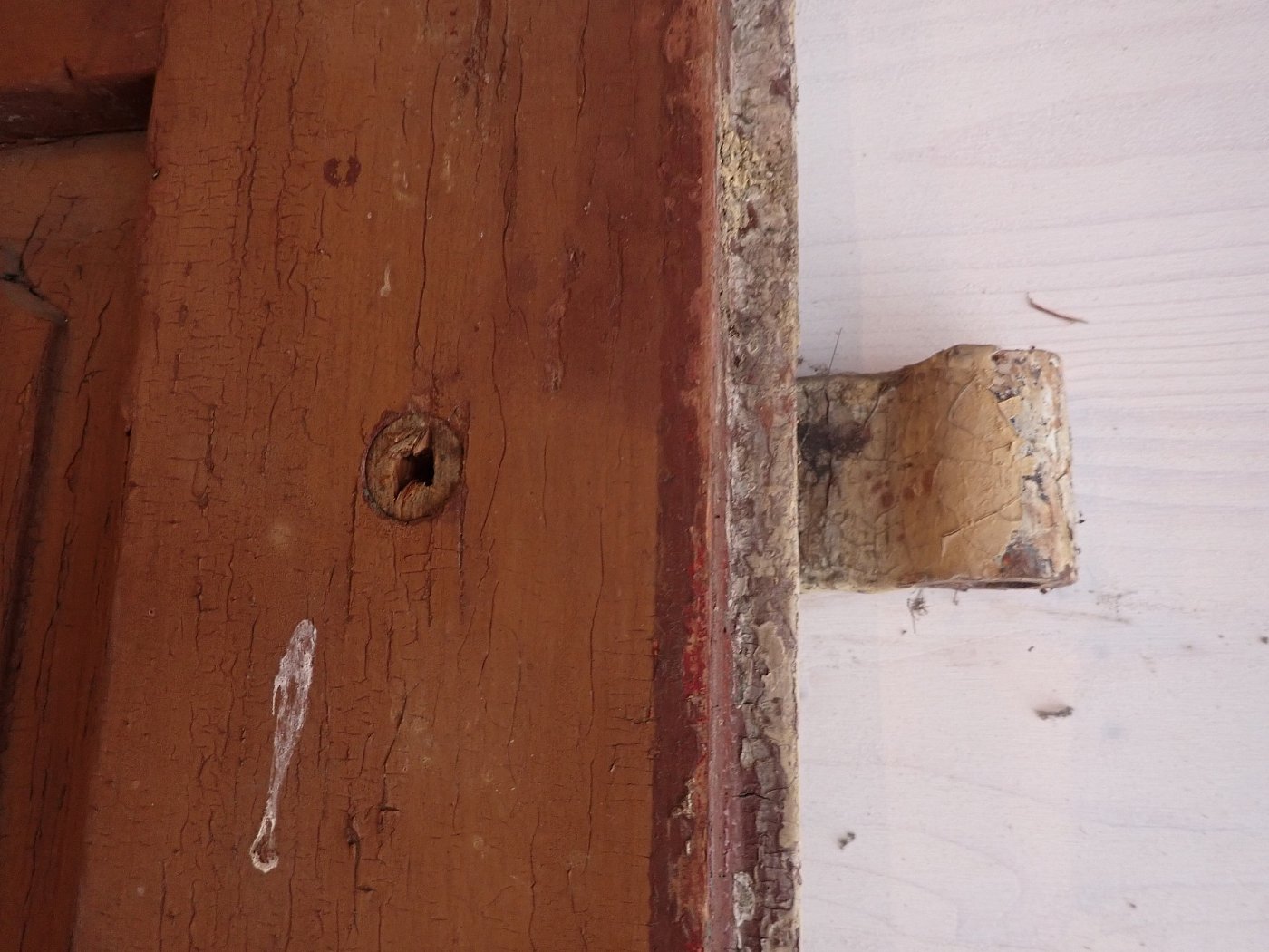Die Haustür ist aus Eichenholz gefertigt und mit einem Buntglasfenster im oberen Bereich und mit einem sternförmigen Holzintarsienmuster gestaltet. An der Tür...