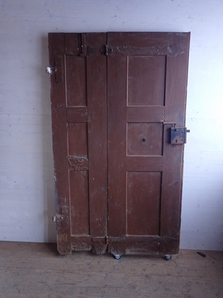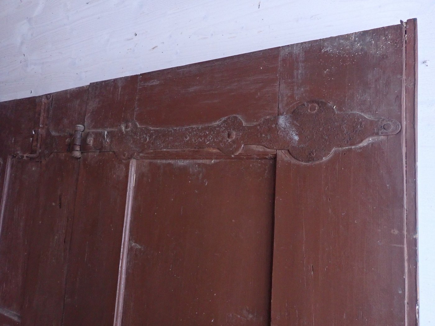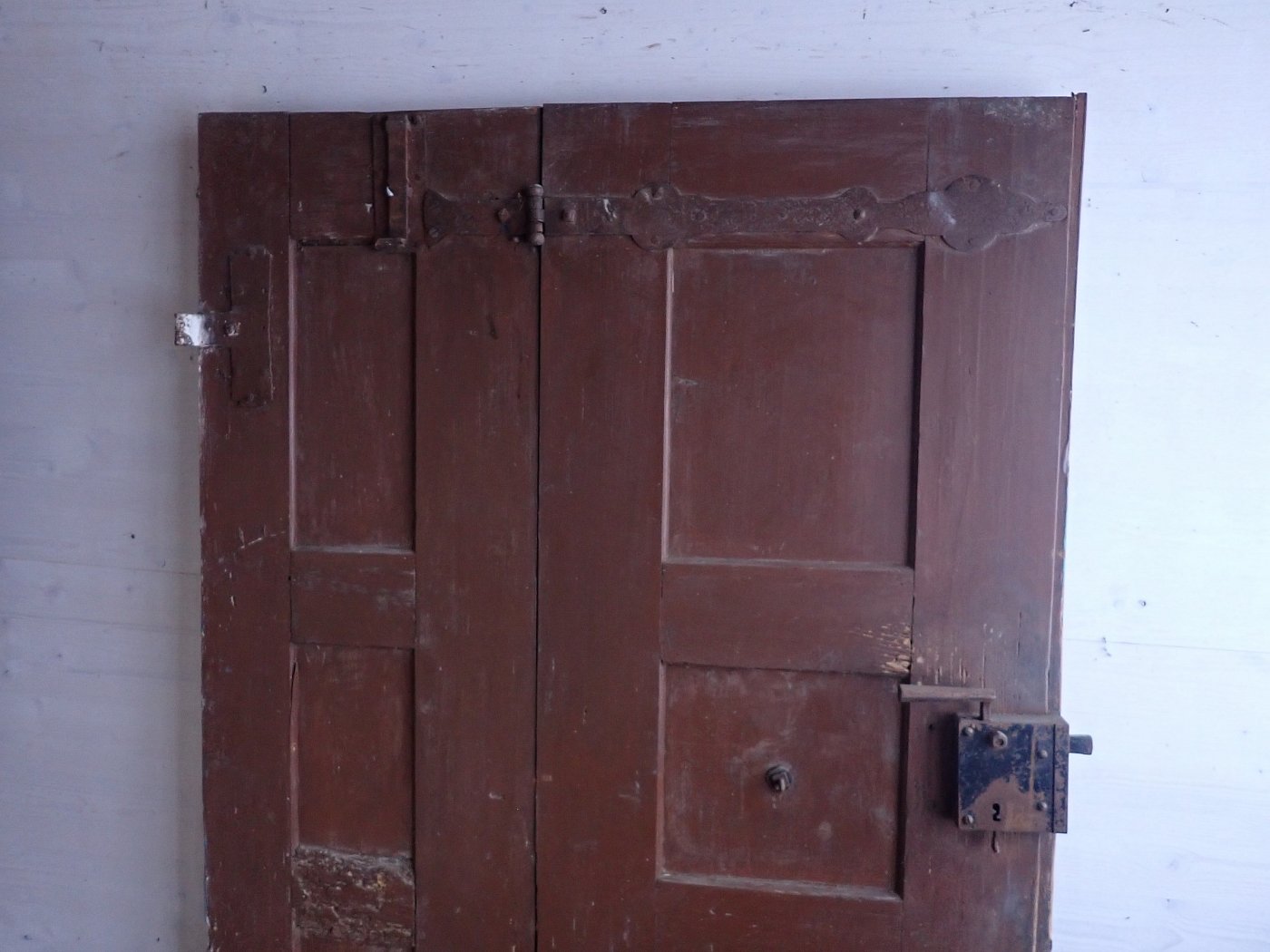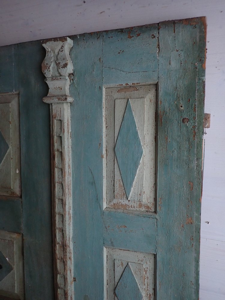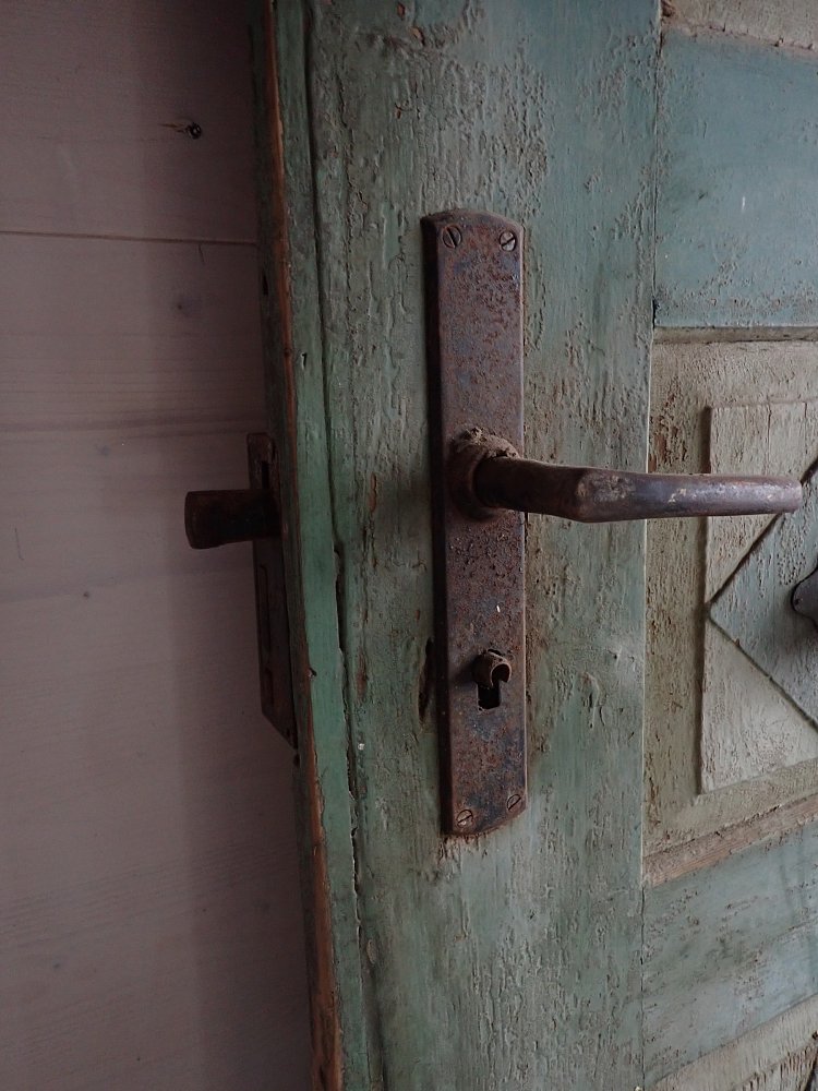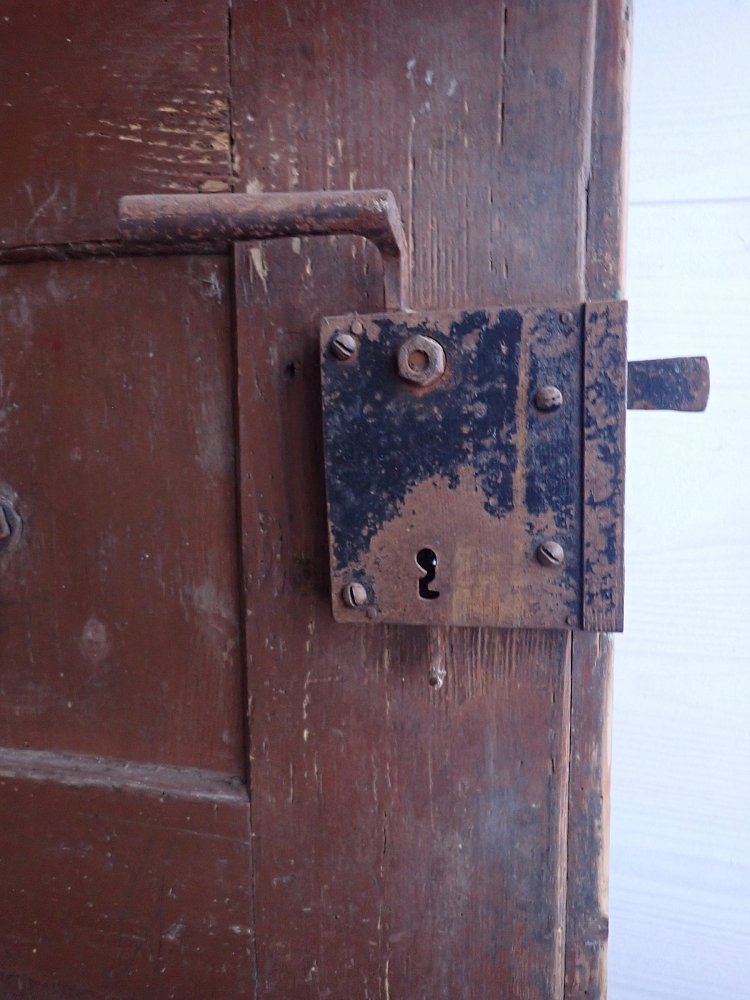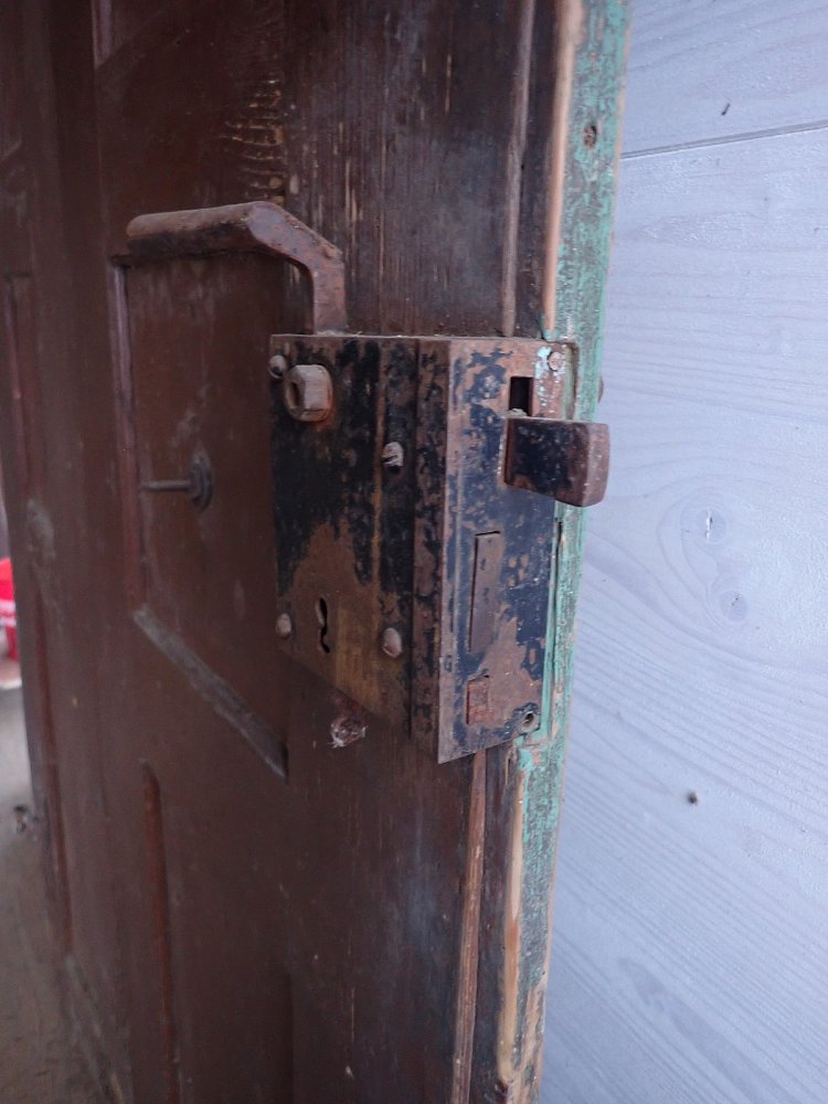 Die Haustür hat auf der Außenseite 6 verzierte Füllungen und auf der Innenseite ist die Tür schlicht gearbeitet mit 6 schlichten Füllungen. Am Festen Flügel sind zwei Schubriegel vorhanden, um die Tür festzustellen. Ein Türschloss und passende Türdrücker sind in der Tür verbaut, leider ohne Schlüssel.