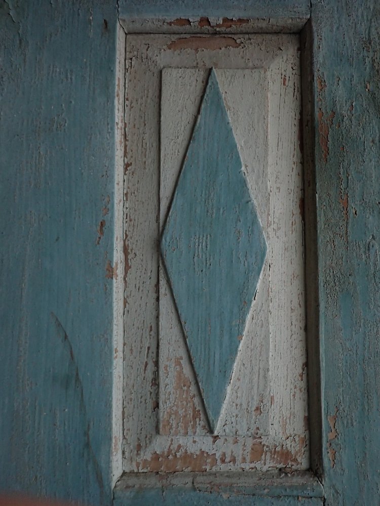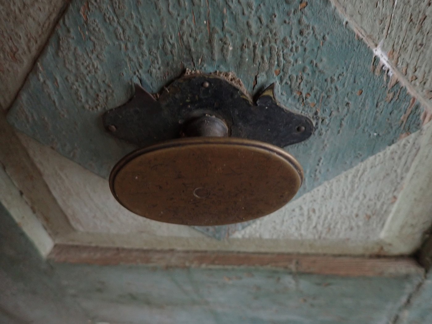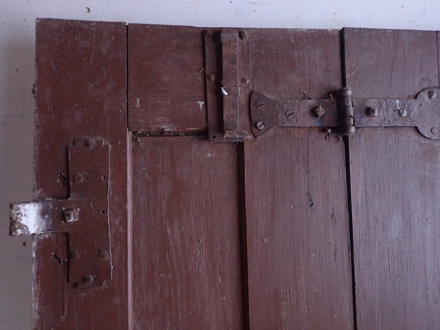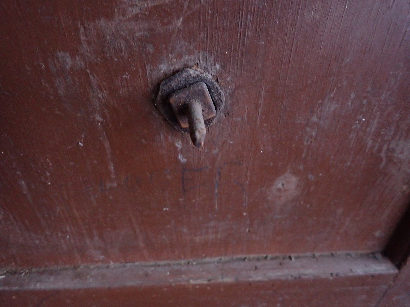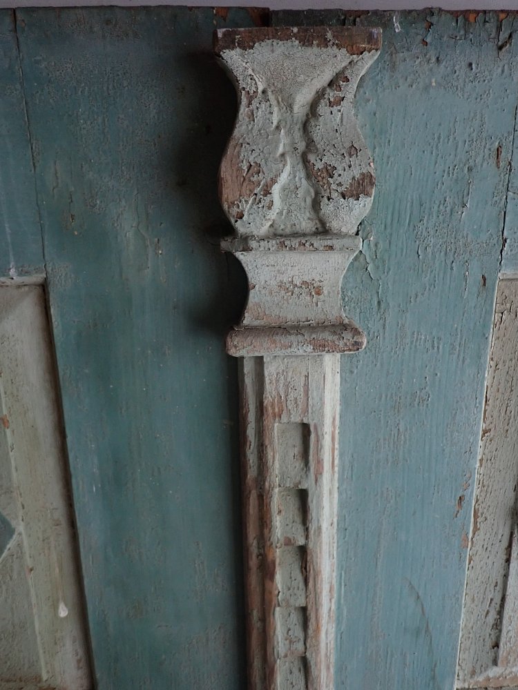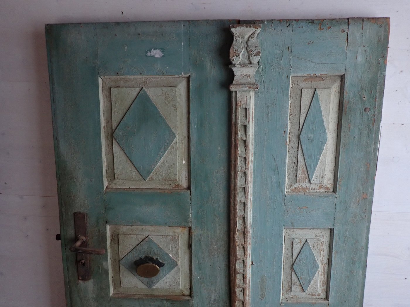 Die Haustür hat auf der Außenseite 6 verzierte Füllungen und auf der Innenseite ist die Tür schlicht gearbeitet mit 6 schlichten Füllungen. Am Festen Flügel sind zwei Schubriegel vorhanden, um die Tür festzustellen. Ein Türschloss und passende Türdrücker sind in der Tür verbaut, leider ohne Schlüssel.