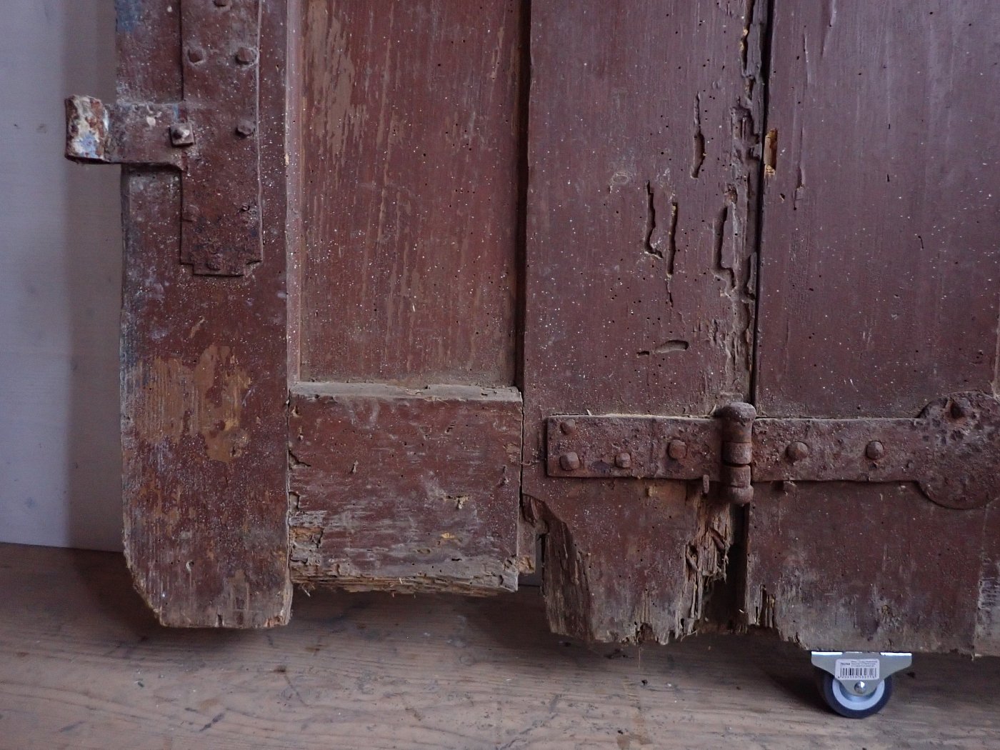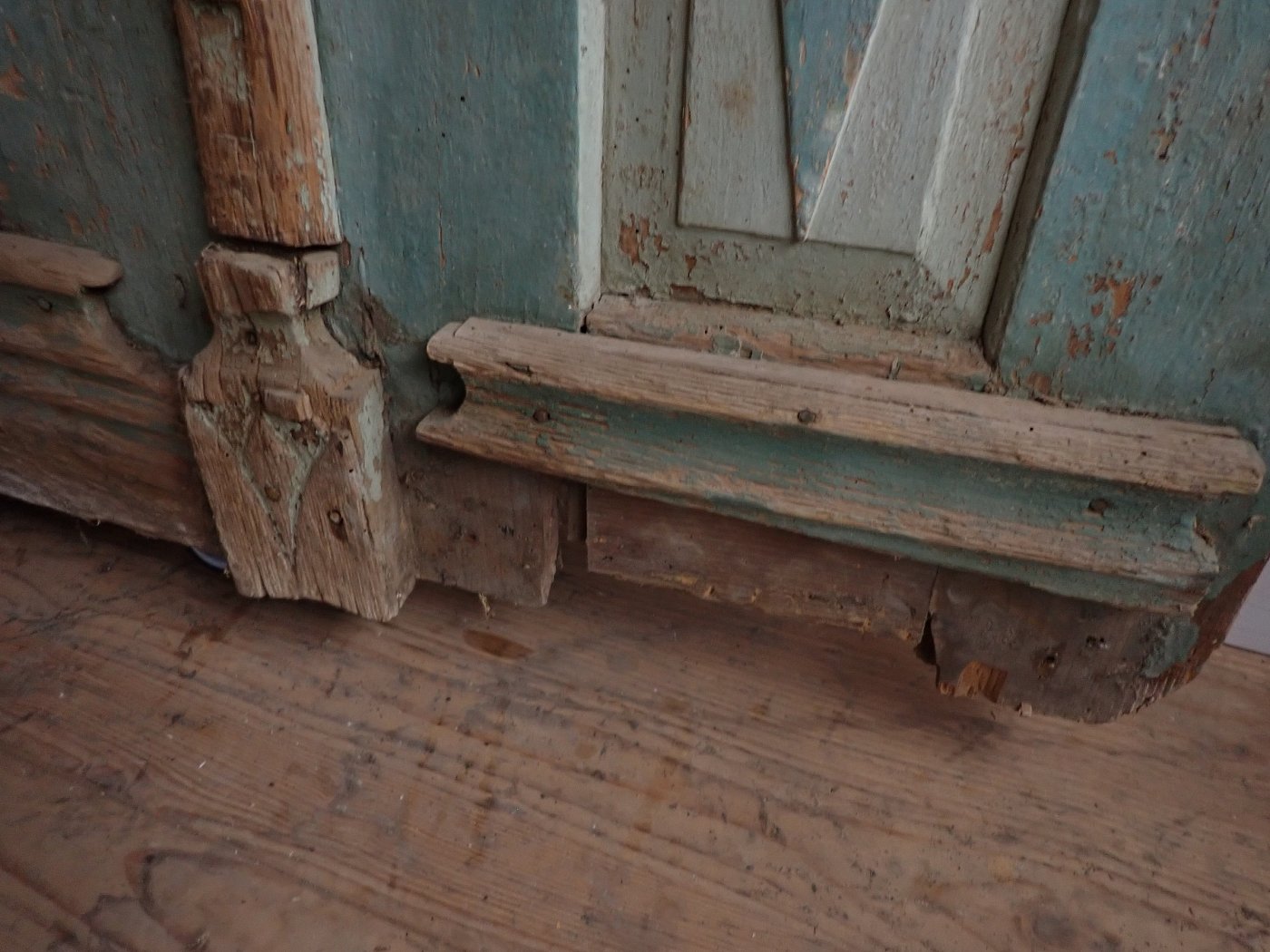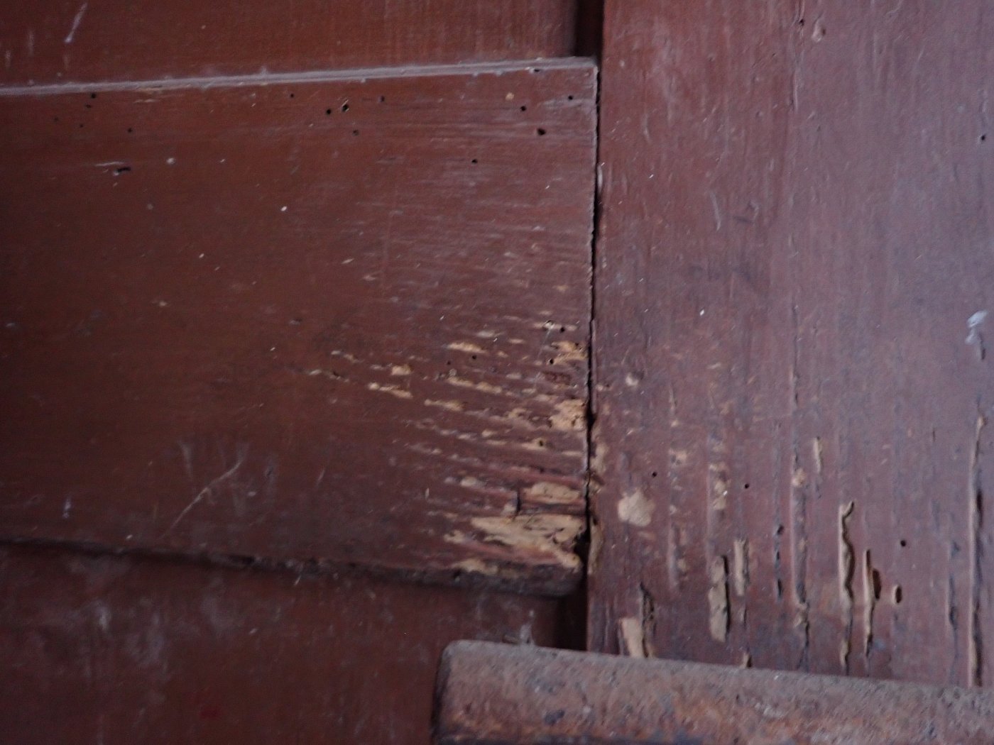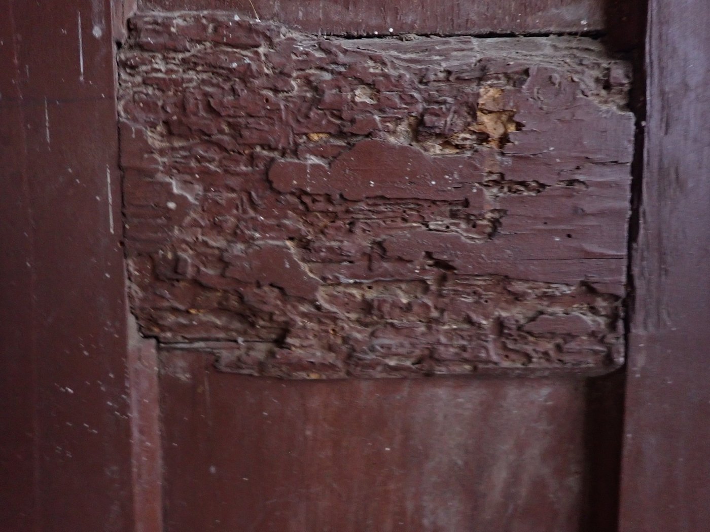 Die Tür muss vor dem Wiedereinbau etwas bearbeitet werden. Es sind an mehreren Stellen Holzbock Löcher und am Rand unten ausgebrochene Stellen vorhanden. Auf der Außenseite fehlt ein Stück vom Wetterschenkel. Stellenweise geht der Lack an der Tür ab.