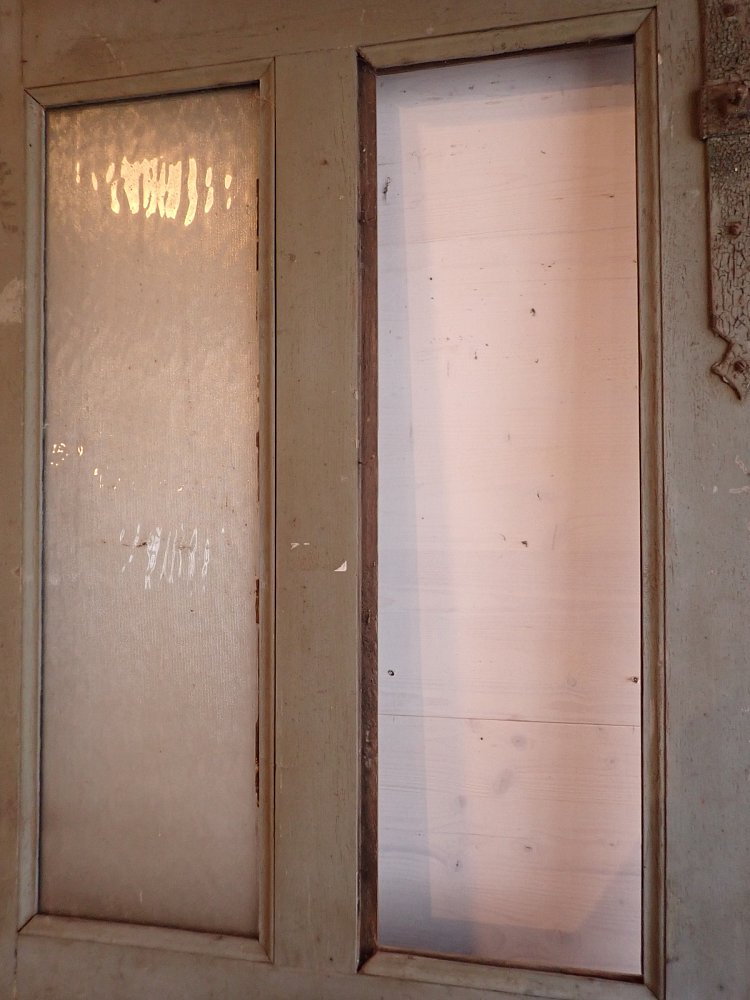 Die Tür ist aus Eiche gefertigt und hat zwei markante, große Lichtöffnungen mit klarem Strukturglas. Im unteren Bereich sind zwei vertikale, dekorative Holzfüllungen auf der Vorderseite. Leider ist eines der Gläser der Lichtöffnung nicht vorhanden. Außerdem müssten Türklinken separat besorgt werden, aber das dürfte kein Problem sein, denn bei unserem Türzubehör lässt sich bestimmt etwas Passendes dafür finden.
