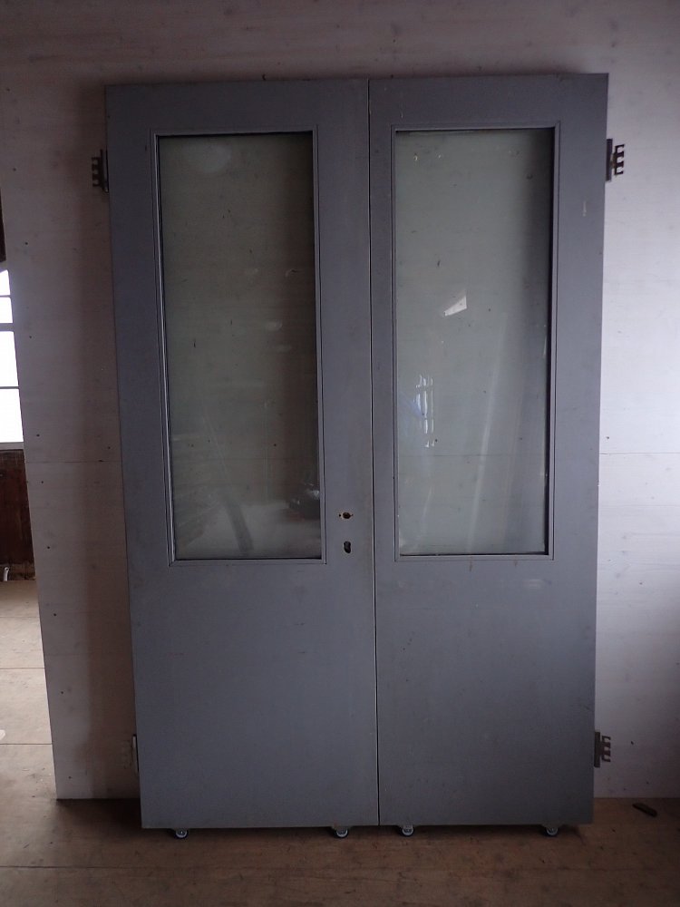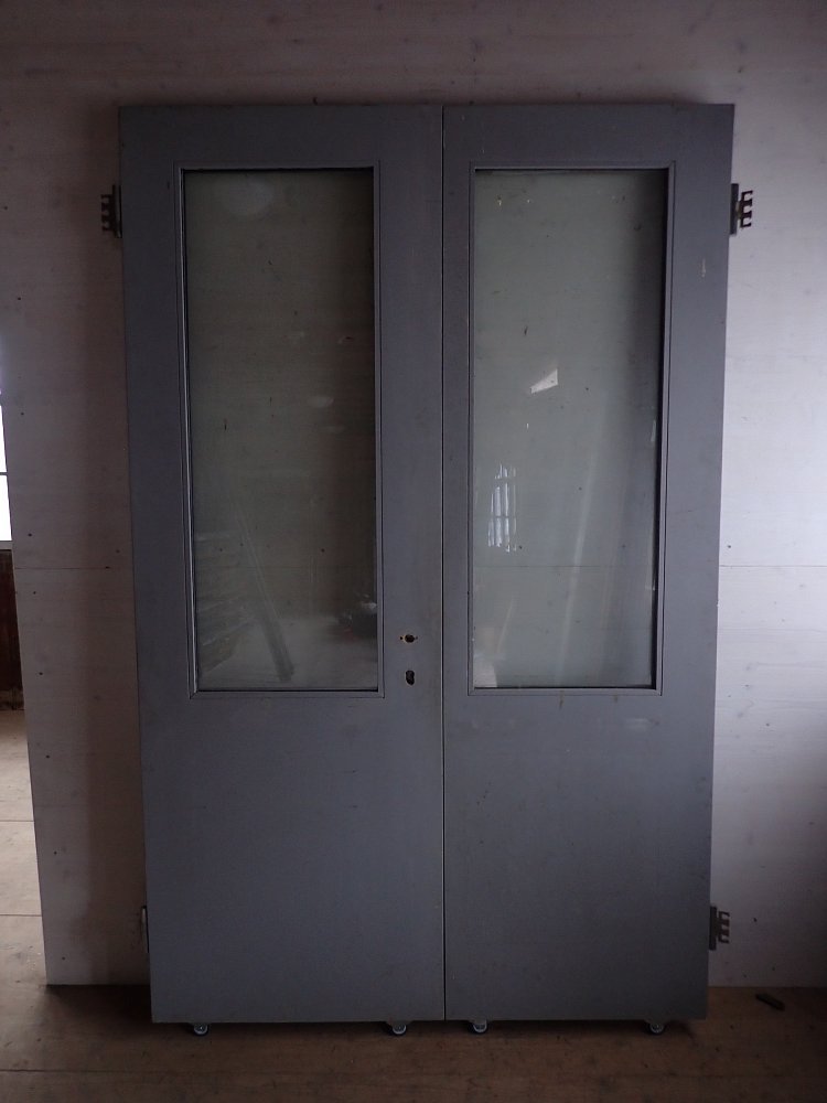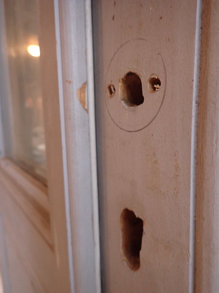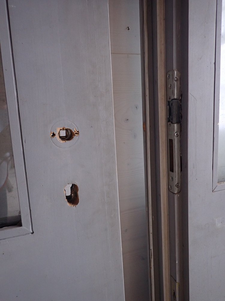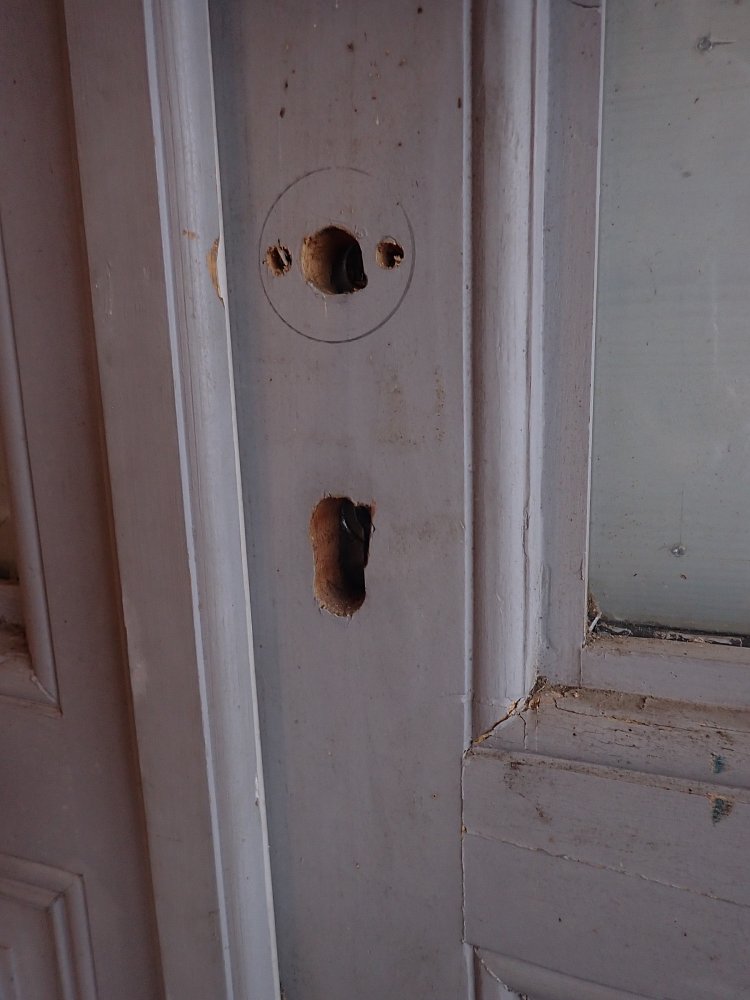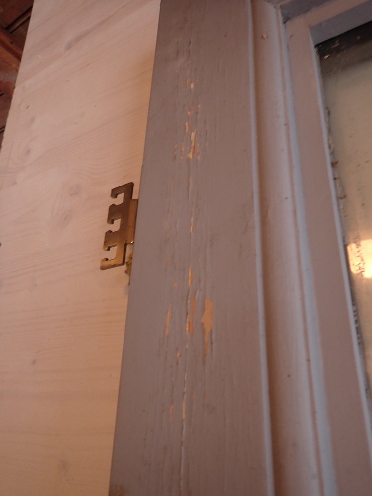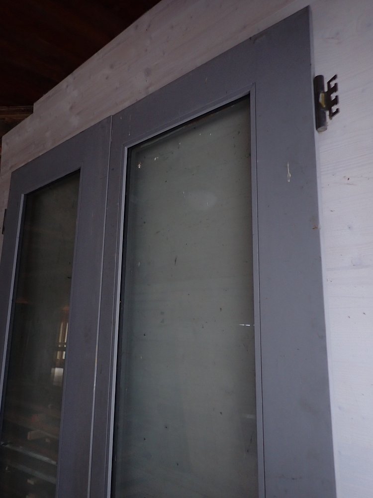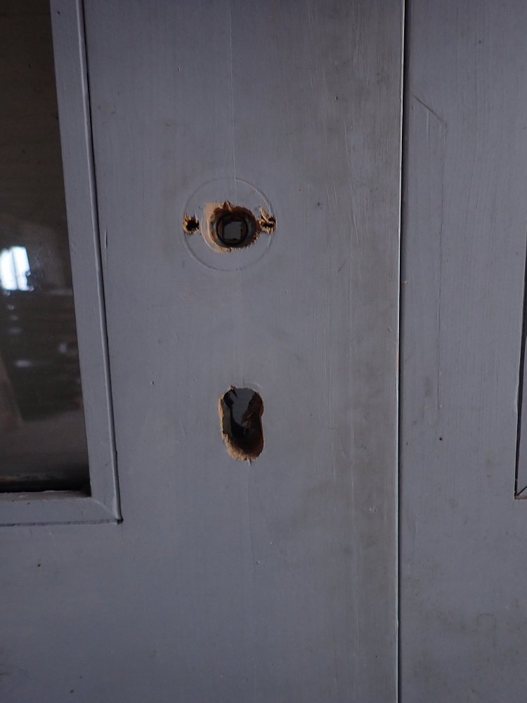 Die Haustür hat zwei Holzfüllungen und zwei Glasfüllungen, welche mit neueren doppelverglasten Scheiben ausgestattet sind. Auf der Innenseite sind nur die zwei Glasfüllungen und keine Holzfüllungen zu sehen. Die Kloben der Tür und das Schloss sind neu und benötigen nur noch das passende Einsteckschloss mit den Passenden Türdrückern.