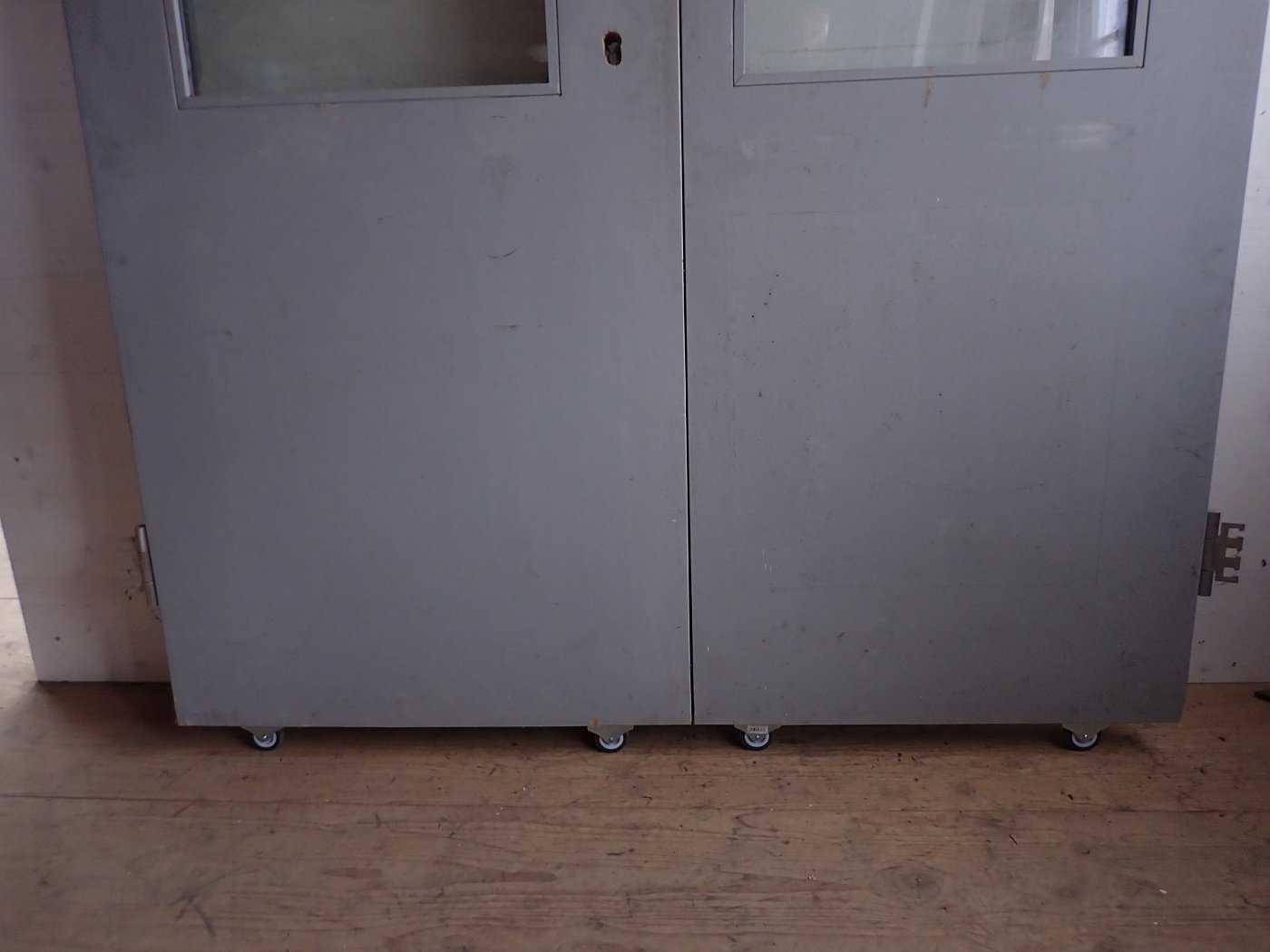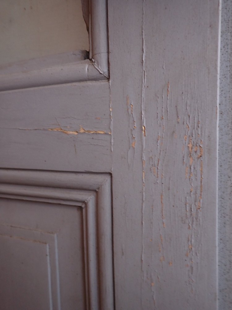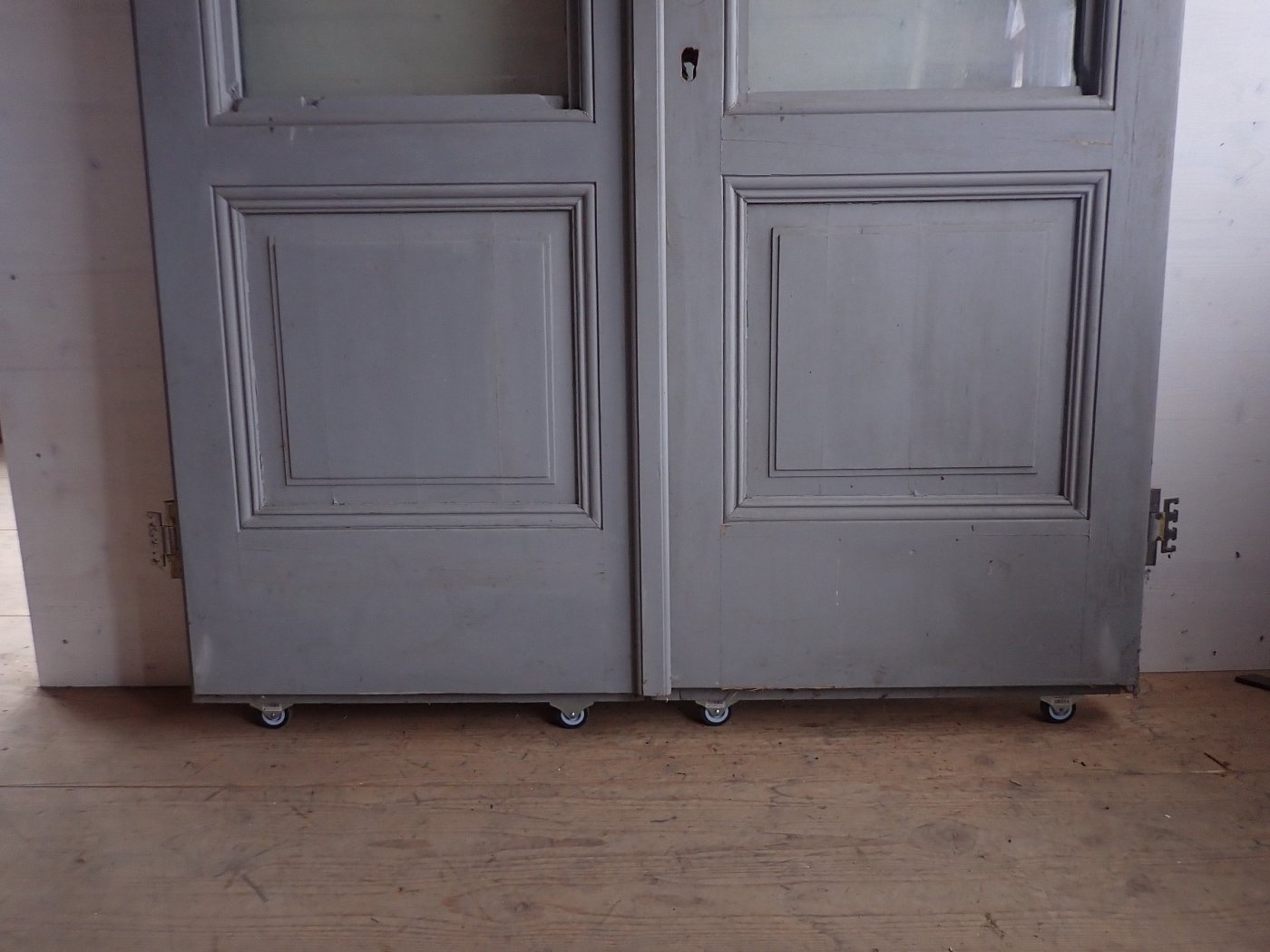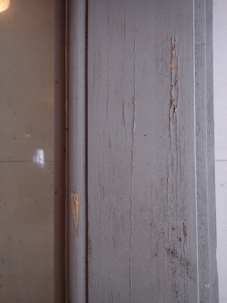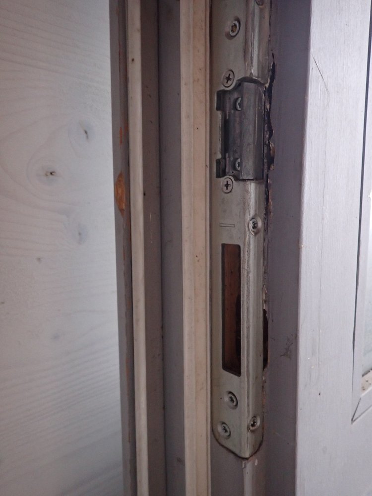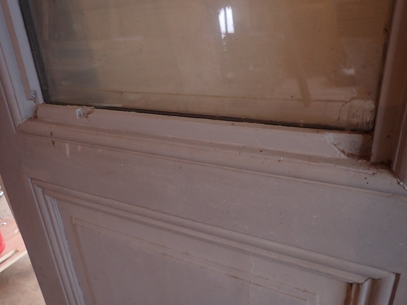 Die Haustür hat zwei Holzfüllungen und zwei Glasfüllungen, welche mit neueren doppelverglasten Scheiben ausgestattet sind. Auf der Innenseite sind nur die zwei Glasfüllungen und keine Holzfüllungen zu sehen. Die Kloben der Tür und das Schloss sind neu und benötigen nur noch das passende Einsteckschloss mit den Passenden Türdrückern.