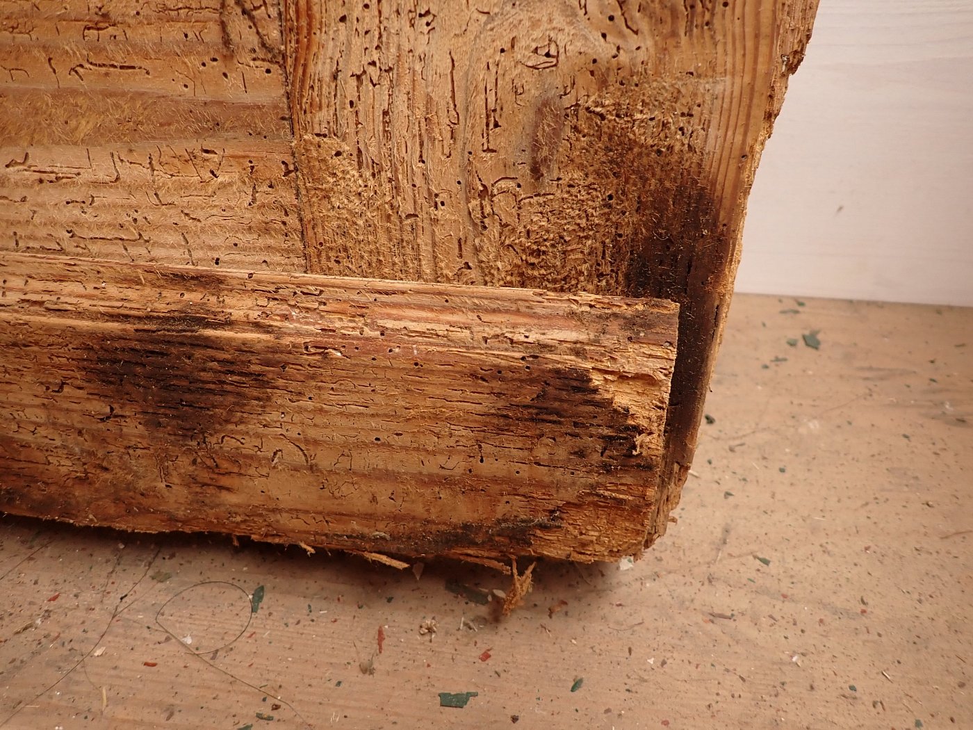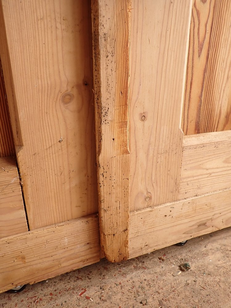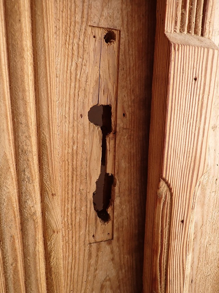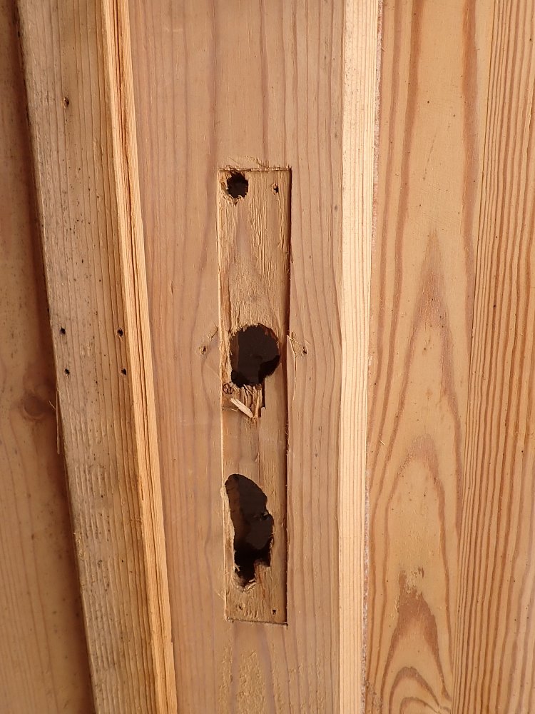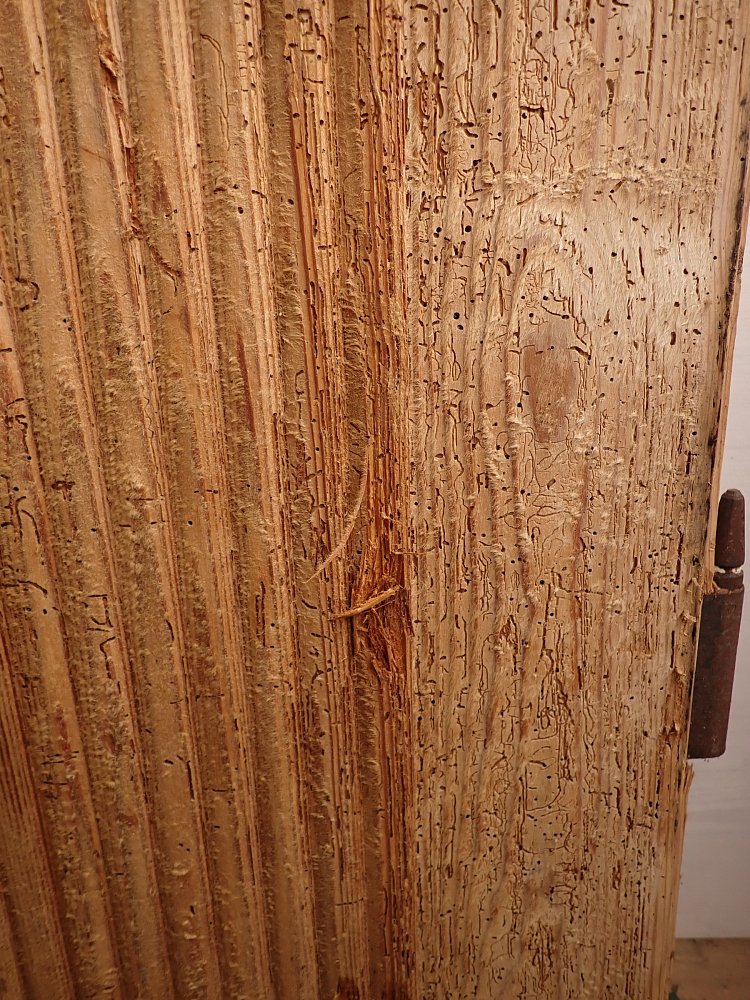 Auf der gesamten Fläche gibt es einige Fraßspuren des Holzwurms. Wer auf Nummer sicher gehen will, kann die Tür zur thermischen Behandlung in die Trockenkammer geben.