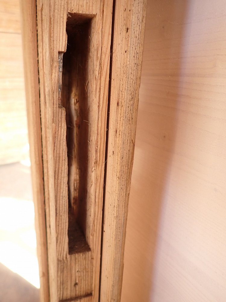 Vor einem Wiedereinbau muss die Tür wohl noch fein geschliffen werden, denn durch das Ablaugen ist die Oberfläche aufgefasert. Die Aussparung, um die Tür mit einem Einsteckschloss auszustatten, ist vorbereitet und eine passende Drückergarnitur lässt sich mit Sicherheit in unserem Fundus aufstöbern.