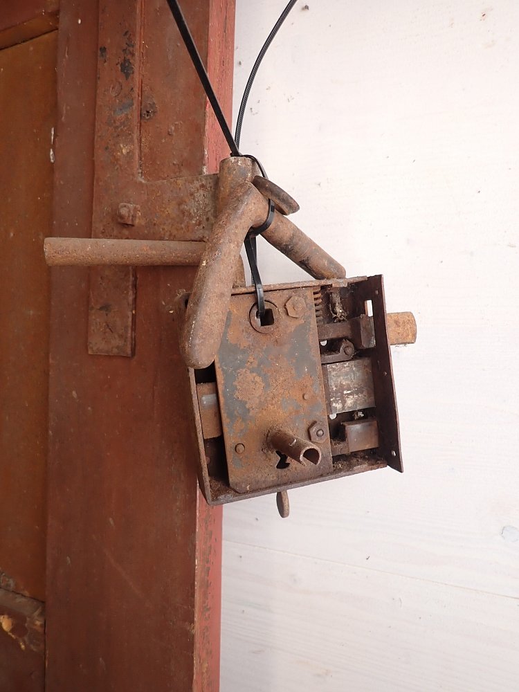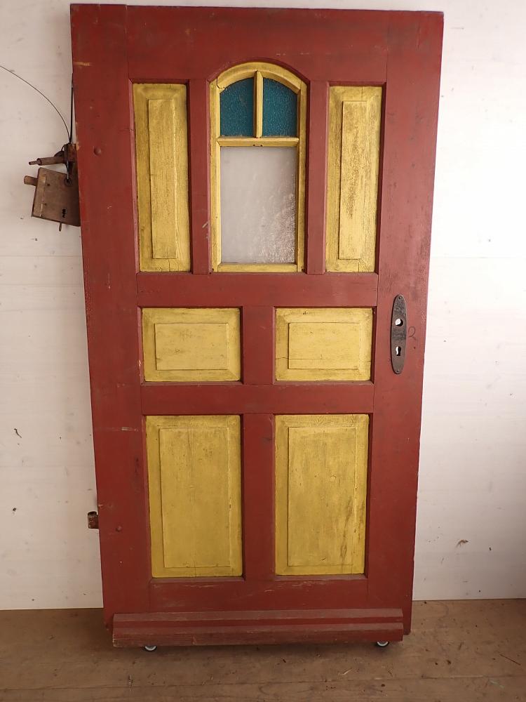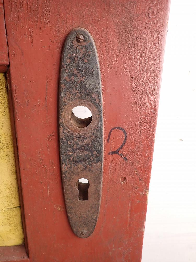 Zugegeben, die Farbgebung ist Geschmacksache, aber durch Ablaugen lassen sich die alten Farbschichten einfach entfernen und die Tür im Anschluss in der Wunschfarbe neu gestalten. Das originale Kastenschloss inkl. Eisendrücker ist vorhanden und muss vor einem Wiedereinbau nur noch montiert werden.