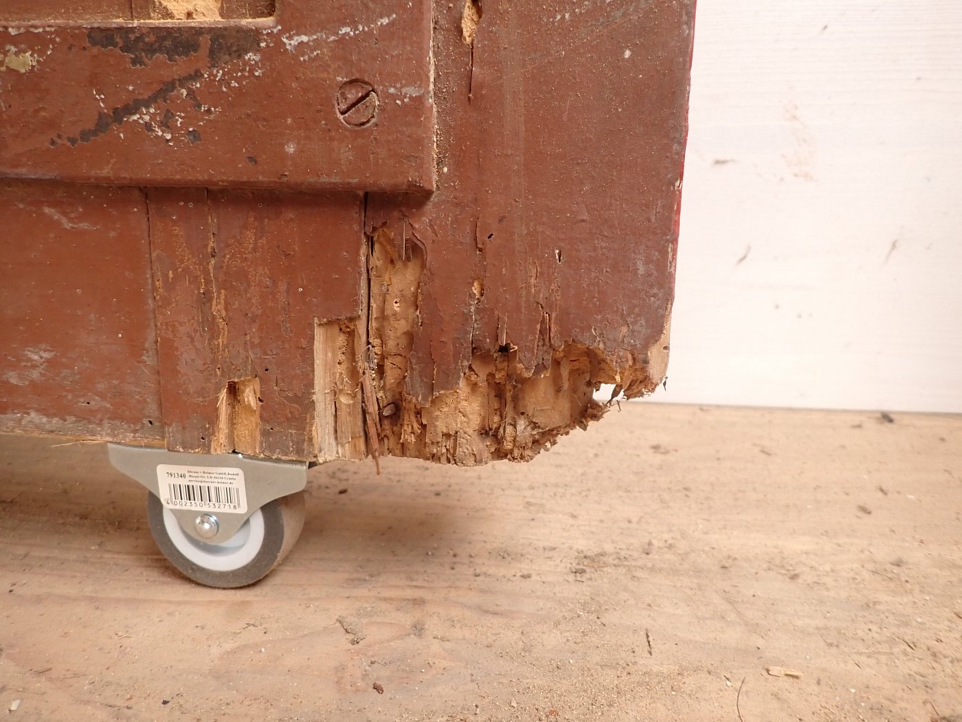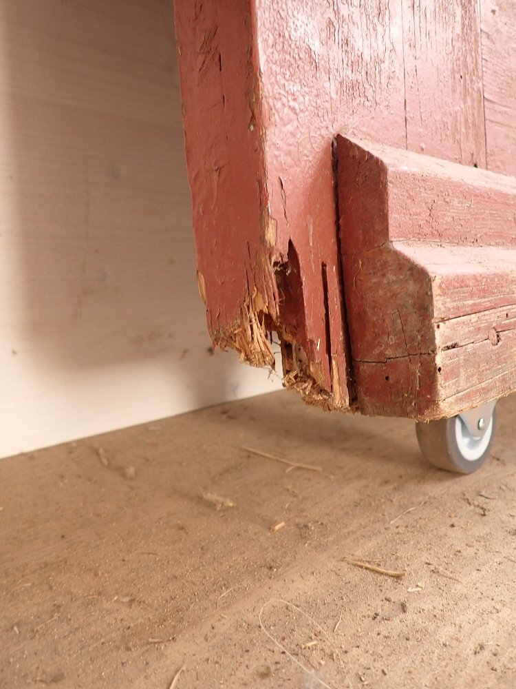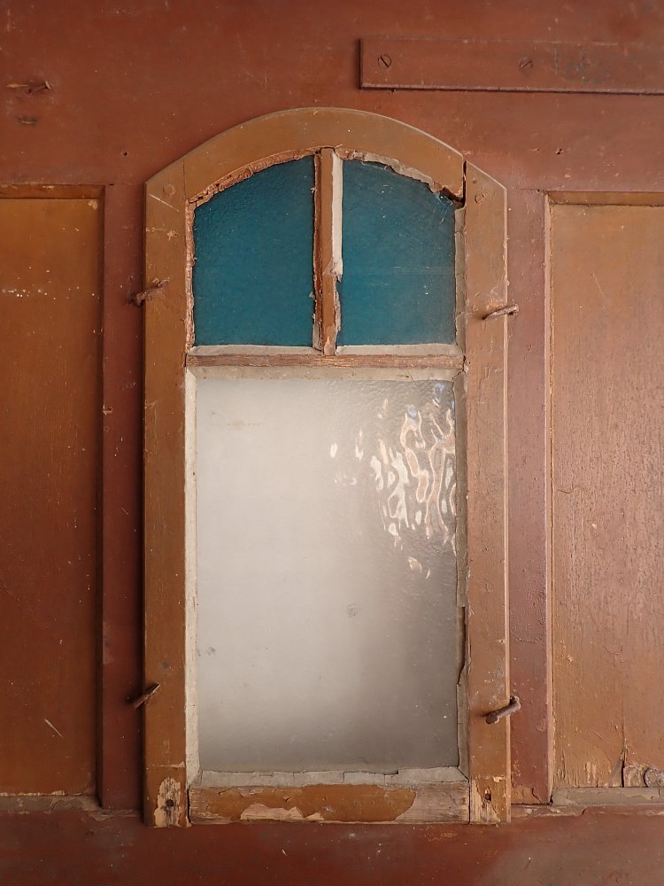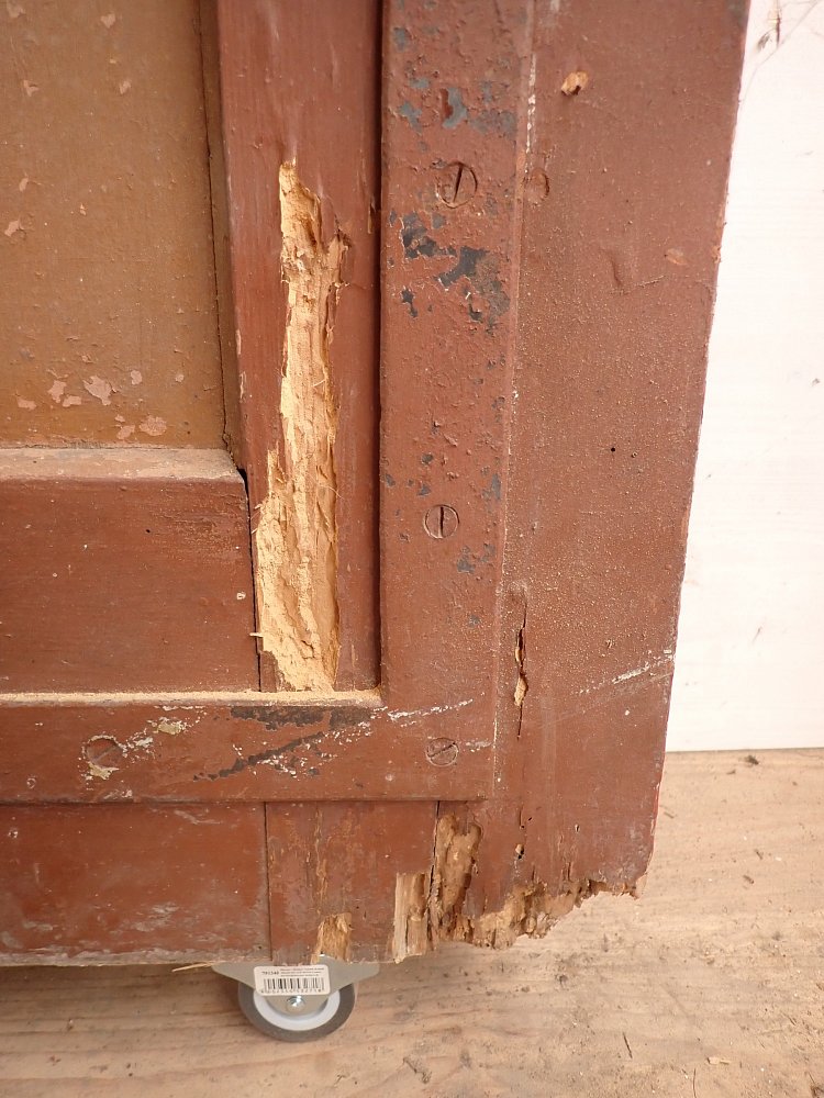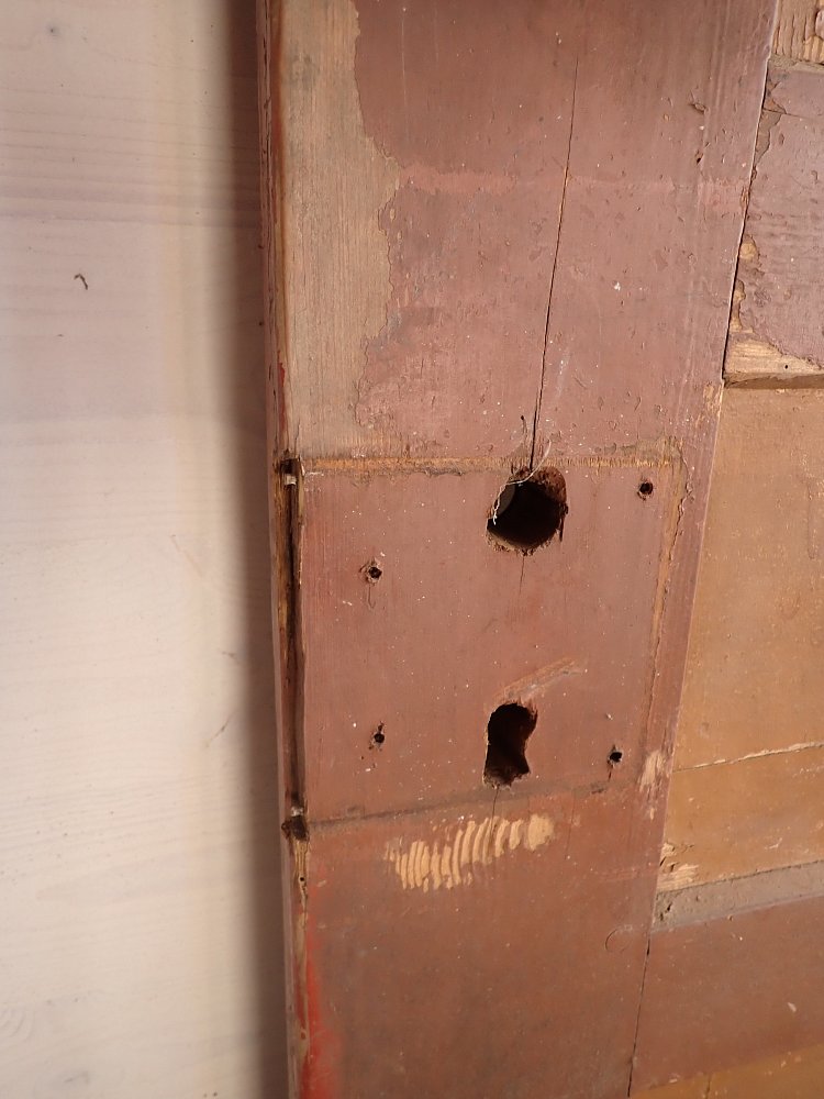 Abgesehen von den Fraßspuren des Holzwurms und einer dadurch brüchigen Ecke im unteren Bereich befindet sich die Tür in einem soliden Bergezustand.