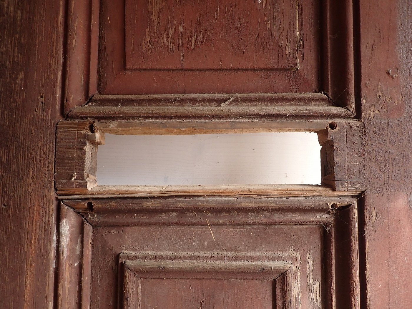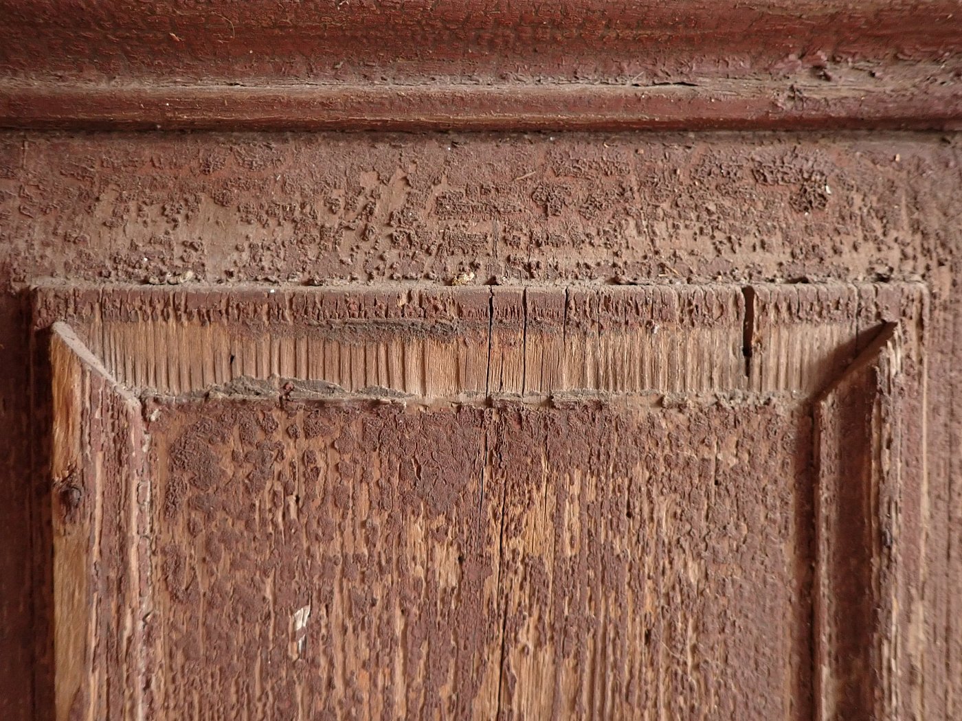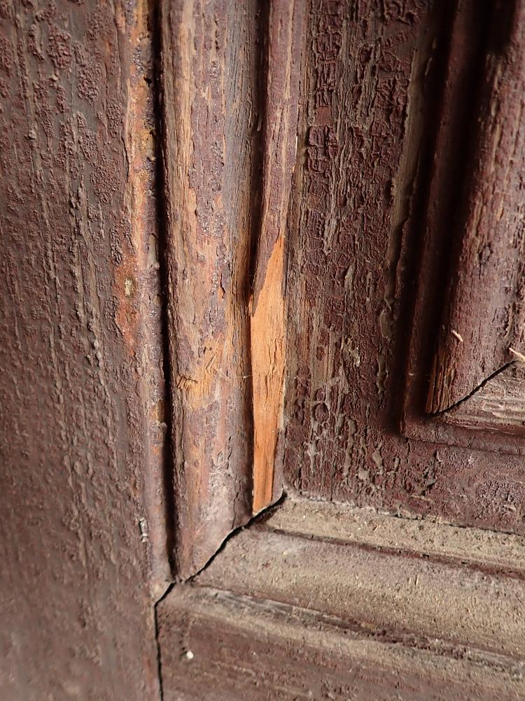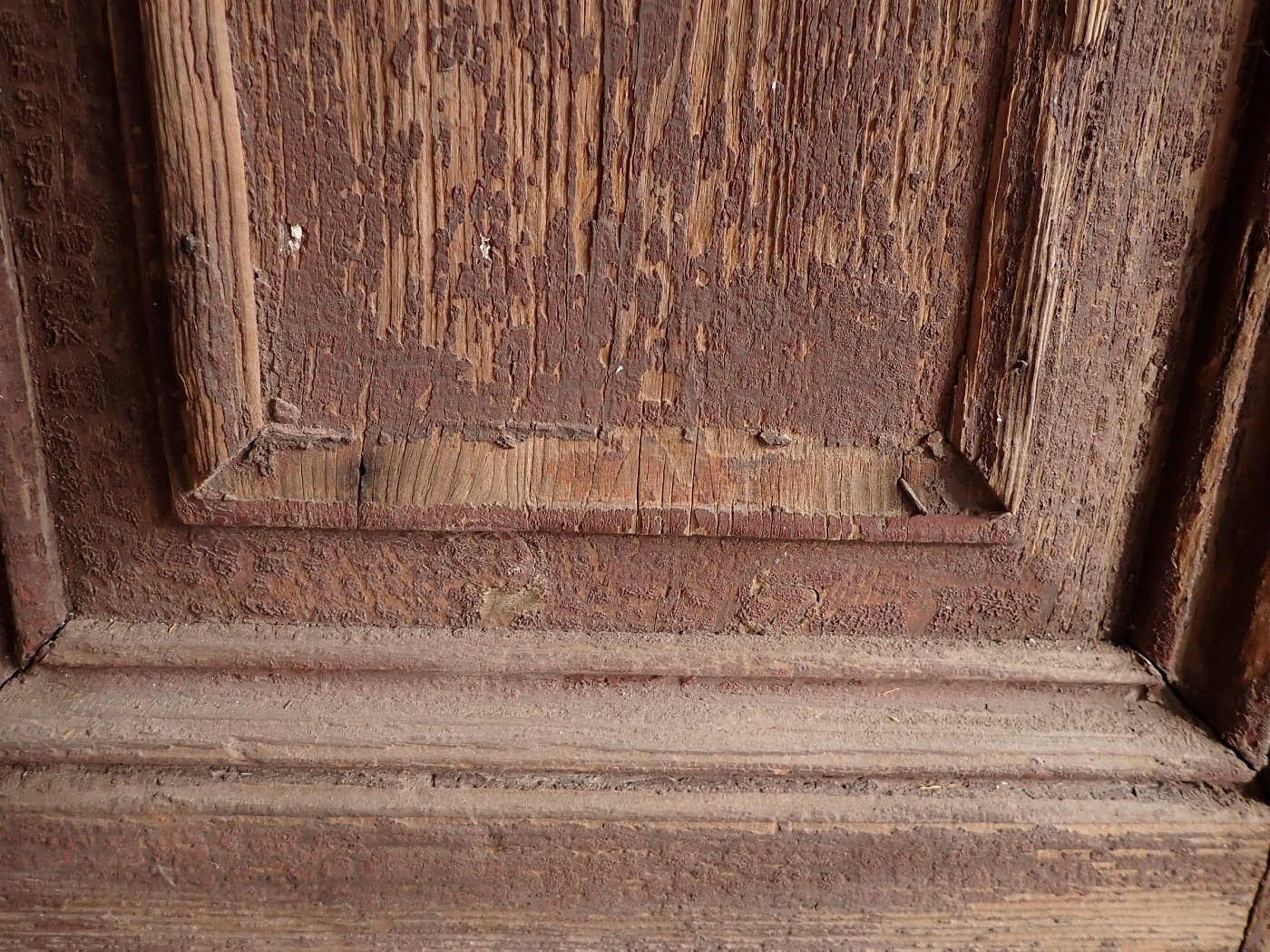 Auch wenn wir die Grundsubstanz der Tür als stabil bezeichnen würden, gibt es vor einem Wiedereinbau noch einiges zu tun. So fehlt beispielsweise im unteren Teil ein Stück des aufgesetzten Pilasters und die eine oder andere kleine Zierleiste an den Füllungen.