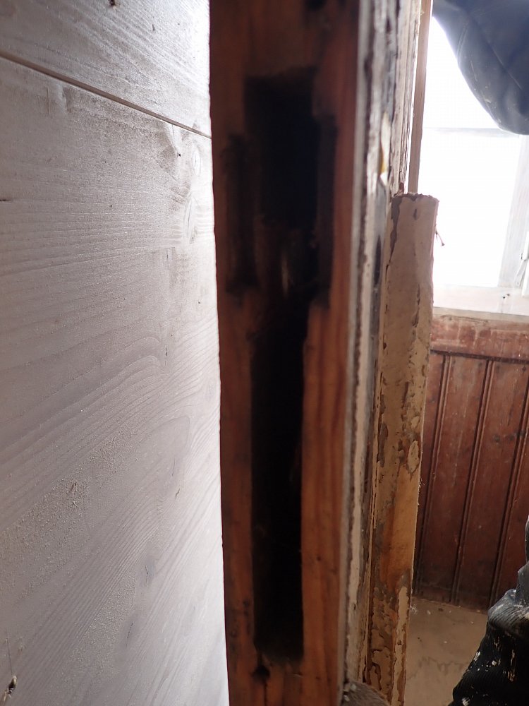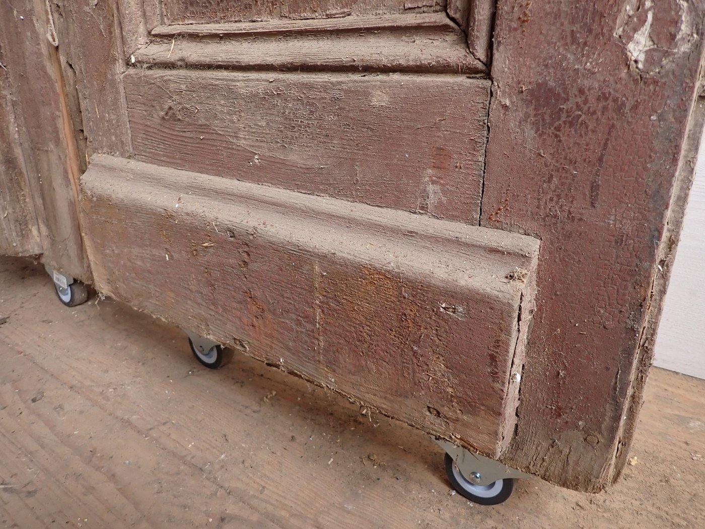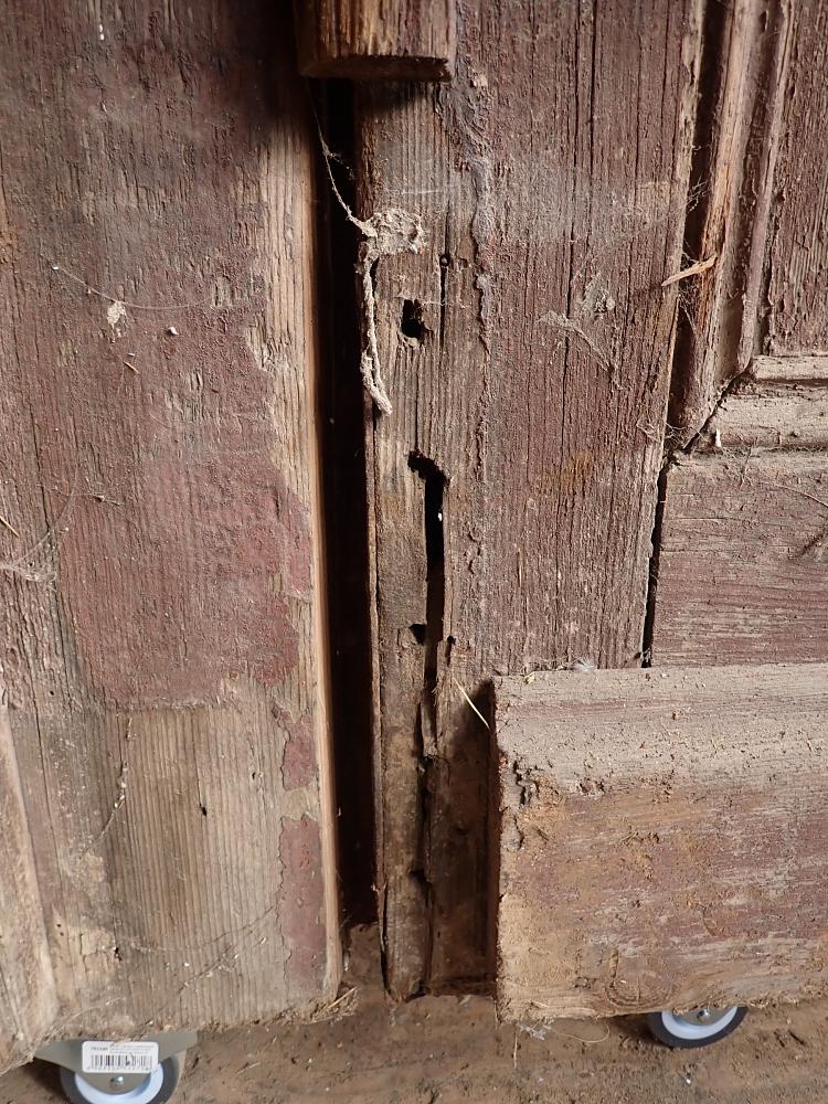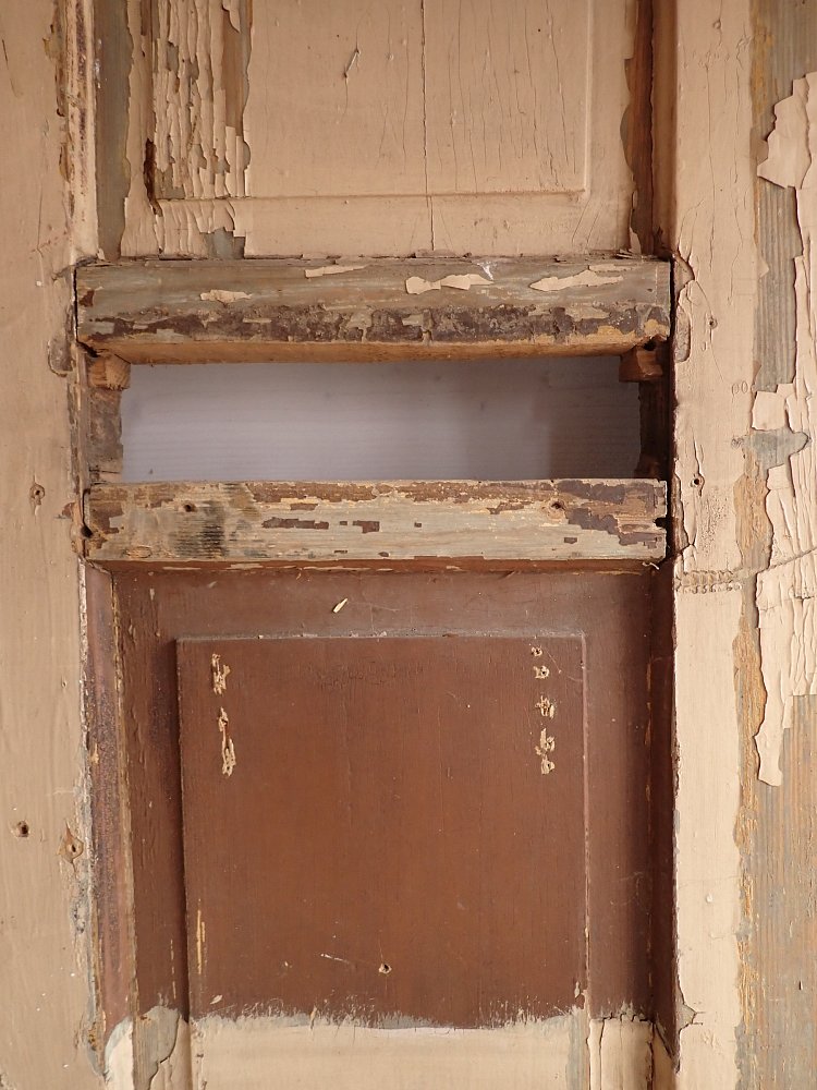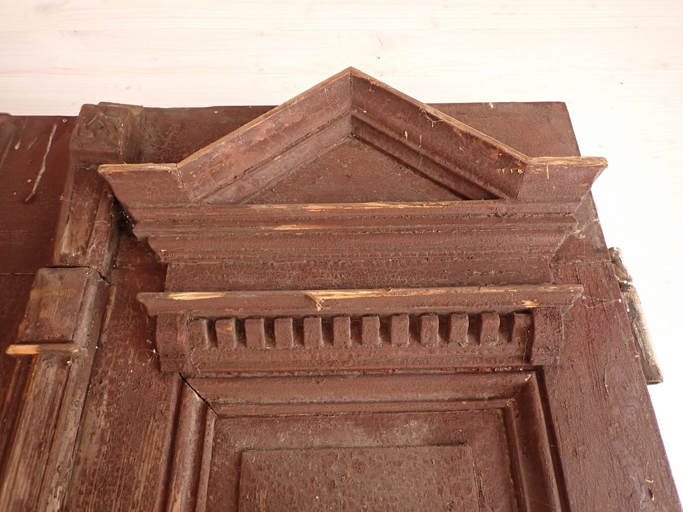 Auch wenn wir die Grundsubstanz der Tür als stabil bezeichnen würden, gibt es vor einem Wiedereinbau noch einiges zu tun. So fehlt beispielsweise im unteren Teil ein Stück des aufgesetzten Pilasters und die eine oder andere kleine Zierleiste an den Füllungen.
