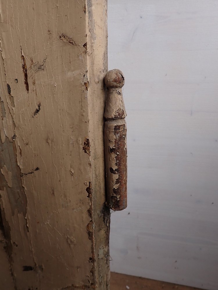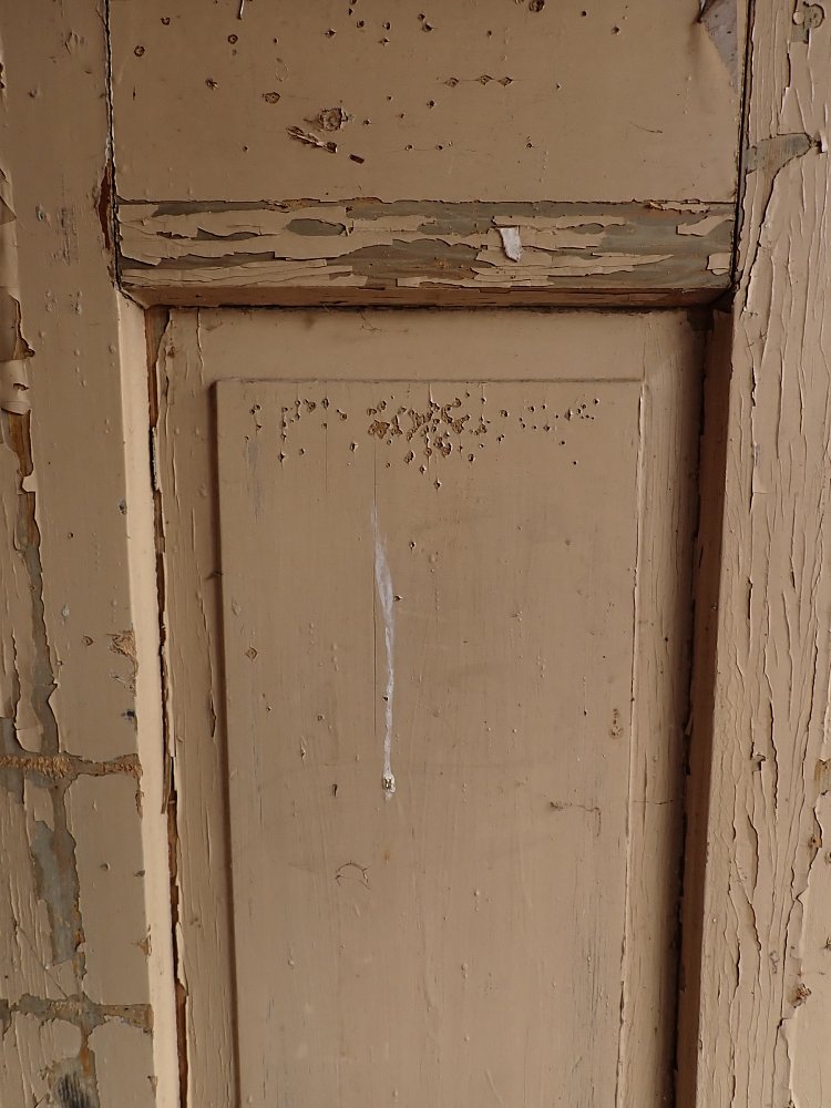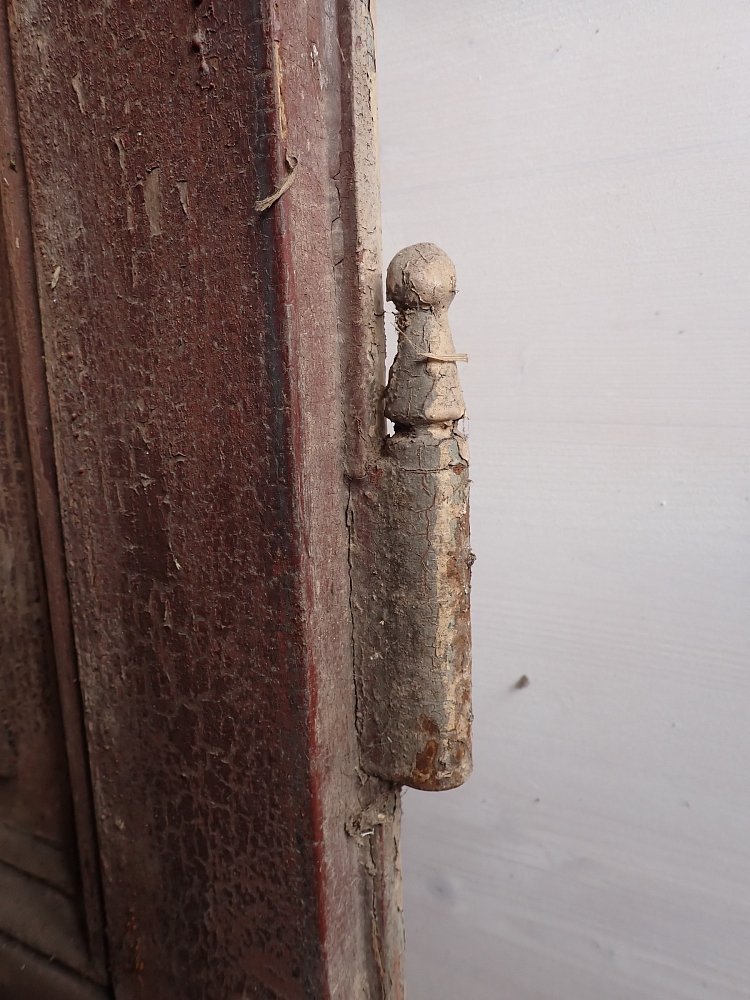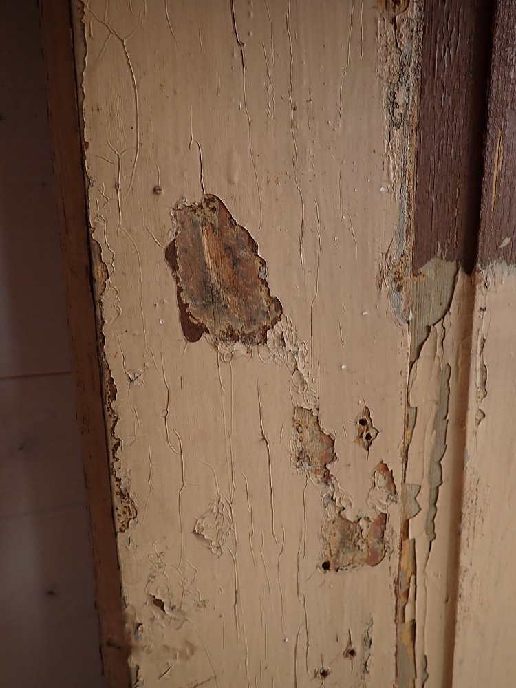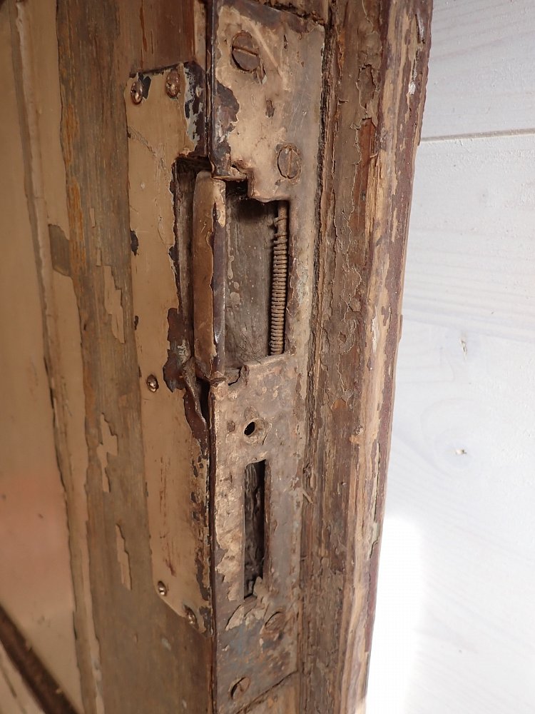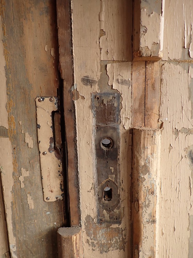Sowohl der rotbraune Lack auf der Außenseite als auch der beige Lack auf der Türinnenseite haben ihre besten Zeiten definitiv hinter sich und brauchen eine Auffrischung. Hier würde sich ein Ablaugen sicherlich lohnen, um die Tür wieder in neuem alten Glanz erstrahlen lassen.