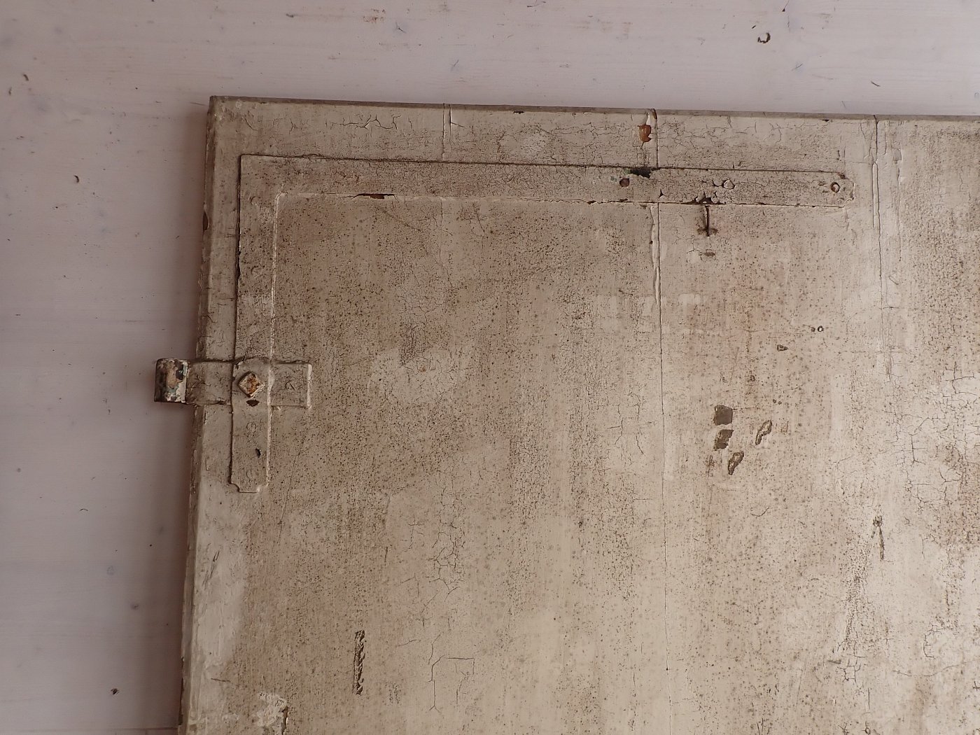 Die Weichholztür ist auf der Außenseite mit vier klassischen, profilierten Kassettenfüllungen gearbeitet. Auf der Innenseite ist sie mit Brettern aufgedoppelt und weiß lackiert.