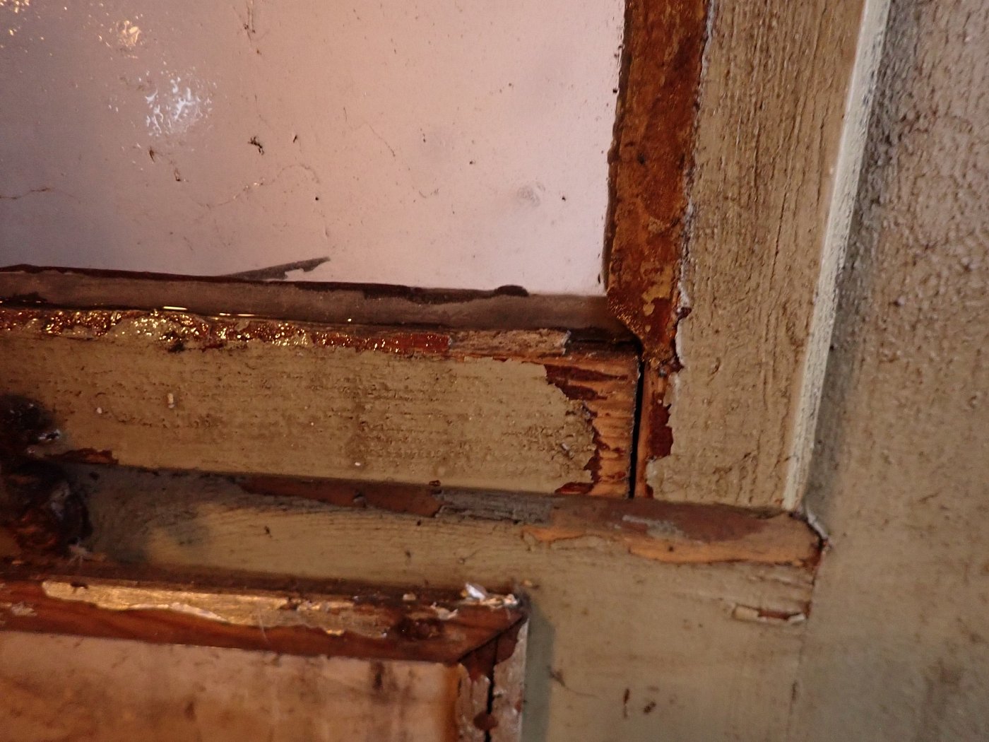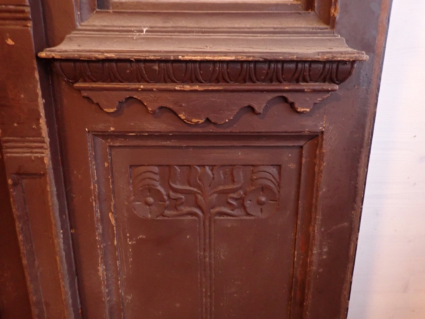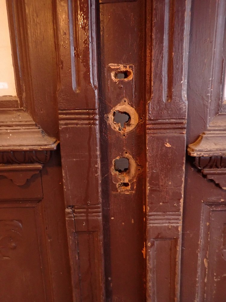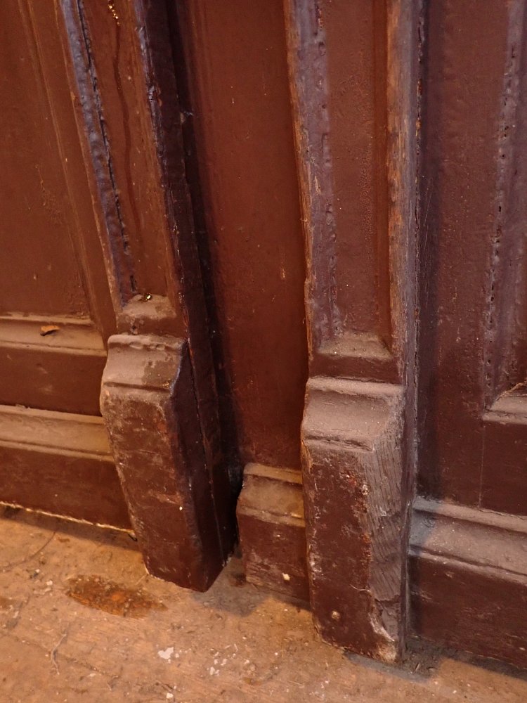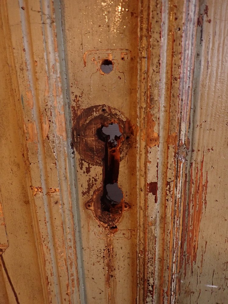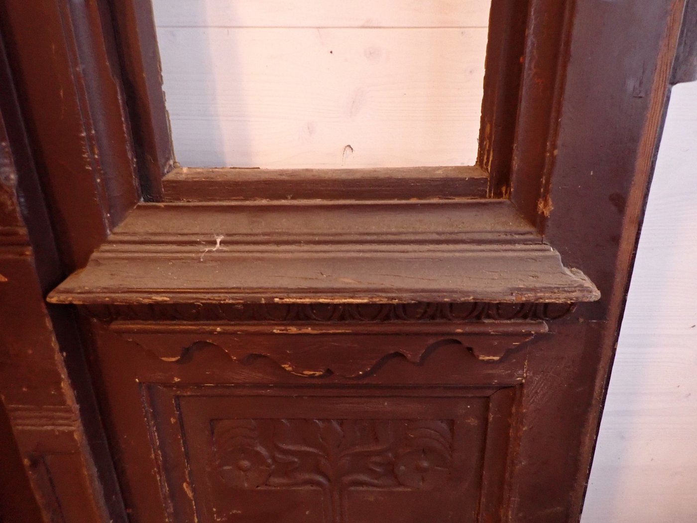 Ungewöhnlicherweise befindet sich der Lack auf der Türinnenseite in einem deutlich schlechteren Zustand als der braune Lack auf der Außenseite. Hier können wir ein Ablaugen der Tür empfehlen, um danach in der weiteren Gestaltung komplett frei zu sein.