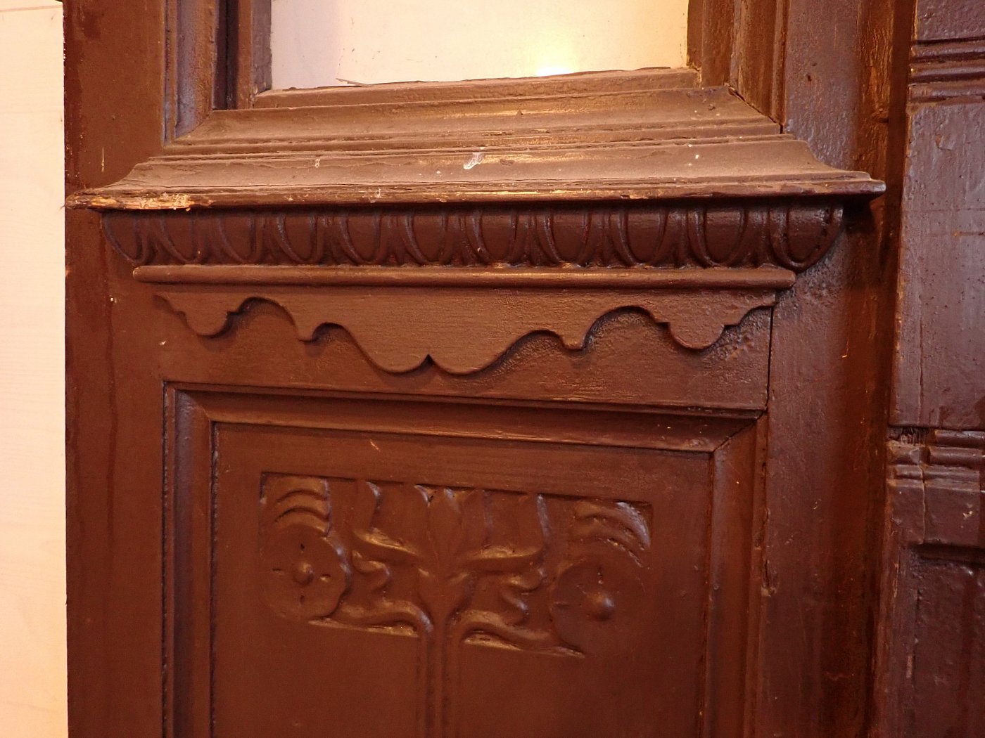 Die Weichholztür ist auf der Außenseite äußerst dekorativ gearbeitet und mit Schnitzereien sowie profilierten Kassetten und Leisten verziert. Wie häufig bei zweiflügeligen Türen sind mittig zwei Pilaster aufgebracht, die ebenfalls mit Schnitzereien verziert sind.