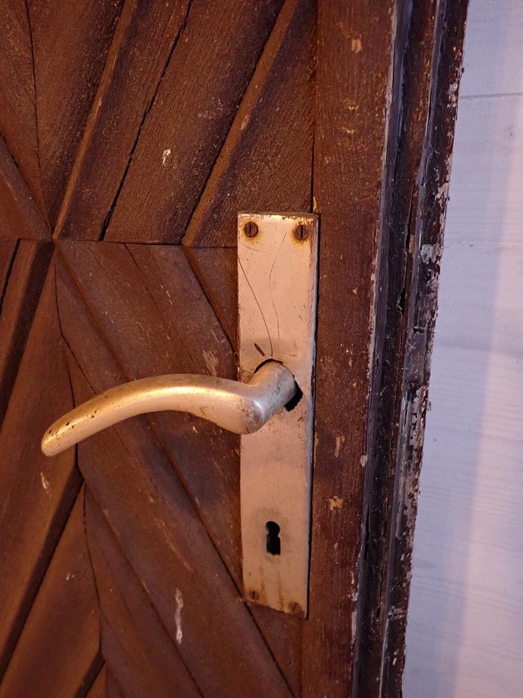 Aktuell ist die Tür zwar mit einer Drückergarnitur ausgestattet, doch dabei handelt es sich sicherlich um eine erst später ergänzte Türklinke. Wer gerne wieder eine alte und zur Tür passende Garnitur möchte, kann sich gerne in unserem Fundus umschauen und findet bestimmt einen schönen Ersatz.