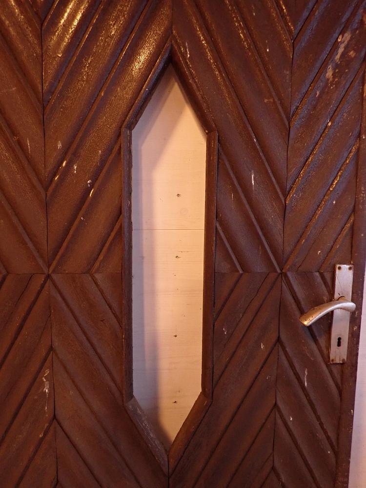 Die Tür ist auf der Außenseite mit Eichenleisten im Fischgrätmuster belegt und hat mittig einen Fensterausschnitt. Auf der Innenseite ist die Tür nicht nur andersfarbig lackiert, sondern auch aus Weichholz gearbeitet.