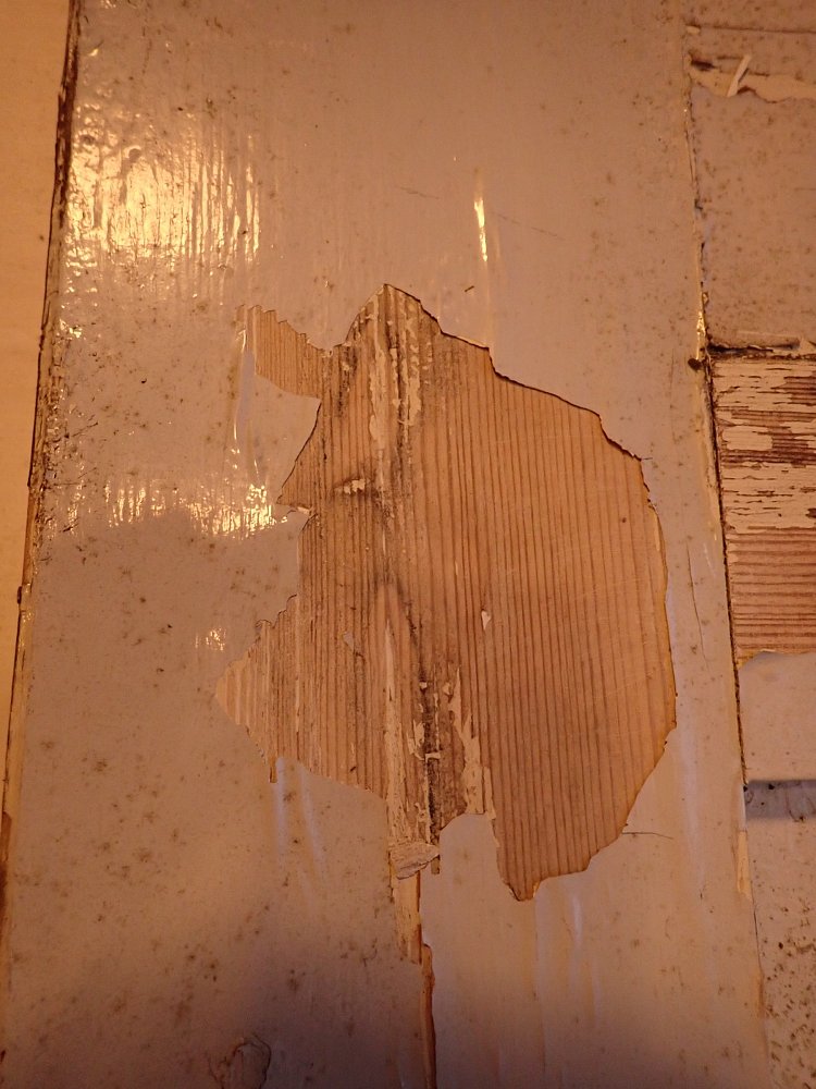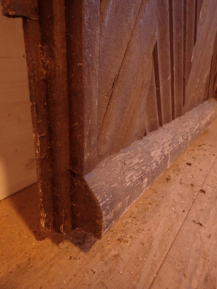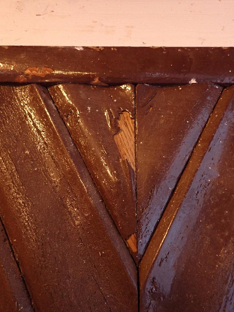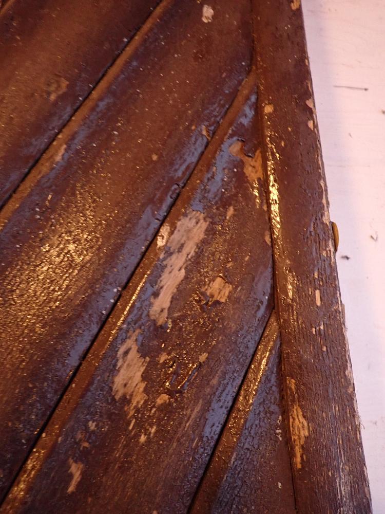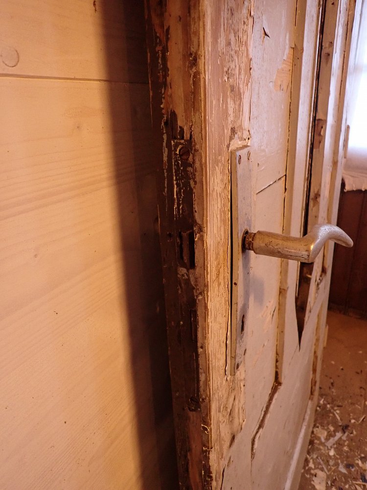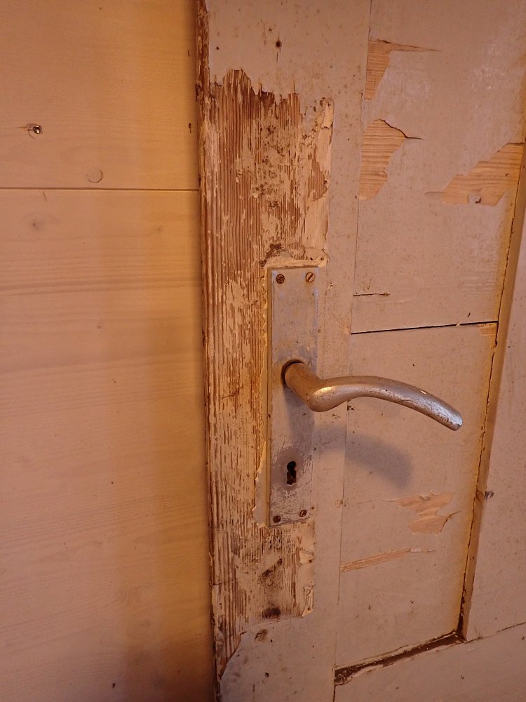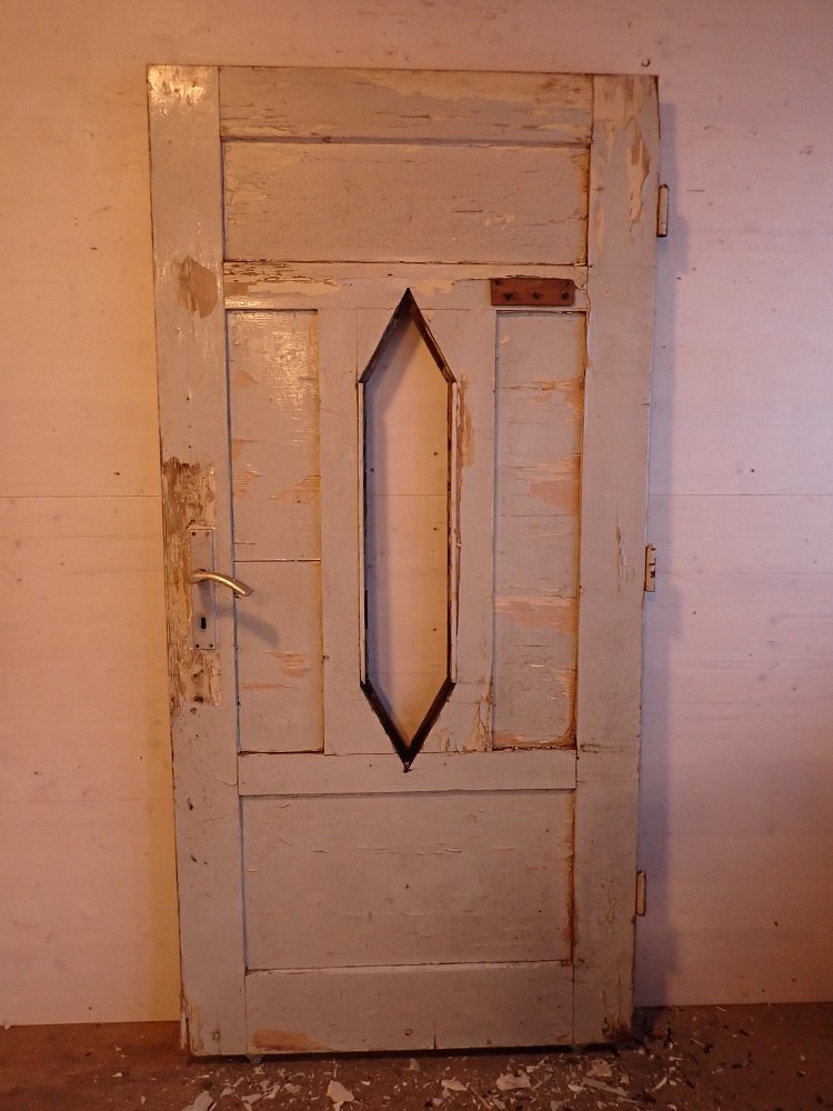 Insgesamt befindet sich die Tür in einem guten Bergezustand und braucht vor einem Wiedereinbau lediglich kleine Schönheitsreparaturen. Die alten und stellenweise abblätternden Lackschichten lassen sich gut durch Ablaugen entfernen. Dank der aufgesetzten Holzleisten lässt sich auch die fehlende Fensterscheibe einfach ersetzen.