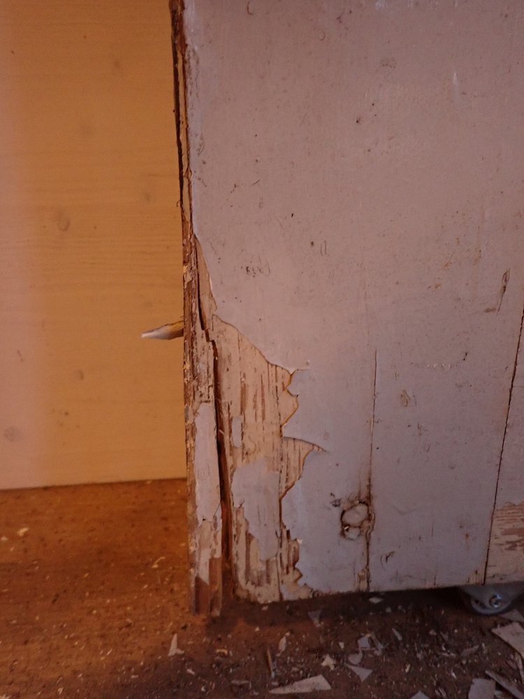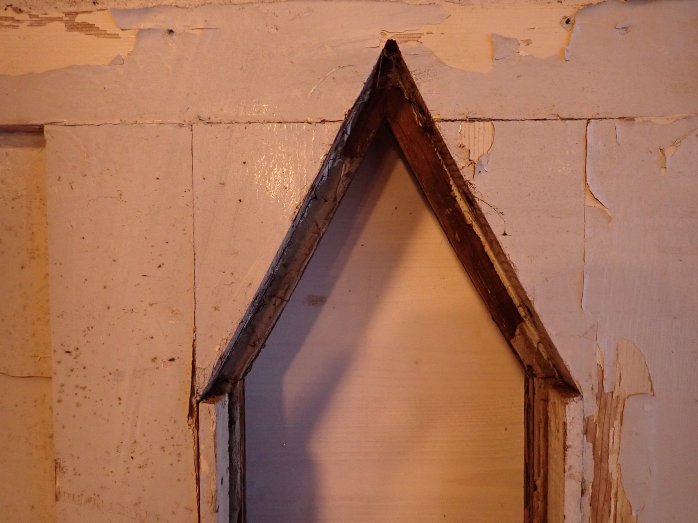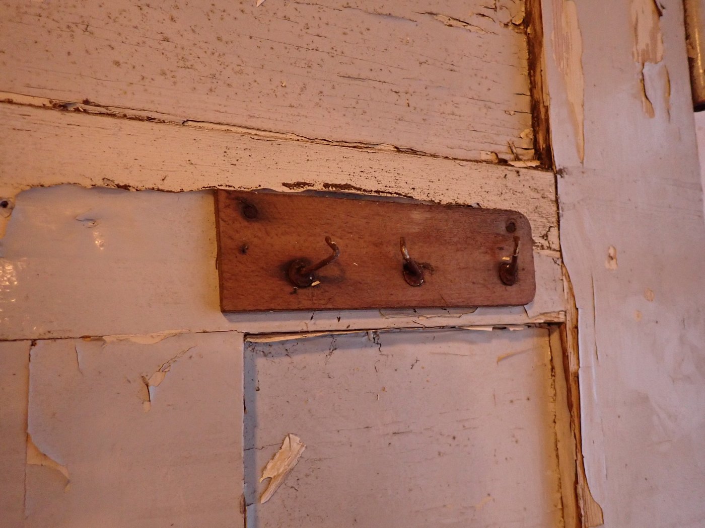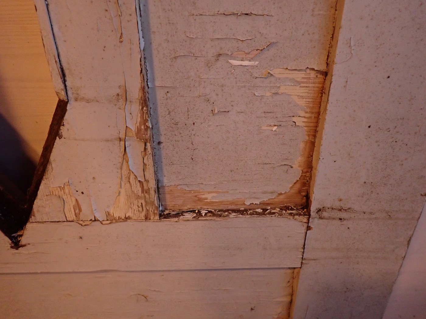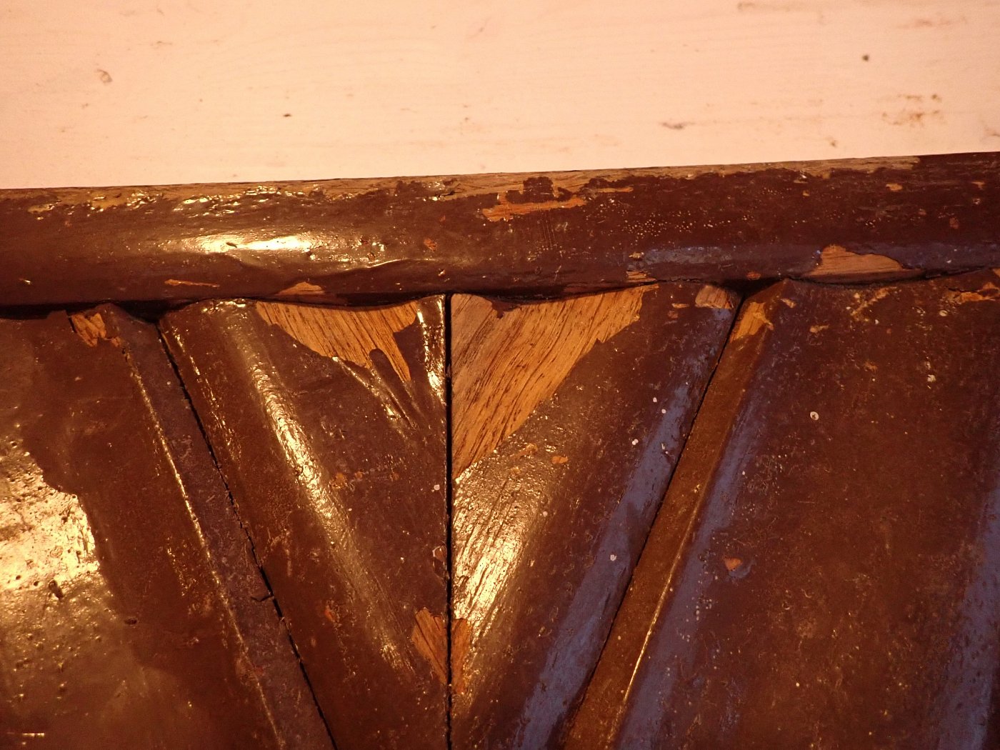 Insgesamt befindet sich die Tür in einem guten Bergezustand und braucht vor einem Wiedereinbau lediglich kleine Schönheitsreparaturen. Die alten und stellenweise abblätternden Lackschichten lassen sich gut durch Ablaugen entfernen. Dank der aufgesetzten Holzleisten lässt sich auch die fehlende Fensterscheibe einfach ersetzen.