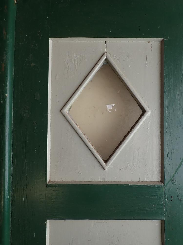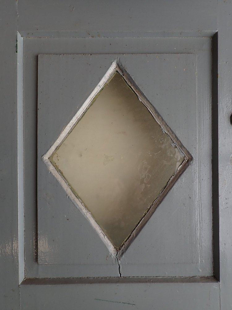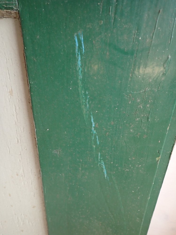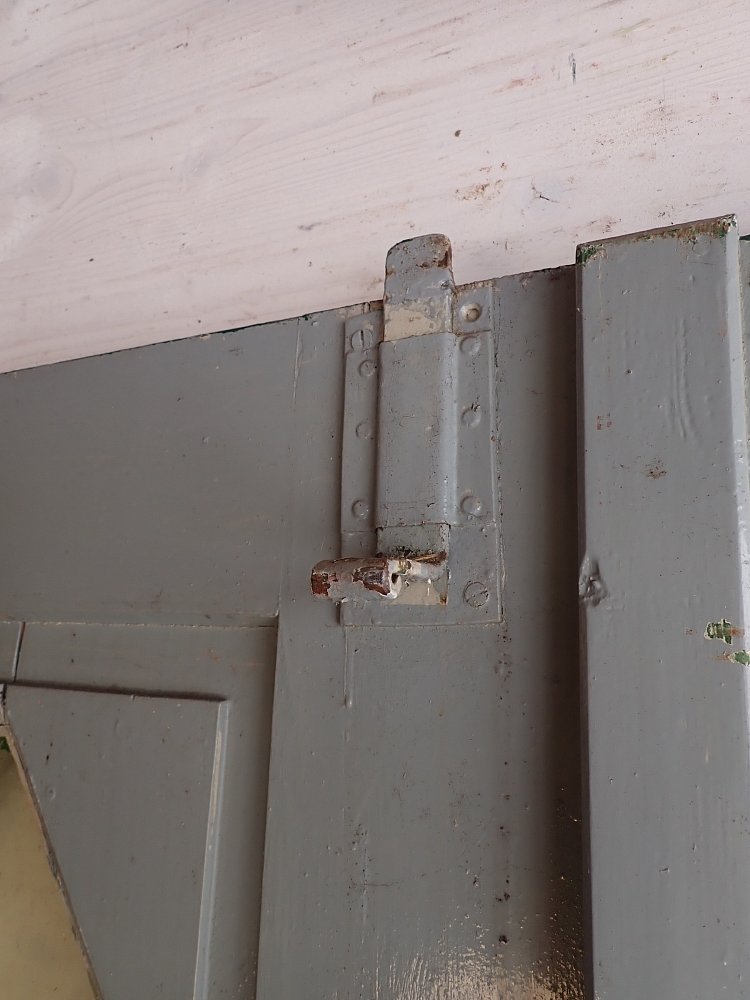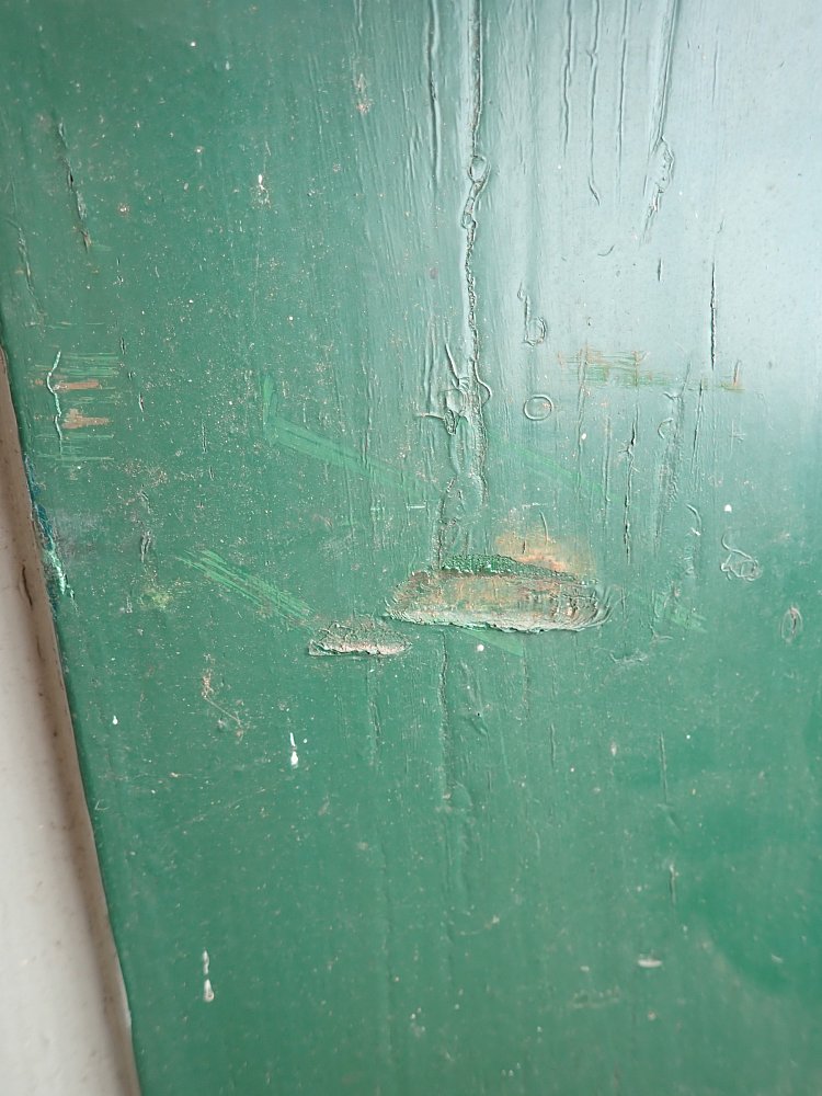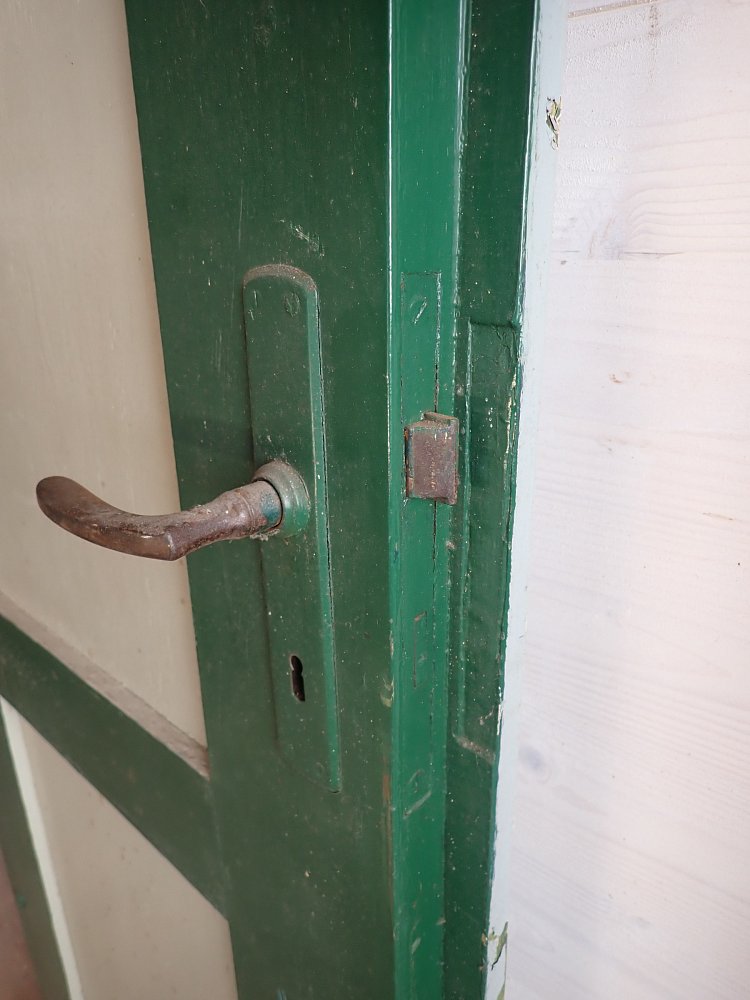 Insgesamt befindet sich die Tür in einem guten Bergezustand. Wer an der grünen Farbe auf der Außen- und der grau-blauen Farbe auf der Innenseite keinen Gefallen findet, kann die Tür ablaugen lassen und ist in der anschließenden Farbgestaltung komplett frei.
