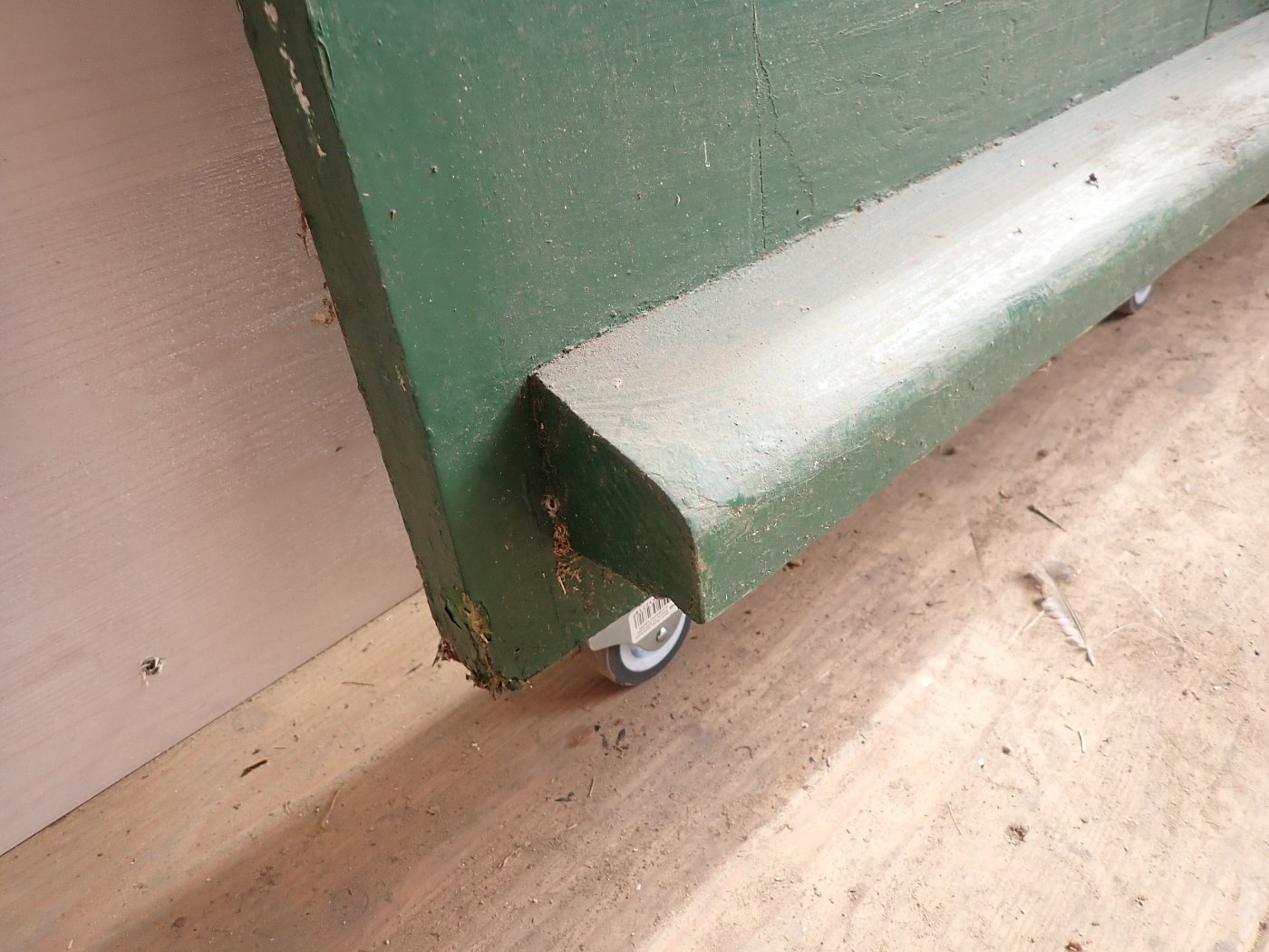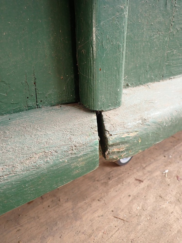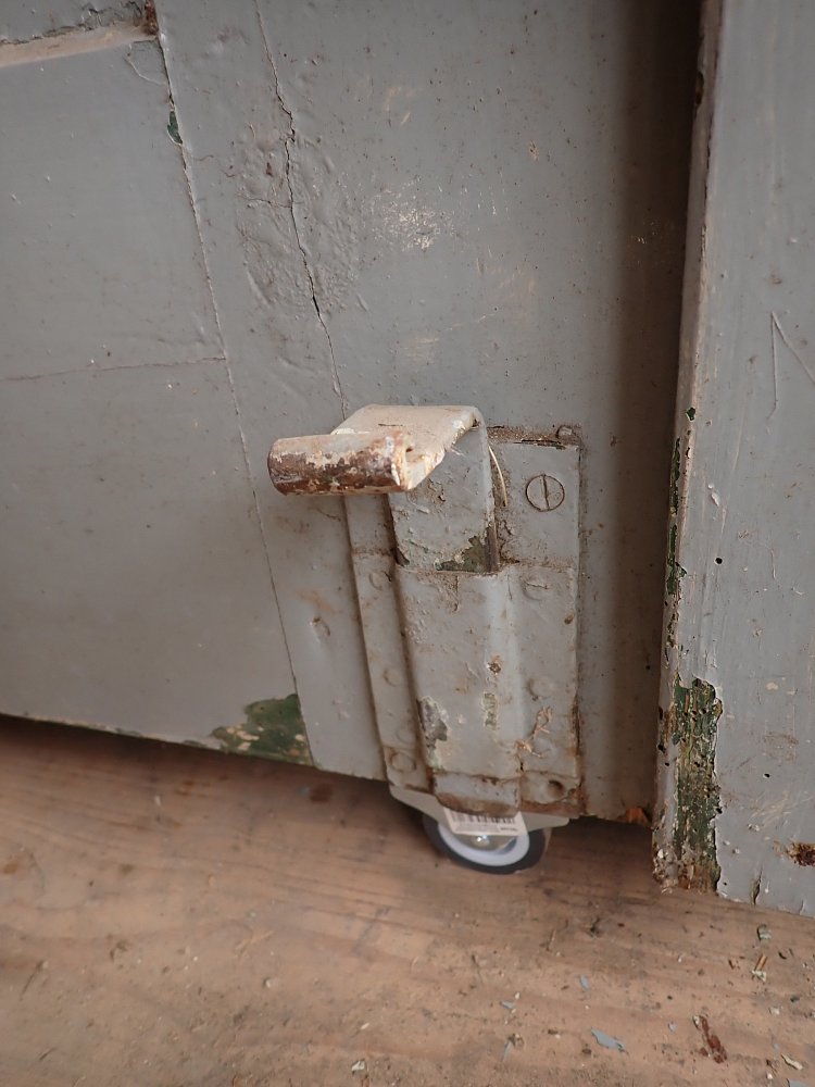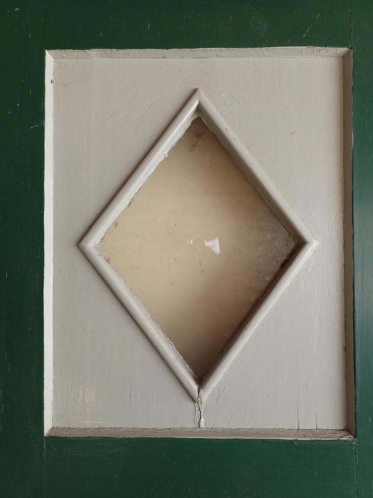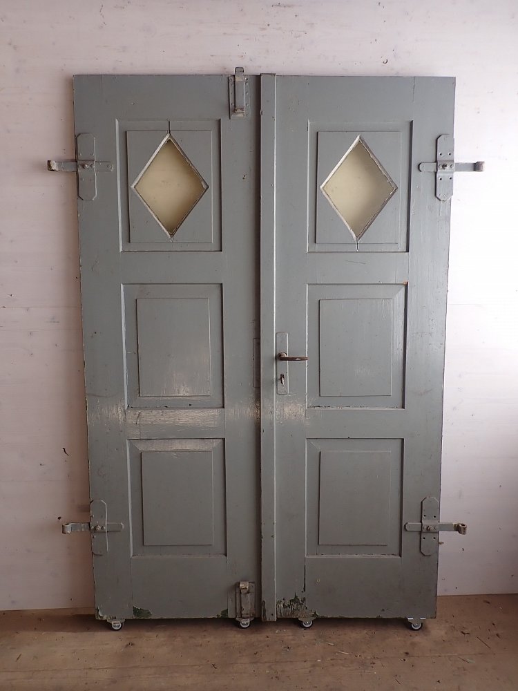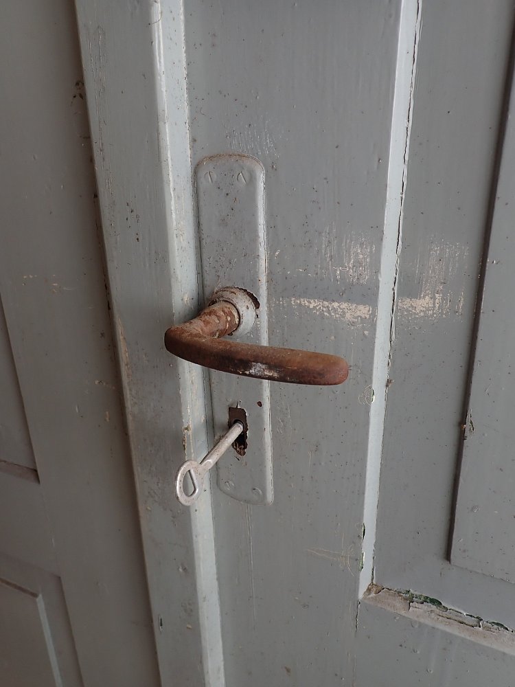 Insgesamt befindet sich die Tür in einem guten Bergezustand. Wer an der grünen Farbe auf der Außen- und der grau-blauen Farbe auf der Innenseite keinen Gefallen findet, kann die Tür ablaugen lassen und ist in der anschließenden Farbgestaltung komplett frei.
