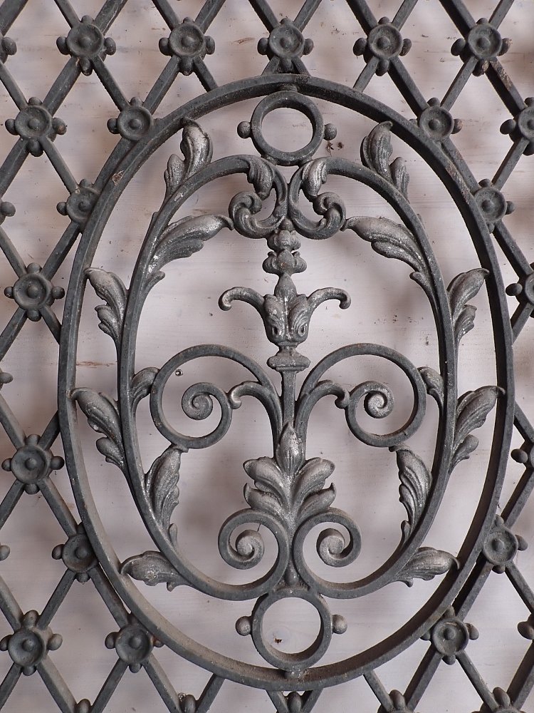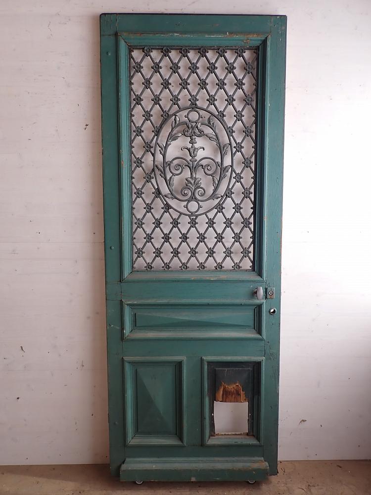 Die schwere Tür ist im unteren Bereich mit zwei kleinen und einer großen Querfüllung gearbeitet, die mit profilierten Leisten eingefasst sind. In der oberen Hälfte ist ein großes Fenstergitter aus Gusseisen eingebaut.