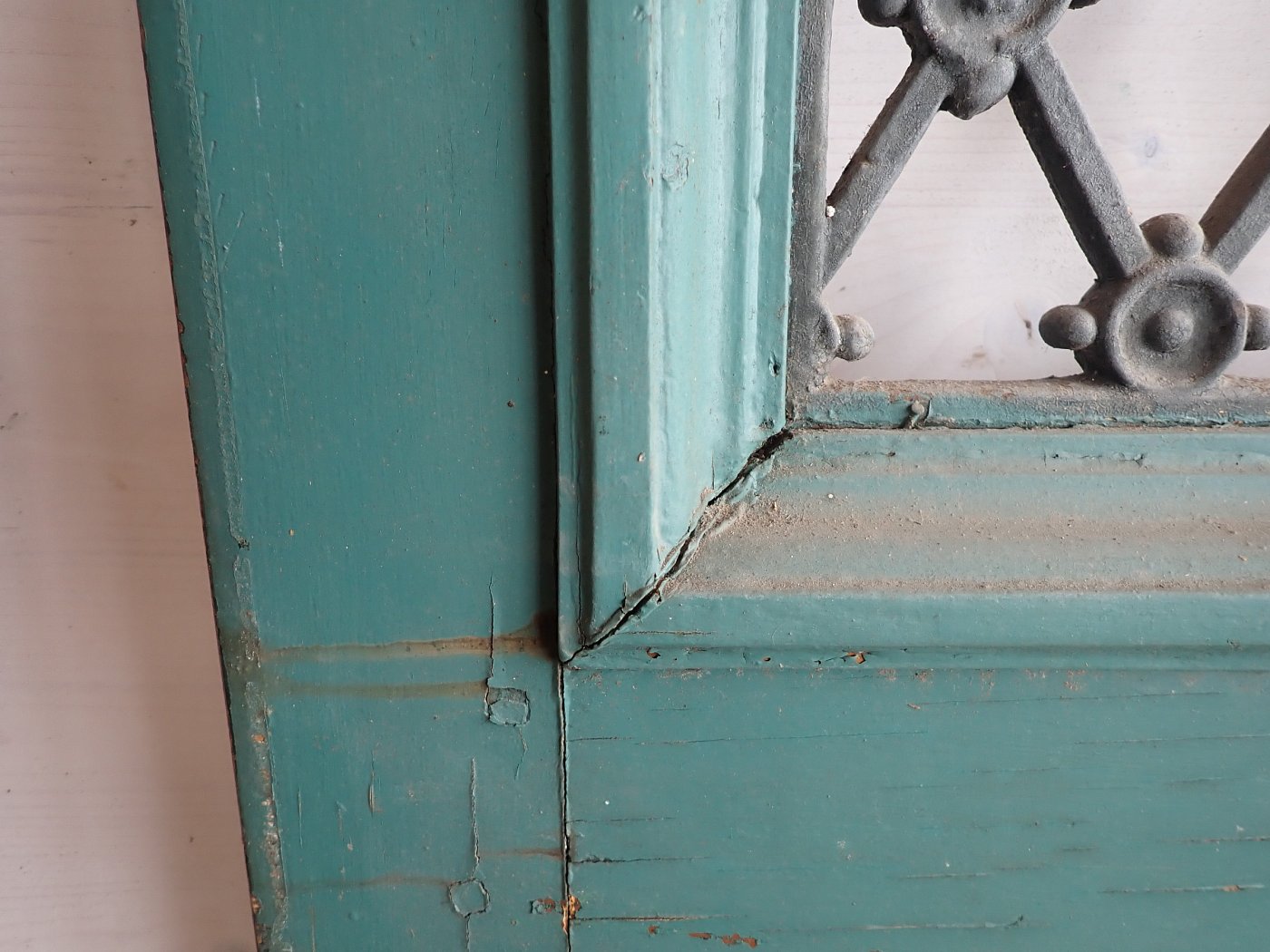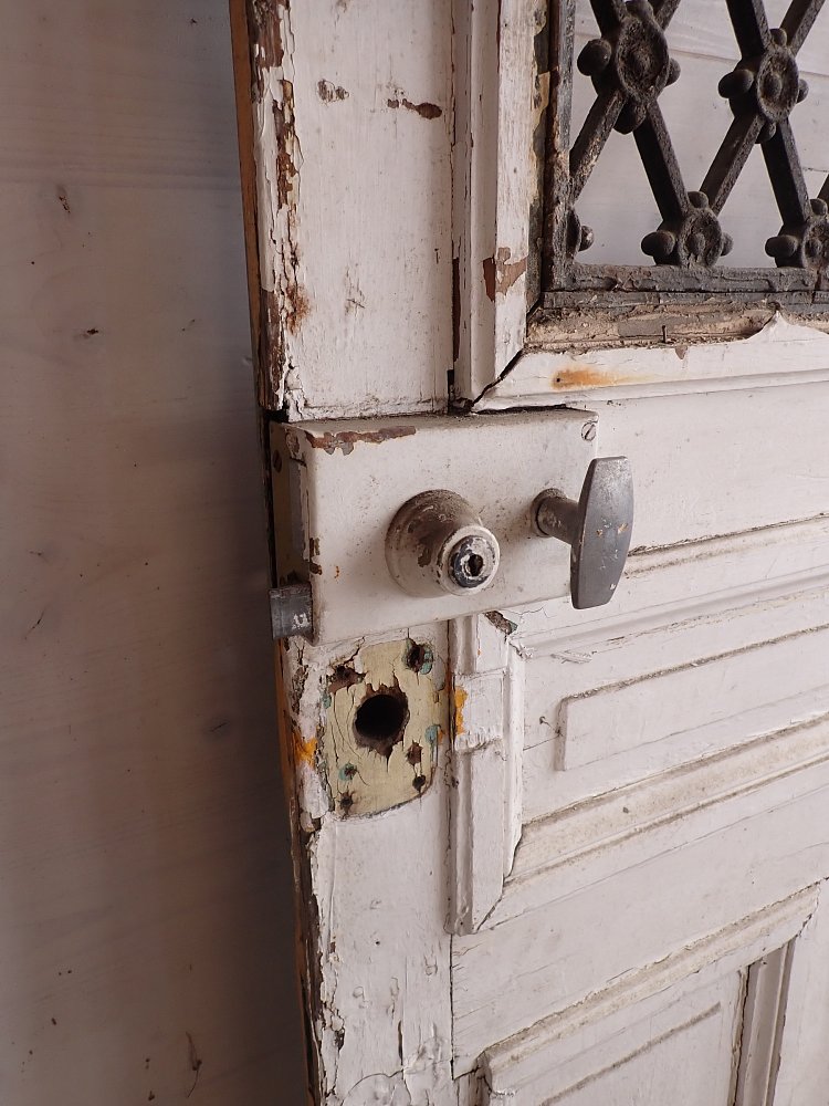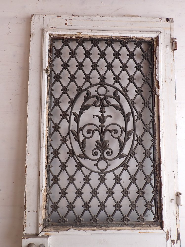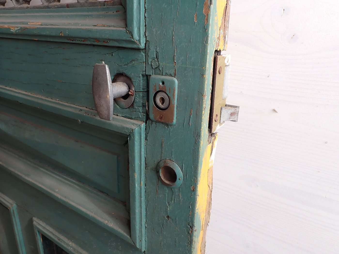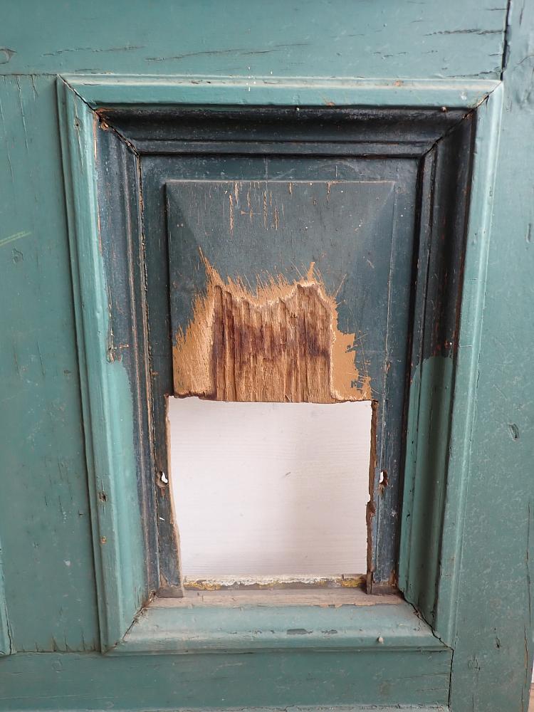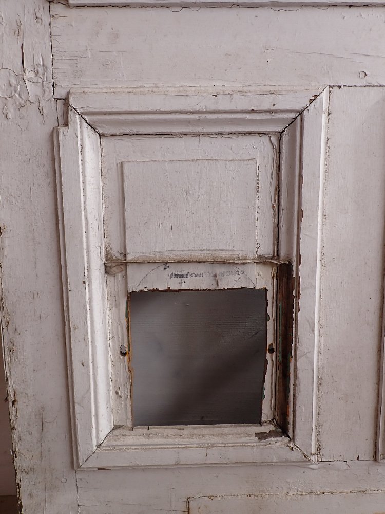 Insgesamt befindet sich die Tür in einem guten Bergezustand, auch wenn sie vor einem Wiedereinbau noch die eine oder andere Stunde an fachmännischer Zuwendung braucht. So muss beispielsweise eine der kleinen Füllungen ausgetauscht werden, da hier offensichtlich eine Katzenklappe eingebaut war. Aktuell fehlt auch eine Glasscheibe hinter dem Fenstergitter und eine passende Drückergarnitur.