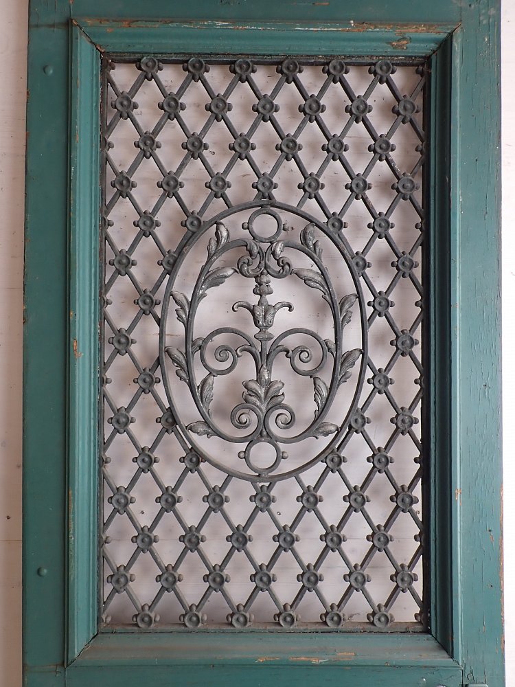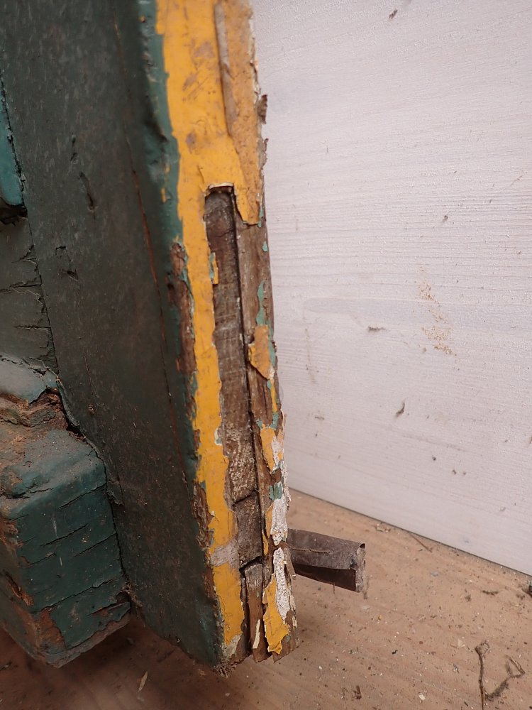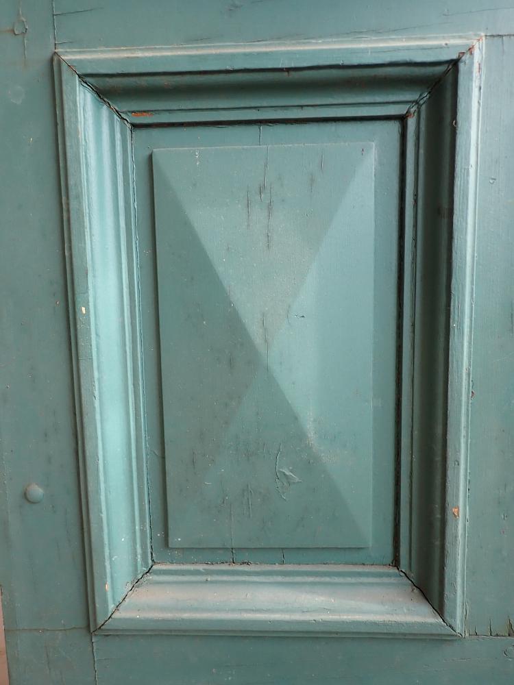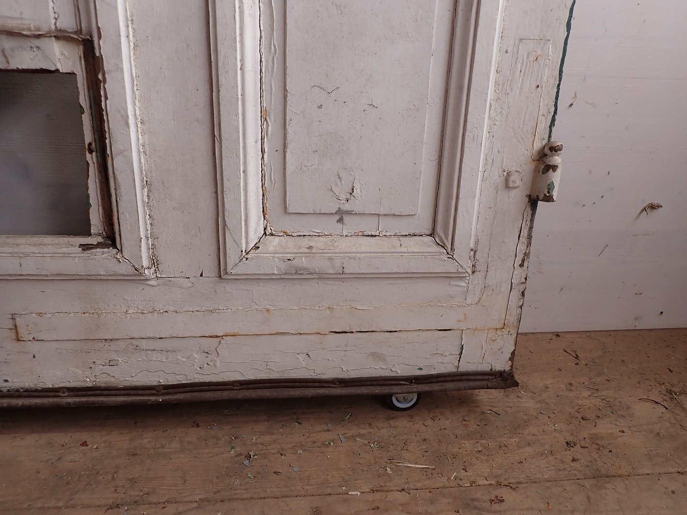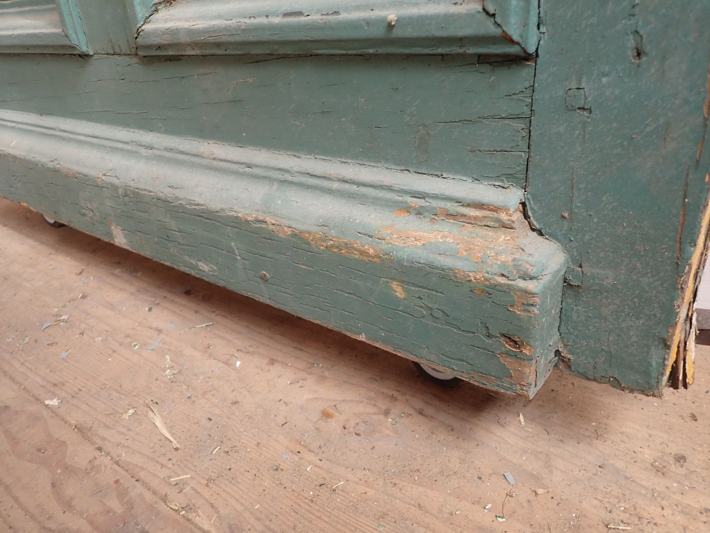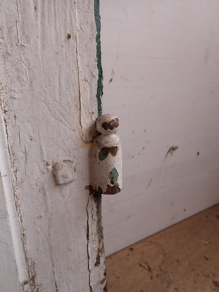 Insgesamt befindet sich die Tür in einem guten Bergezustand, auch wenn sie vor einem Wiedereinbau noch die eine oder andere Stunde an fachmännischer Zuwendung braucht. So muss beispielsweise eine der kleinen Füllungen ausgetauscht werden, da hier offensichtlich eine Katzenklappe eingebaut war. Aktuell fehlt auch eine Glasscheibe hinter dem Fenstergitter und eine passende Drückergarnitur.