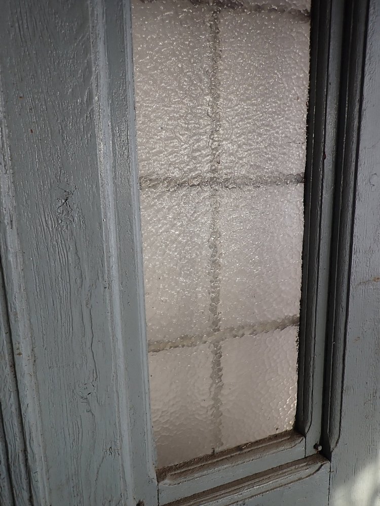 Wenn wir die Haustür in wenigen Worten beschreiben sollten, würden wir das folgenderweise machen: "Baustelle mit viel Potenzial", denn am Festflügel fehlen sowohl die Scheibe als auch das Fenstergitter, der Gehflügel hat zwar beides, aber komischerweise ist das Gitter auf der Innenseite angebracht.