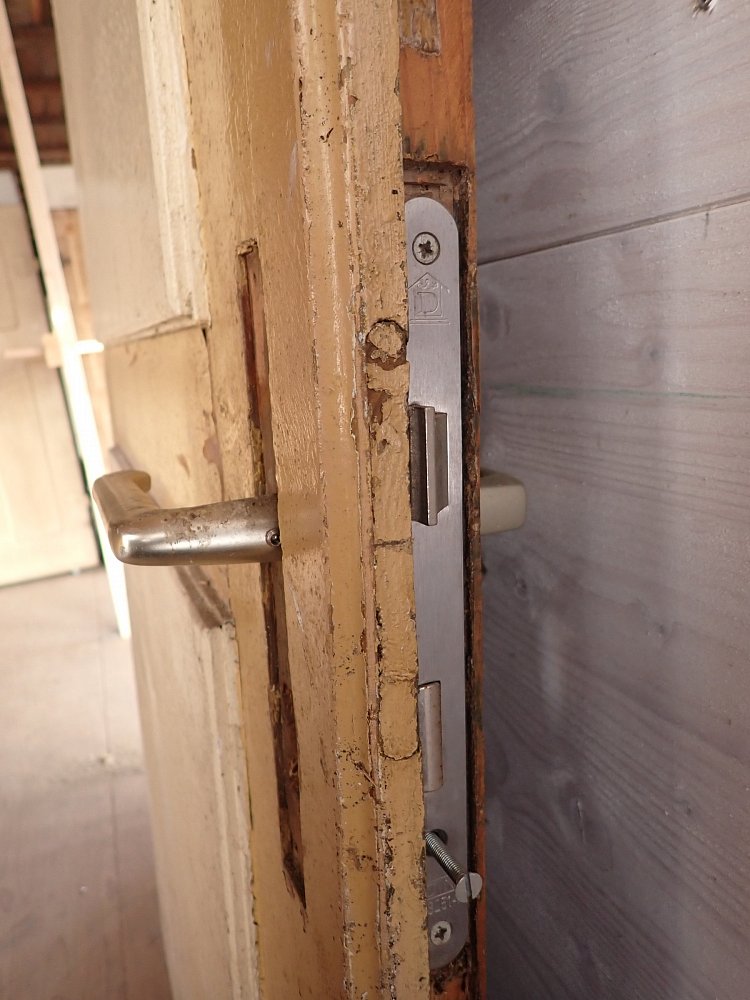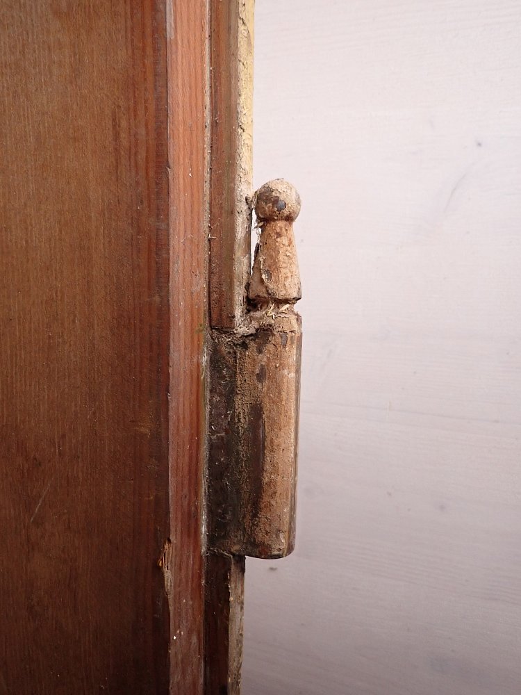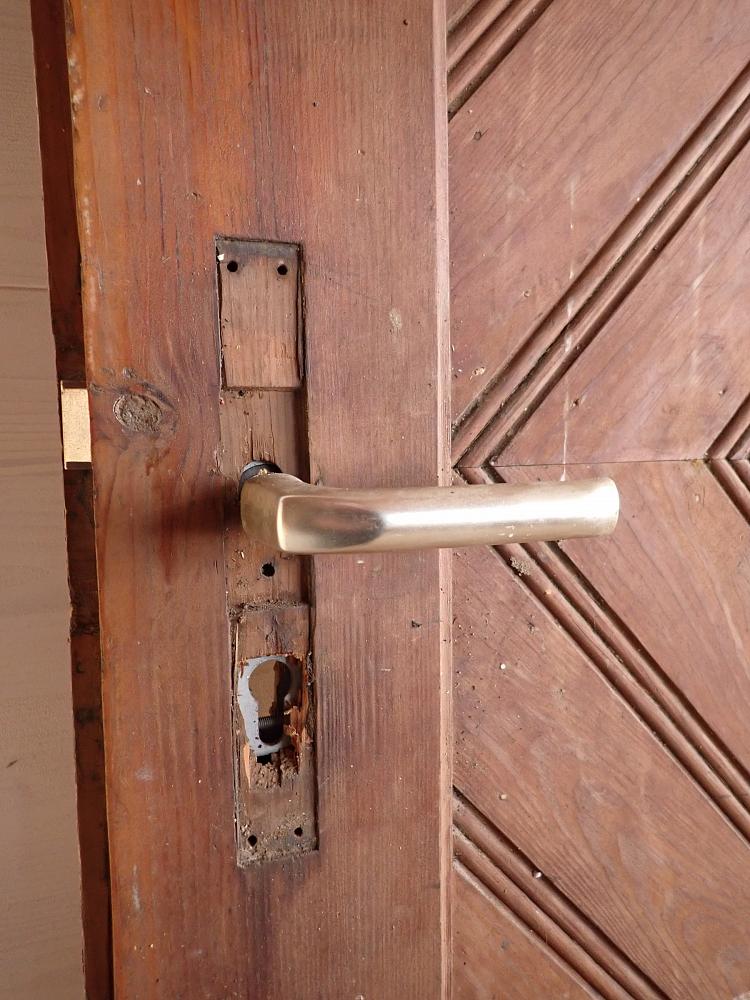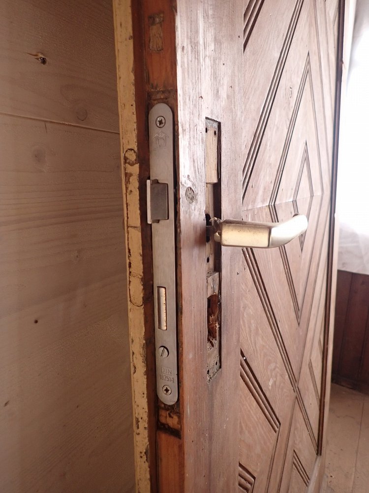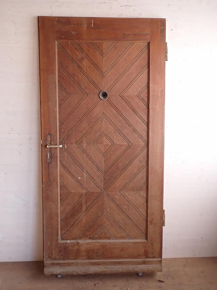 Die Haustür ist aus Weichholz gefertigt und mit rautenförmigen Füllungsmuster gestaltet. Auf der Vorderseite befindet sich ein Wetterschenkel und die Öffnung eines Türspions. Ebenfalls vorhanden sind die Klinken, allerdings ohne Türschild. Aber da lässt sich etwas Passendes sicherlich in unserem Fundus für Türzubehör finden. Die Rückseite ist typischerweise schlicht gehalten und besitzt ebenfalls die Öffnung für den Türspion, aber auch ein Schlüssellochblech für eine Türkette.