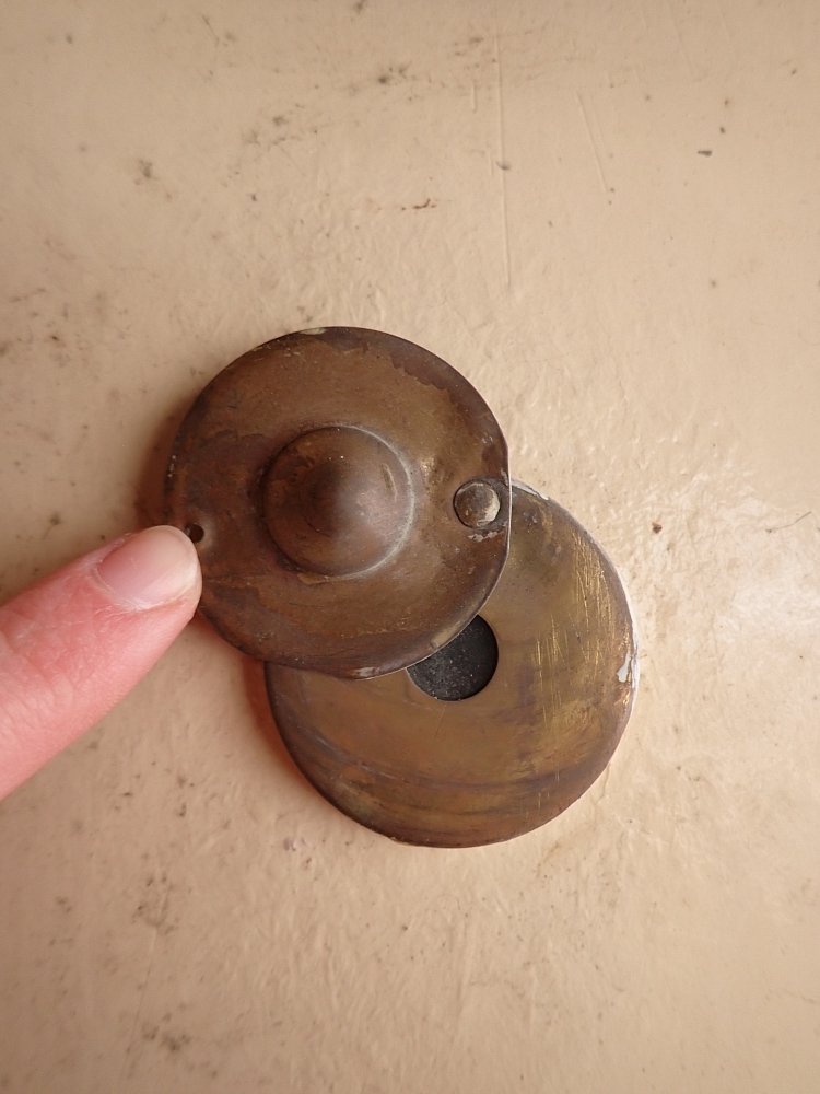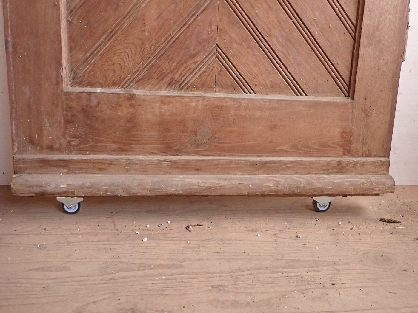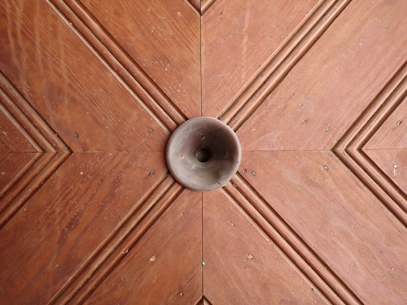 Die Haustür ist aus Weichholz gefertigt und mit rautenförmigen Füllungsmuster gestaltet. Auf der Vorderseite befindet sich ein Wetterschenkel und die Öffnung eines Türspions. Ebenfalls vorhanden sind die Klinken, allerdings ohne Türschild. Aber da lässt sich etwas Passendes sicherlich in unserem Fundus für Türzubehör finden. Die Rückseite ist typischerweise schlicht gehalten und besitzt ebenfalls die Öffnung für den Türspion, aber auch ein Schlüssellochblech für eine Türkette.