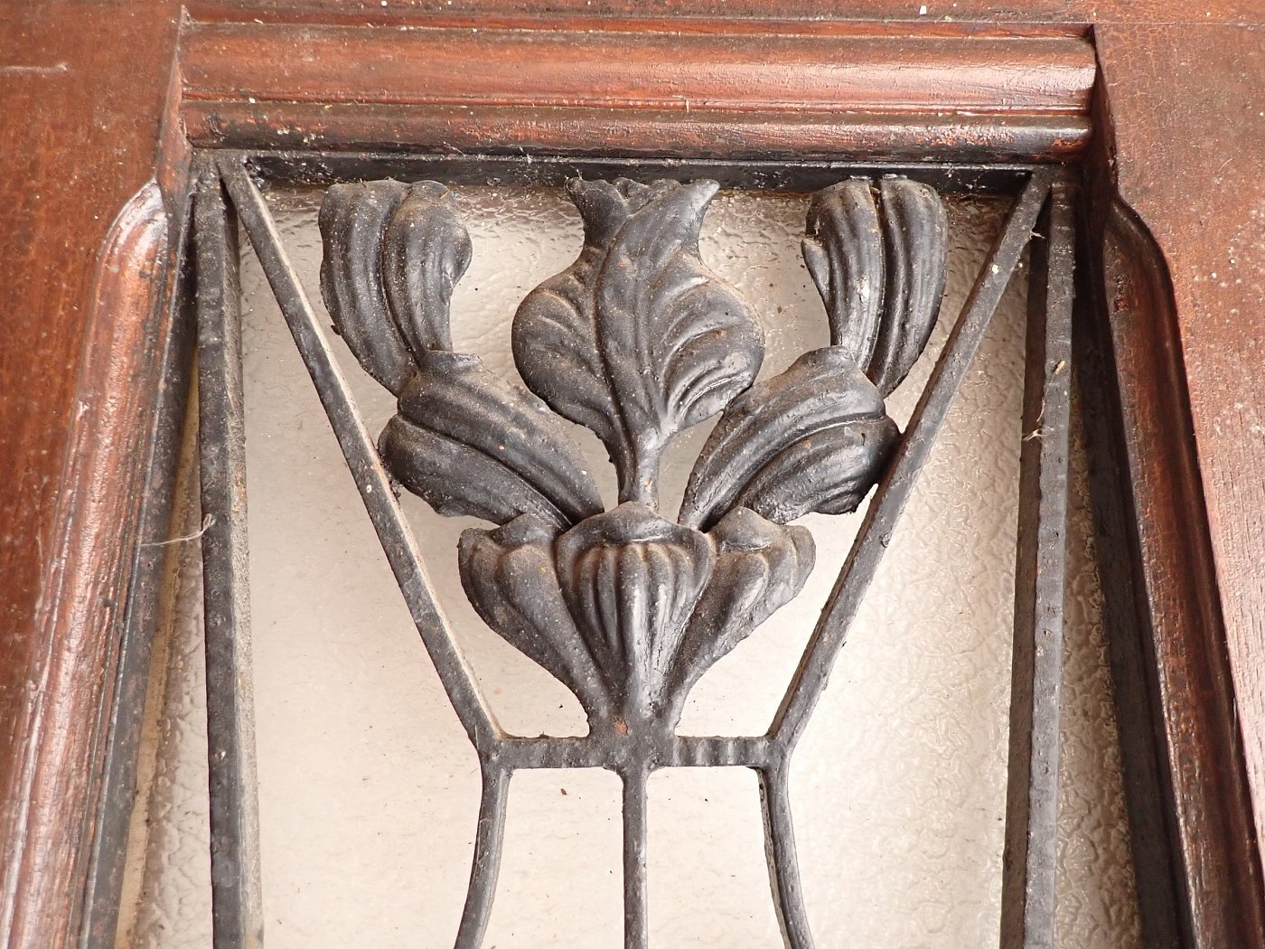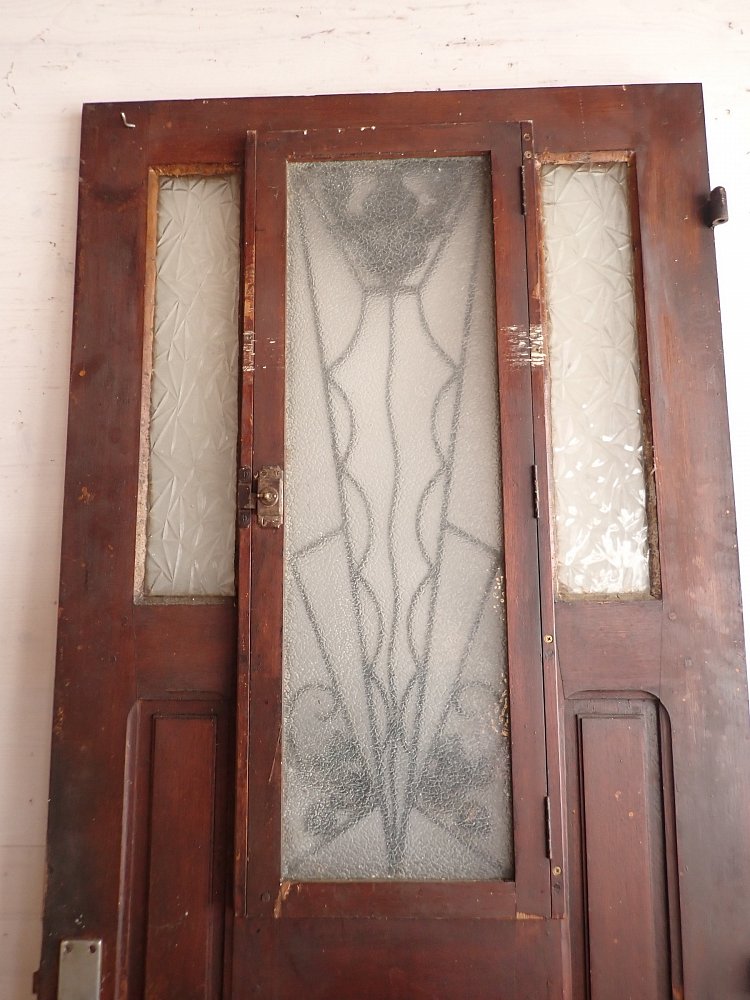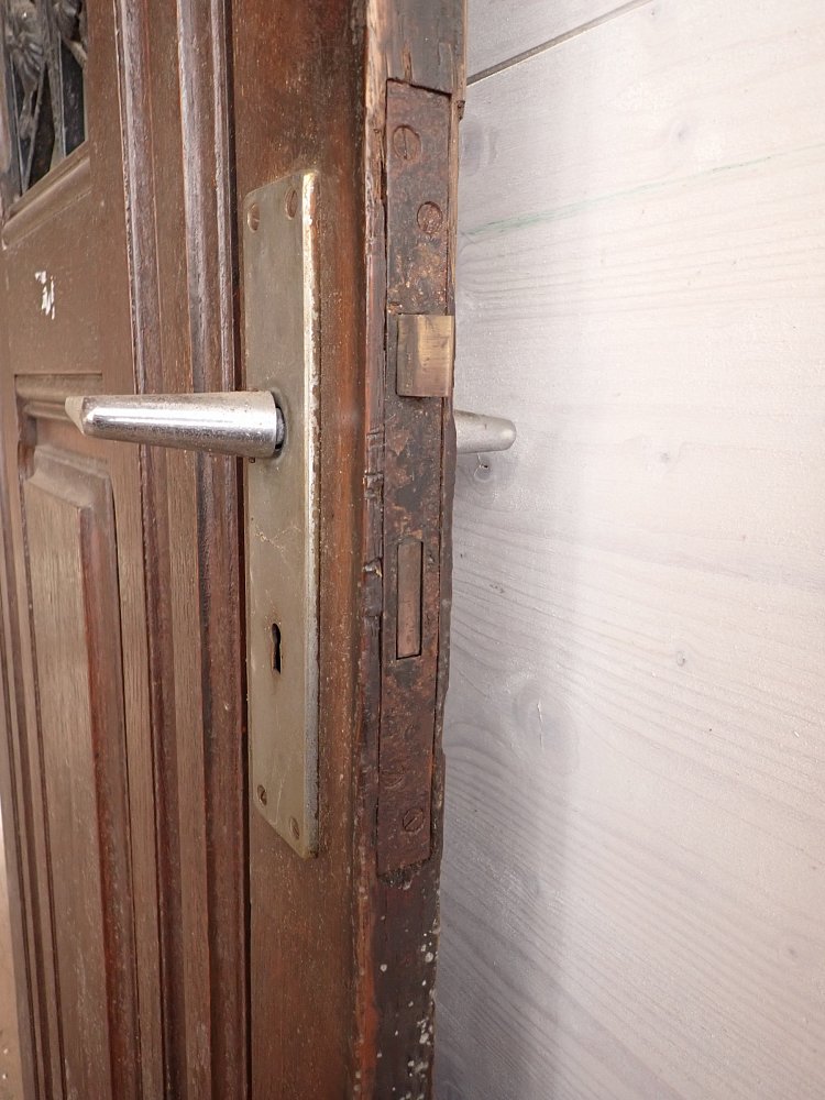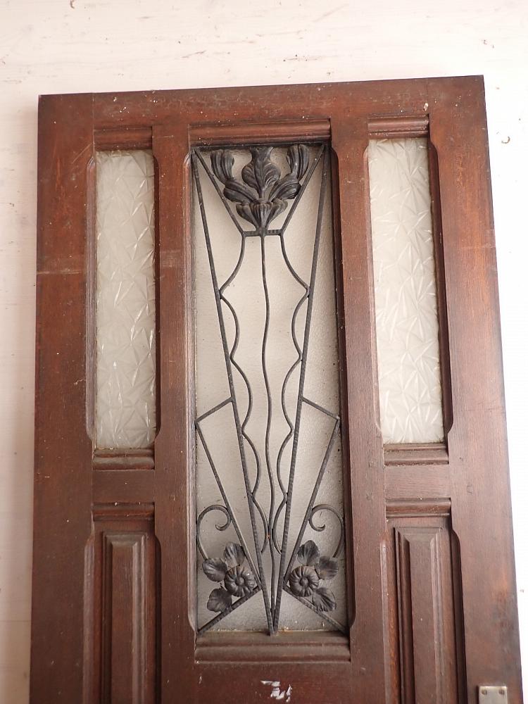 Die Haustür aus Eiche ist im Art Déco Stil gestaltet. Verziertes Gitterelement mit geometrischen sowie geschwungenen Elementen. Hinterlegt ist das schmiedeeiserne Gitter mit Strukturglas. Die beiden Lichtöffnungen daneben sind ebenfalls Strukturglas, aber mit einem anderen Muster. Das Fenster mit Gitter in der Mitte lässt sich öffnen, allerdings müsste die Schließfunktion repariert werden. An der Tür sind Griffe sowie Schloss vorhanden.