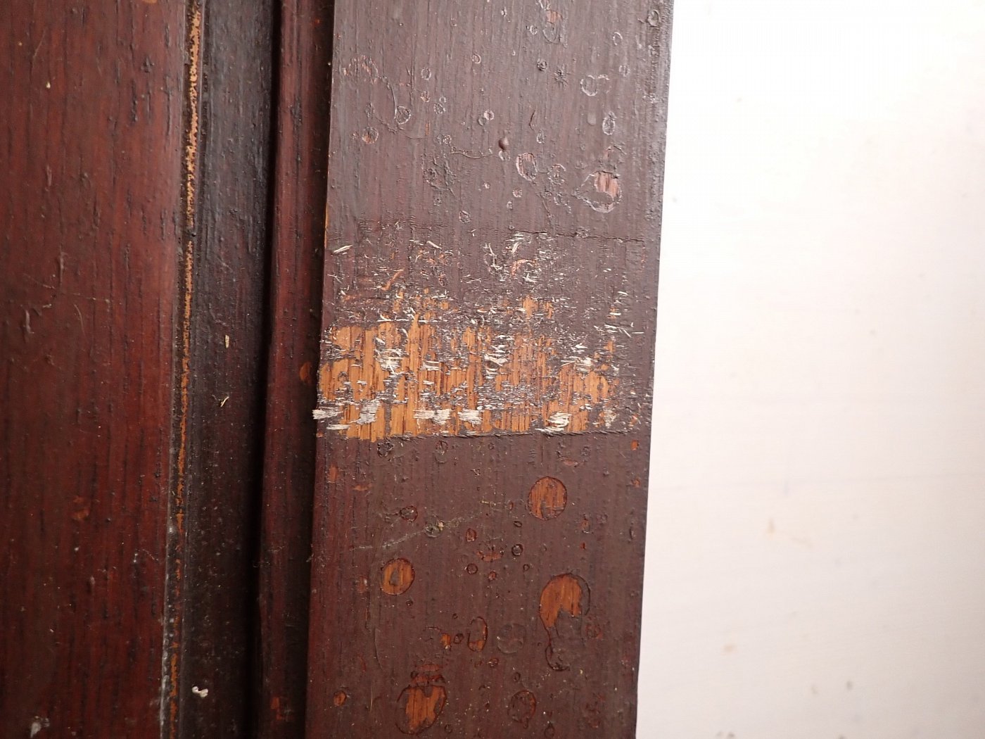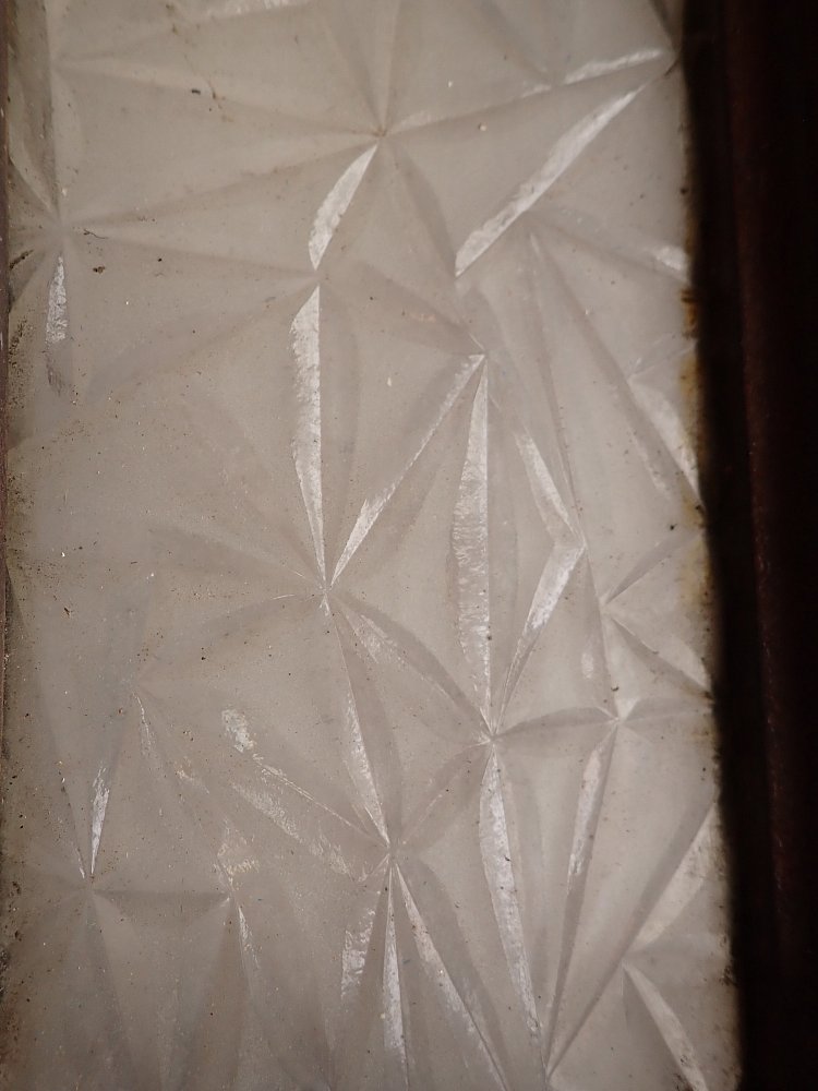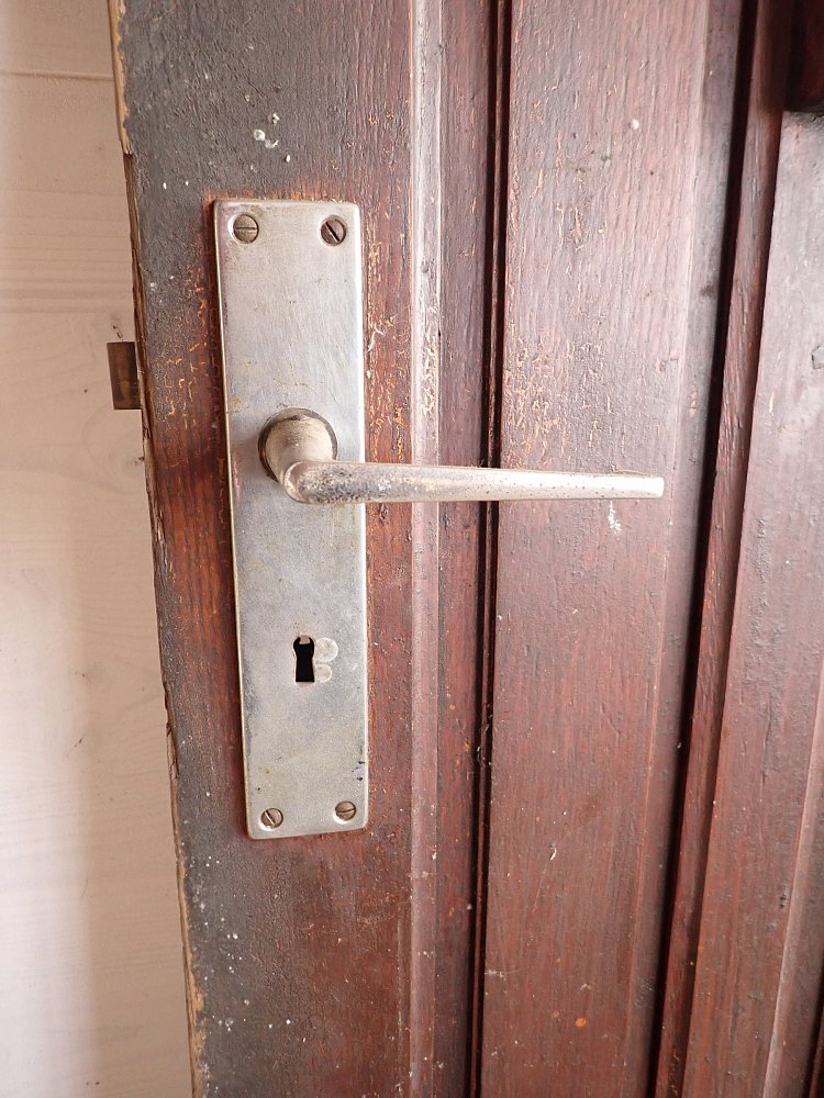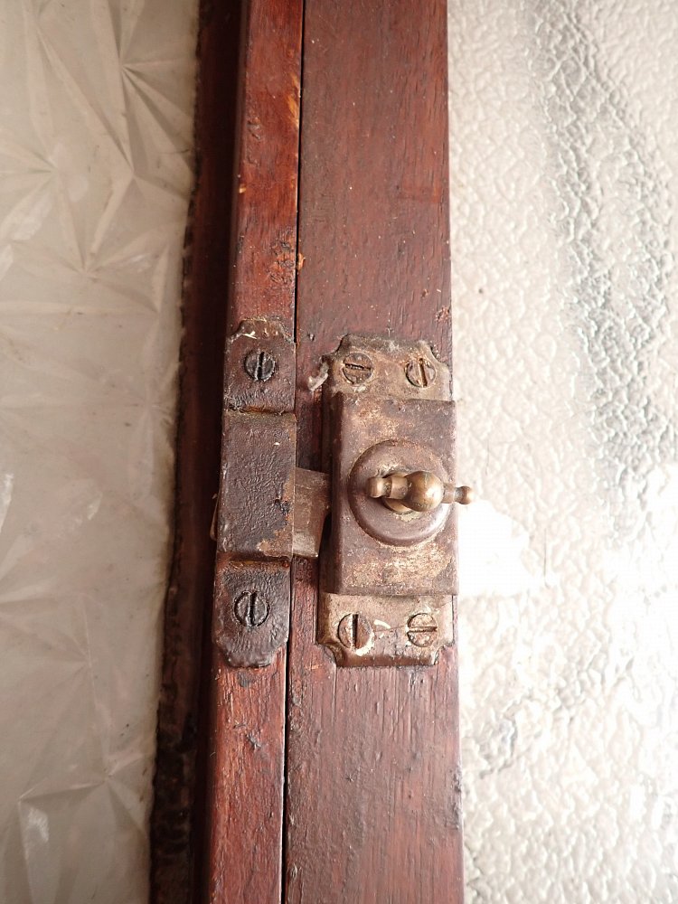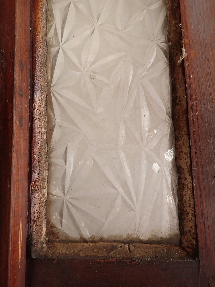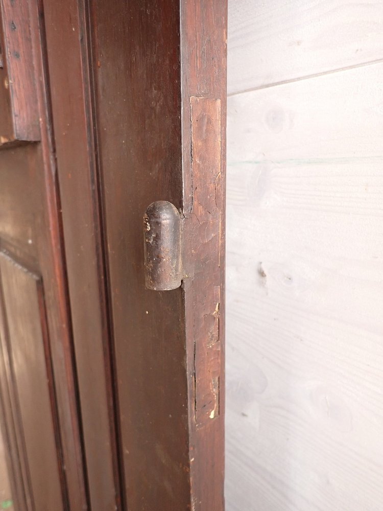 Die Tür ist in einem altersbedingten Zustand. Die Fugen an den Scheiben sind teilweise spröde und müssten erneuert werden und die Oberfläche mit dem Lack bräuchte auch eine Aufarbeitung, aber keine großen Schäden.