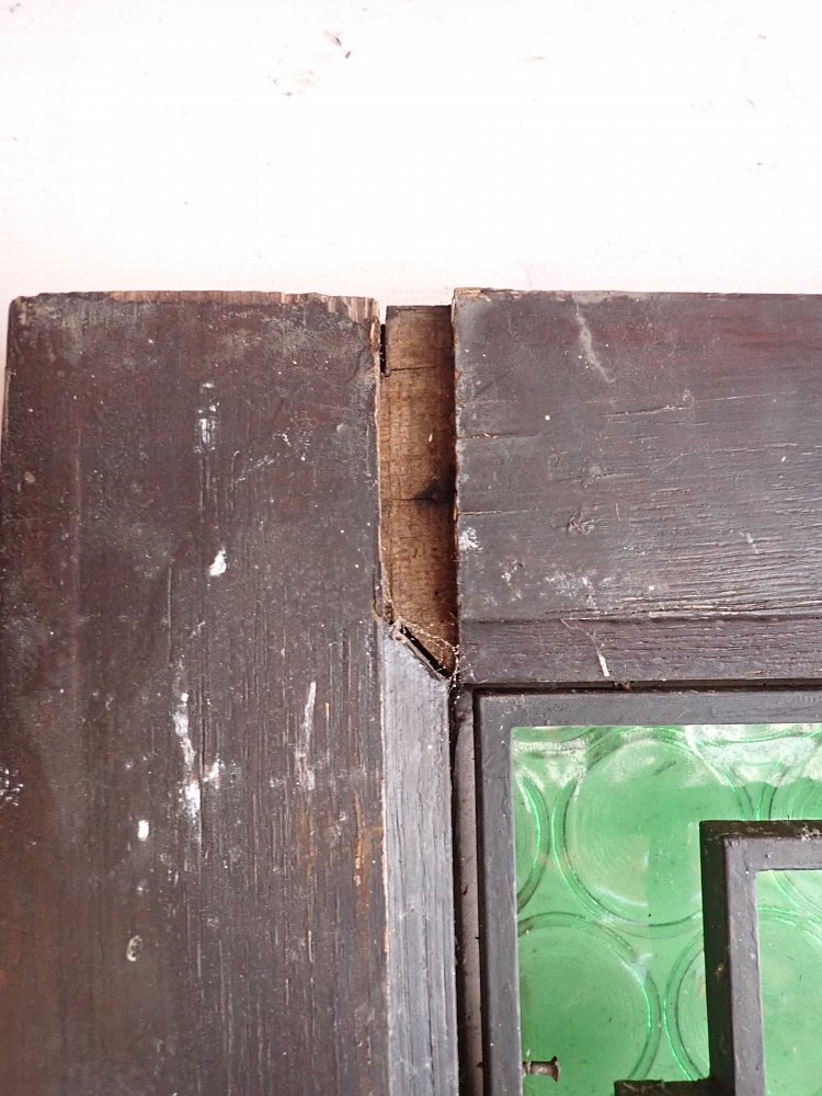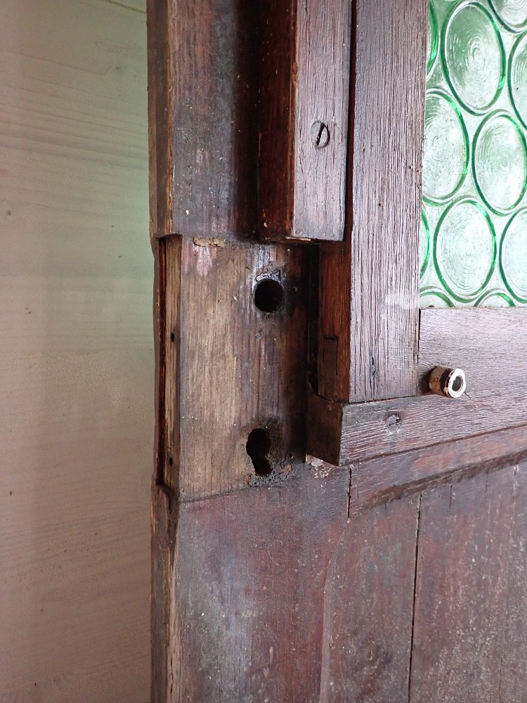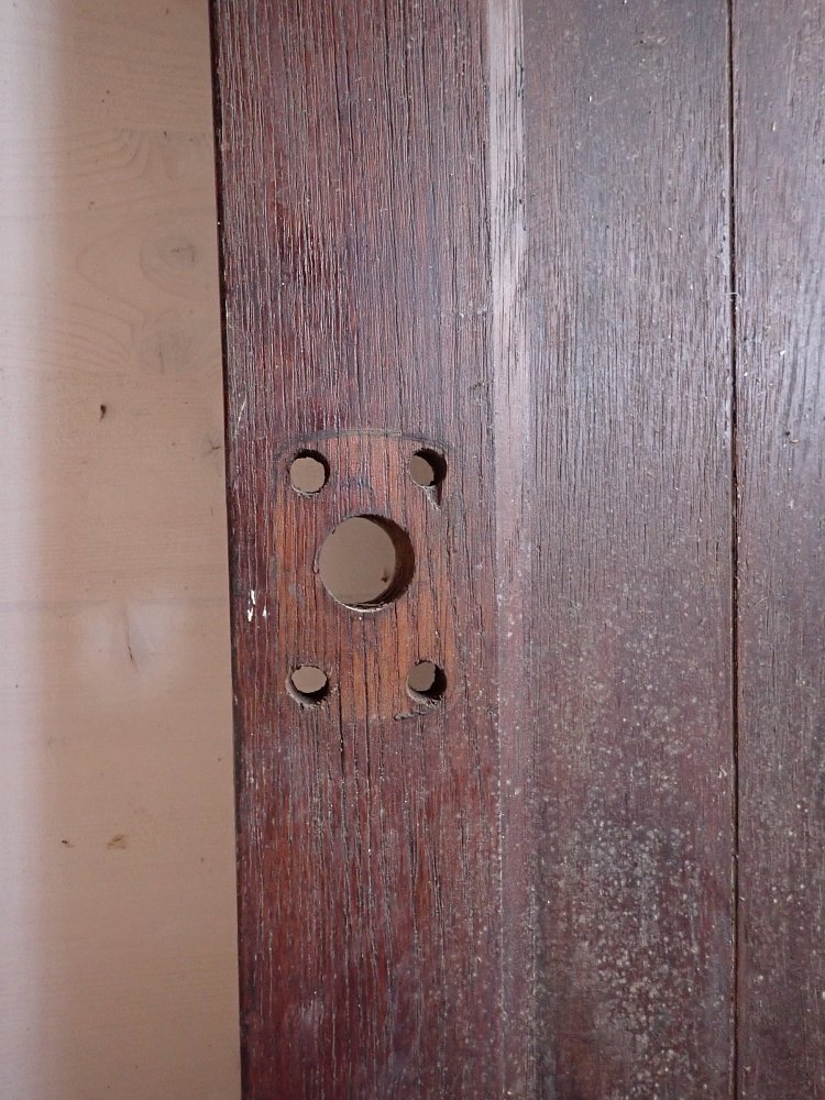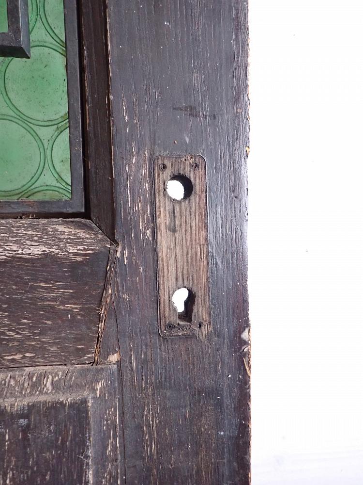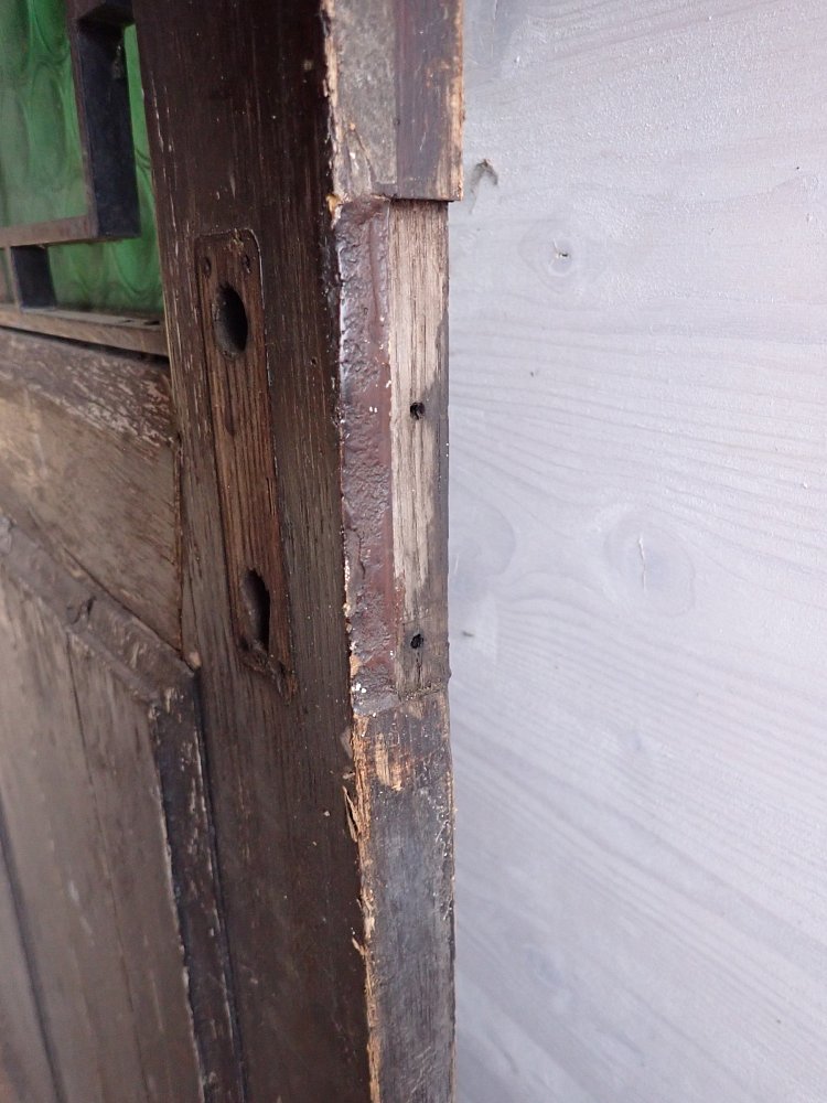 An der Tür fehlen die Klinken und das Schloss, wofür sich sicherlich etwas Passendes in unserem Lager für Türzubehör finden lässt. Die Tür befindet sich in einem ihrem Alter entsprechenden Zustand. Der Lack blättert ab und auf der Oberfläche und an den Kanten sind kleine Macken oder vereinzelt Risse zu erkennen.