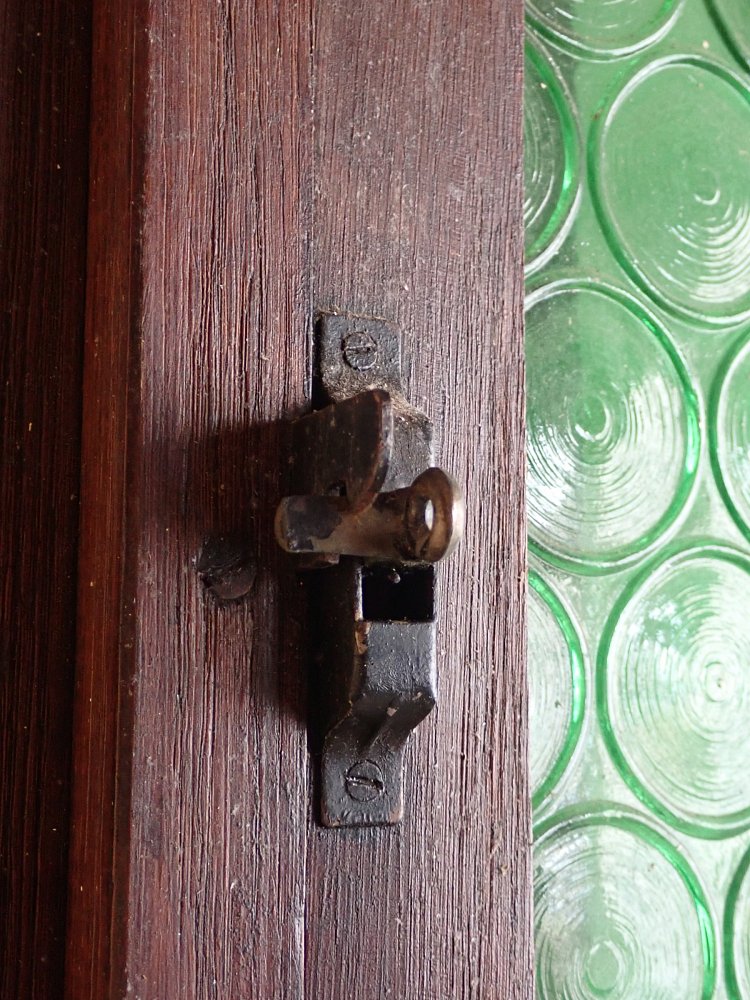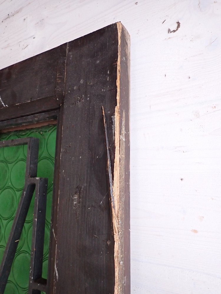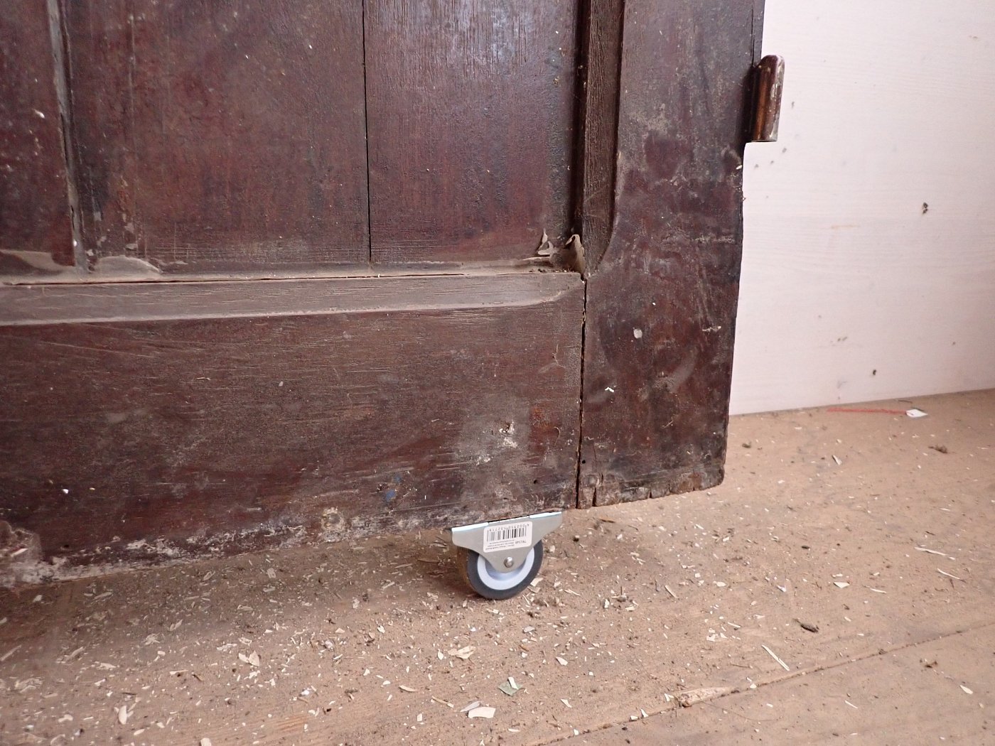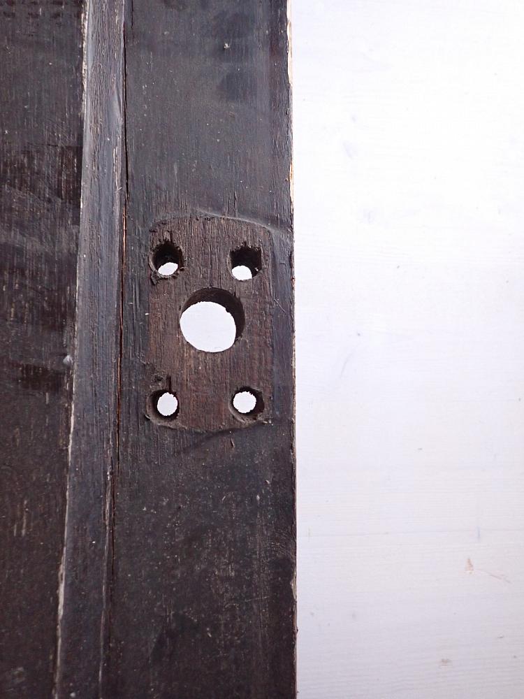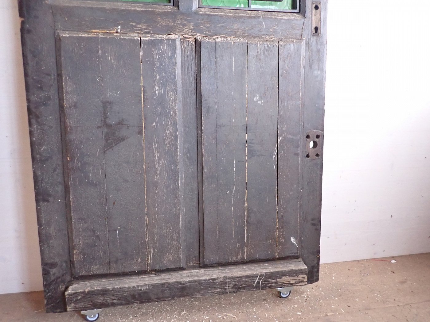 An der Tür fehlen die Klinken und das Schloss, wofür sich sicherlich etwas Passendes in unserem Lager für Türzubehör finden lässt. Die Tür befindet sich in einem ihrem Alter entsprechenden Zustand. Der Lack blättert ab und auf der Oberfläche und an den Kanten sind kleine Macken oder vereinzelt Risse zu erkennen.